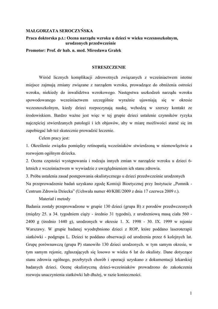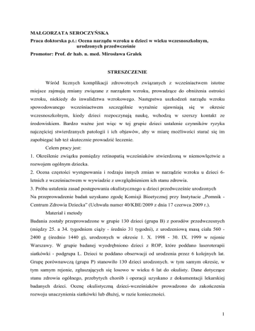 MAŁGORZATA SEROCZYŃSKA Praca doktorska p.t.: Ocena narządu wzroku u dzieci w wieku wczesnoszkolnym, urodzonych przedwcześnie Promotor: Prof. dr hab. n. med. Mirosława Grałek STRESZCZENIE Wśród licznych komplikacji zdrowotnych związanych z wcześniactwem istotne miejsce zajmują zmiany związane z narządem wzroku, prowadzące do obniŜenia ostrości wzroku, niekiedy do inwalidztwa wzrokowego. Następstwa uszkodzeń narządu wzroku spowodowanego wcześniactwem szczególnie wyraźnie ujawniają się w okresie wczesnoszkolnym, kiedy dzieci rozpoczynają naukę, wchodzą w szerszy kontakt ze środowiskiem. Bardzo waŜne jest więc w tej grupie dzieci ustalenie czynników ryzyka najczęściej stwierdzanych patologii i ich objawów, aby w miarę moŜliwości starać się im zapobiegać lub teŜ skutecznie prowadzić leczenie. Celem pracy jest: 1. Określenie związku pomiędzy retinopatią wcześniaków stwierdzoną w niemowlęctwie a rozwojem ogólnym dziecka. 2. Ocena częstości występowania i rodzaju innych zmian w narządzie wzroku u dzieci 6letnich z wcześniactwem w wywiadzie z uwzględnieniem ich stanu zdrowia. 3. Próba ustalenia zasad postępowania okulistycznego u dzieci przedwcześnie urodzonych Na przeprowadzenie badań uzyskano zgodę Komisji Bioetycznej przy Instytucie „Pomnik Centrum Zdrowia Dziecka” (Uchwała numer 40/KBE/2009 z dnia 17 czerwca 2009 r.). Materiał i metody Badania zostały przeprowadzone w grupie 130 dzieci (grupa B) z porodów przedwczesnych (między 25. a 34. tygodniem ciąŜy - średnio 31 tygodni), z urodzeniową masą ciała 560 2400 g (średnio 1440 g), urodzonych w okresie 1. X. 1998 - 30. IX. 1999 w rejonie Warszawy. W grupie badanej wyodrębniono dzieci z ROP, które poddano laseroterapii siatkówki - podgrupa L. Dzieci te poddano obserwacji od urodzenia przez 6 kolejnych lat. Grupę porównawczą (grupa P) stanowiło 130 dzieci urodzonych. w tym samym okresie, w tym samym rejonie, zgłaszających się losowo w wieku 6 lat do okulisty. Dane dotyczące stanu zdrowia ogólnego, przebytych chorób i operacji uzyskano z dokumentacji lekarskiej badanych dzieci. Ocenę okulistyczną dzieci-wcześniaków prowadzono do zakończenia rozwoju unaczynienia siatkówki lub dłuŜej, w razie konieczności. 1 Kolejne badania wykonywano co rok do ukończenia 6 lat Ŝycia. Obejmowały one określenie ostrości wzroku, stanu refrakcji, ocenę przedniego i tylnego odcinka, tonometrię, ruchomość gałek ocznych, ocenę strabologiczną. W razie wskazań wykonywano inne badania dodatkowe. Wyniki Retinopatia dotyczyła 24,62% oczu badanej grupy wcześniaków. Wśród dzieci z rozpoznaną retinopatią, u 9 niemowląt z 3. stadium choroby wykonano fotokoagulację laserową siatkówki. Ostrość wzroku. Łącznie 102 (89,48%) dzieci 6-letnich z wcześniactwem w wywiadzie (196 oczu - 85,98%) widziało prawidłowo (tzn. miało ostrość wzroku mieszczącą się w przedziale pomiędzy 1,0 a 0,8). Odpowiednio w grupie porównawczej łącznie 124 (96,87%) sześciolatków (235 oczu - 91,79%) widziało prawidłowo. W pozostałych przedziałach ostrości wzroku, grupa dzieci sześcioletnich z wcześniactwem w wywiadzie wypada gorzej w porównaniu z analogiczną grupą równolatków urodzonych o czasie. Refrakcja. Rozkład wad refrakcji w 260 oczach kaŜdej z ocenianych grup był róŜny. Niemiarowość stwierdzono w grupie badanej w 36,54% oczu, w grupie porównawczej w 68,08%. Stwierdzono wyraźnie przesunięcie wartości refrakcji w stronę krótkowzroczności w badanej grupie dzieci urodzonych przedwcześnie. U tych dzieci krótkowzroczność dotyczyła 10,39% oczu, a w porównawczej 8,07%. Krótkowzroczność w wieku 6 lat była powodem noszenia okularów przez dzieci urodzone przedwcześnie ponad dwukrotnie częściej (11,54%), niŜ przez dzieci urodzone o czasie (4,61%). Nadwzroczność w grupie badanej stwierdzono w 26,15% oczu a w porównawczej w 60%. Najwięcej oczu wcześniaków stanowiły oczy miarowe, podczas gdy w grupie urodzonej o czasie najbardziej liczne były oczy z małą nadwzrocznością. Odnośnie dzieci z ROP w wywiadzie, 1. stadium ROP lokuje się w przedziale nadwzroczności małej, podobnie, jak grupa porównawcza. Natomiast u dzieci, które przebyły 2. stadium ROP przewaŜa miarowość, tak samo jest u wcześniaków po 3. stadium ROP, których refrakcja jeszcze bardziej przesuwa się w stronę krótkowzroczności. Dno oczu. Prawidłowy obraz dna oka miało w wieku 6 lat 107 (82,31%) wcześniaków i 127 (97,69%) dzieci z grupy porównawczej. RóŜnice w obrazie dna w obu grupach miały cechy znamienności statystycznej. Były wynikiem zmian po laseroterapii i zaniku nerwu wzrokowego na skutek uszkodzeń neurologicznych okresu perinatalnego. 2 Ustawienie gałek ocznych. W wieku 6 lat ustawienie gałek nieprawidłowe bez korekcji miało 14,61% grupy badanej i 19,23% grupy porównawczej. W tym zbieŜne ustawienie miało 12,31% grupy badanej i 13,85% grupy porównawczej (w 0,77% z komponentą skośną). RozbieŜne ustawienie miało natomiast 2,31% dzieci z grupy badanej i 5,38% grupy porównawczej. Nieprawidłowy Cover-test bez korekcji miało 10,77% dzieci z grupy badanej i 16,15% grupy porównawczej. Natomiast Cover-test z korekcją nie był prawidłowy u 3,85% grupy badanej i 6,15% grupy porównawczej. Ocenie poddano takŜe wyniki badań okulistycznych na tle zaburzeń perinatologiczno pediatrycznych w okresie od urodzenia do ukończenia 6 lat, następstwa problemów okulistycznych we wczesnym dzieciństwie, ich rokowanie i znaczenie w Ŝyciu dziecka. RóŜnorodne problemy neurologiczne dotyczyły ponad dwunastokrotnie częściej grupy B 29,23%, prawie co trzeciego dziecka z badanej grupy wcześniaków, natomiast tylko 2,31% grupy porównawczej. Istniały zaleŜności statystycznie znamienne pomiędzy wcześniactwem i czynnością narządu wzroku, a takŜe rozwojem ogólnym dziecka - poziom istotności p <0,05. Wnioski 1. Istnieje znacznie zwi