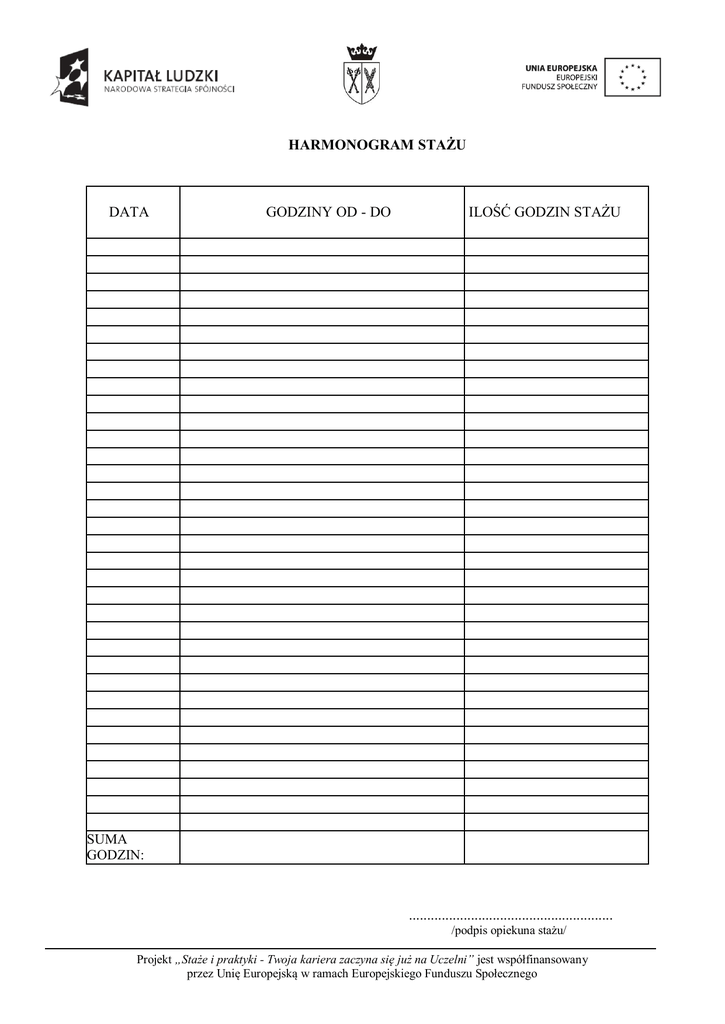 HARMONOGRAM STAŻU DATA GODZINY OD - DO ILOŚĆ GODZIN STAŻU SUMA GODZIN: ........................................................ /podpis opiekuna stażu/ Projekt „Staże i praktyki - Twoja kariera zaczyna się już na Uczelni” jest współfinansowany przez Unię Europejską w ramach Europejskiego Funduszu Społecznego
