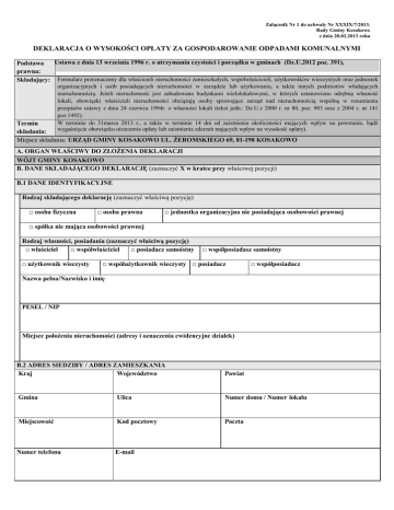 Załącznik Nr 1 do uchwały Nr XXXIX/7/2013. Rady Gminy Kosakowo z dnia 28.02.2013 roku DEKLARACJA O WYSOKOŚCI OPŁATY ZA GOSPODAROWANIE ODPADAMI KOMUNALNYMI Ustawa z dnia 13 września 1996 r. o utrzymaniu czystości i porządku w gminach (Dz.U.2012 poz. 391), Podstawa prawna: Składający: Formularz przeznaczony dla właścicieli nieruchomości zamieszkałych, współwłaścicieli, użytkowników wieczystych oraz jednostek organizacyjnych i osób posiadających nieruchomości w zarządzie lub użytkowaniu, a także innych podmiotów władających nieruchomością. Jeżeli nieruchomość jest zabudowana budynkami wielolokalowymi, w których ustanowiono odrębną własność lokali, obowiązki właścicieli nieruchomości obciążają osoby sprawujące zarząd nad nieruchomością wspólną w rozumieniu przepisów ustawy z dnia 24 czerwca 1994r. o własności lokali (tekst jedn.: Dz.U.z 2000 r. nr 80, poz. 903 oraz z 2004 r. nr 141 poz.1492). W terminie do 31marca 2013 r., a także w terminie 14 dni od zaistnienia okoliczności mających wpływ na powstanie, bądź wygaśnięcie obowiązku uiszczenia opłaty lub zaistnienia zdarzeń mających wpływ na wysokość opłaty). Termin składania: Miejsce składania: URZĄD GMINY KOSAKOWO UL. ŻEROMSKIEGO 69, 81-198 KOSAKOWO A. ORGAN WŁAŚCIWY DO ZŁOŻENIA DEKLARACJI WÓJT GMINY KOSAKOWO B. DANE SKŁADAJĄCEGO DEKLARACJĘ (zaznaczyć X w kratce przy właściwej pozycji) B.1 DANE IDENTYFIKACYJNE Rodzaj składającego deklarację (zaznaczyć właściwą pozycję) □ osoba fizyczna □ osoba prawna □ jednostka organizacyjna nie posiadająca osobowości prawnej □ spółka nie mająca osobowości prawnej Rodzaj własności, posiadania (zaznaczyć właściwą pozycję) □ właściciel □ współwłaściciel □ posiadacz samoistny □ użytkownik wieczysty □ współposiadasz samoistny □ współużytkownik wieczysty □ posiadacz □ współposiadacz Nazwa pełna/Nazwisko i imię PESEL / NIP Miejsce położenia nieruchomości (adresy i oznaczenia ewidencyjne działek) B.2 ADRES SIEDZIBY / ADRES ZAMIESZKANIA Kraj Województwo Powiat Gmina Ulica Numer domu / Numer lokalu Miejscowość Kod pocztowy Poczta Numer telefonu E-mail B.3 ADRES DO KORESPONDENCJI – jeśli jest inny, niż adres nieruchomości Kraj Województwo Powiat Gmina Ulica Numer domu / Numer lokalu C. OKOLICZNOŚCI POWODUJĄCE KONIECZNOŚĆ ZŁOŻENIA DEKLARACJI (zaznaczyć właściwą pozycję) □ pierwsza deklaracja □ korekta deklaracji (data zaistnienia zmian __-__-____) D. USTALENIE WYSOKOŚCI OPŁATY ZA GOSPODAROWANIE ODPADAMI KOMUNALNYMI Roczne zużycie wody na nieruchomość (należy podać m3/rok zużytej wody za rok Liczba osób zamieszkująca nieruchomość poprzedni pomniejszone o odczyty z podliczników do pomiaru zużycia wody na cele podlewania ogrodów, pojenia zwierząt itp.) (do celów statystycznych) ……………… Wyszczególnienie ……………………………………………. Kwota opłaty Jednostka opłaty (zł/miesiąc) (poz. E) Podstawa opłaty zaokrąglona do pełnych zł Ilość zużytej wody (roczne zużycie podzielone na 12 miesięcy) ..............................m3 .............,............... ...............................,..…………. E. RODZAJ ODBIERANYCH ODPADÓW (zaznaczyć odpowiednią pozycję – należy wybrać jedną możliwość) □ Odpady komunalne segregowane - stawka opłaty wynosi 3,60 zł za 1 m³ zużytej wody □ Odpady komunalne niesegregowane (zmieszane) – stawka opłaty wynosi 4,68 zł za 1 m³ zużytej wody F. OŚWIADCZENIE I PODPIS SKŁADAJĄCEGO / OSOBY REPREZENTUJĄCEJ SKŁADAJĄCEGO Oświadczam, że dane zawarte w niniejszej deklaracji są zgodne ze stanem prawnym i faktycznym. Jestem świadomy odpowiedzialności karnej za zeznanie nieprawdy lub zatajenie prawdy. Podstawa prawna Kodeks Karny art. 233 § 1: Kto składa zeznanie mające służyć za dowód w postępowaniu sądowym lub innym postępowaniu prowadzonym na podstawie ustawy zeznaje nieprawdę lub zataja prawdę, podlega karze pozbawienia wolności do lat 3. Imię Nazwisko Data wypełnienia (dzień - miesiąc - rok) Czytelny podpis (pieczęć) składającego/osoby reprezentującej składającego G. ADNOTACJE ORGANU (wypełnia pracownik Urzędu Gminy Kosakowo) Uwagi organu Podpis przyjmującego formularz POUCZENIE: 1. 2. 3. 4. 5. 6. Na podstawie art. 3a ustawy z dnia 17 czerwca 1996 r. o postępowaniu egzekucyjnym w administracji niniejsza deklaracja stanowi podstawę do wystawienia tytułu wykonawczego w przypadku nie wpłacenia w określonych ustawowo terminach kwoty opłaty z poz. D lub wpłacenia jej w niepełnej wartości. Miesięczne stawki opłaty za gospodarowanie odpadami komunalnymi ujęte w pkt E reguluje odrębna Uchwała. W razie niezłożenia deklaracji o wysokości opłaty za gospodarowanie odpadami komunalnymi albo uzasadnionych wątpliwości co do danych zawartych w deklaracji Wójt określa, w drodze decyzji, wysokość opłaty za gospodarowanie odpadami komunalnymi, biorąc pod uwagę uzasadnione szacunki, w tym średnią ilość odpadów komunalnych powstających na nieruchomościach o podobnym charakterze (art. 6o Ustawy z dnia 13 września 1996r. o utrzymaniu czystości i porządku w gminach, t.j. Dz. U. z 2012r. poz. 391 z późn. zm.). Terminy, częstotliwość i tryb uiszczania opłaty za gospodarowanie odpadami komunalnymi reguluje odrębna Uchwała. Ustalone terminy to: - za I kwartał do dnia 15 stycznia bieżącego roku, - za II kwartał do dnia 15 kwietnia bieżącego roku, - za III kwartał do dnia 15 lipca bieżącego roku, - za IV kwartał do dnia 15 października bieżącego roku. Opłatę za III i IV kwartał 2013 r. należy uiścić w terminie do 15 października 2013r. Deklarację należy wypełnić czytelnie, drukowanymi literami. Deklarację należy złożyć osobiście w Urzędzie Gminy Kosakowo, ul. Żeromskiego 69, 81-198 Kosakowo, w godzinach pracy urzędu bądź za pośrednictwem poczty.