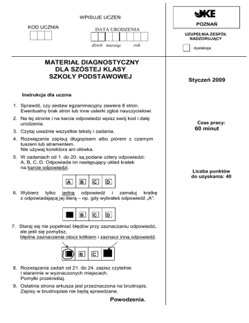 WPISUJE UCZEŃ miejsce POZNAŃ KOD UCZNIA DATA URODZENIA UZUPEŁNIA ZESPÓŁ NADZORUJĄCY dzień miesiąc rok MATERIAŁ DIAGNOSTYCZNY DLA SZÓSTEJ KLASY SZKOŁY PODSTAWOWEJ dysleksja Styczeń 2009 Instrukcja dla ucznia 1. Sprawdź, czy zestaw egzaminacyjny zawiera 8 stron. Ewentualny brak stron lub inne usterki zgłoś nauczycielowi. 2. Na tej stronie i na karcie odpowiedzi wpisz swój kod i datę urodzenia. 3. Czytaj uwaŜnie wszystkie teksty i zadania. Czas pracy: 60 minut 4. Rozwiązania zapisuj długopisem albo piórem z czarnym tuszem lub atramentem. Nie uŜywaj korektora ani ołówka. 5. W zadaniach od 1. do 20. są podane cztery odpowiedzi: A, B, C, D. Odpowiada im następujący układ kratek na karcie odpowiedzi: A B C D 6. Wybierz tylko jedną odpowiedź i zamaluj kratkę z odpowiadającą jej literą – np. gdy wybrałeś odpowiedź „A”: A B C D 7. Staraj się nie popełniać błędów przy zaznaczaniu odpowiedzi, ale jeśli się pomylisz, błędne zaznaczenie otocz kółkiem i zaznacz inną odpowiedź. A B C D 8. Rozwiązania zadań od 21. do 24. zapisz czytelnie i starannie w wyznaczonych miejscach. Pomyłki przekreślaj. 9. Ostatnia strona arkusza jest przeznaczona na brudnopis. Zapisy w brudnopisie nie będą sprawdzane. Powodzenia. Liczba punktów do uzyskania: 40 W sadzie i w ogrodzie Tekst do zadań od 1. do 4. Sadownictwo to dział gospodarstwa wiejskiego, zajmujący się produkcją owoców jadalnych w sadach (np. jabłonie, grusze, śliwy, wiśnie), gajach (np. oliwki, drzewa cytrusowe), na plantacjach (np. porzeczki, truskawki); takŜe nauka o hodowli i uprawie roślin sadowniczych. Wzmianki o uprawie drzew owocowych znajdują się juŜ w najstarszych źródłach chińskich i egipskich. W Ŝywieniu staroŜytnych ludów śródziemnomorskich waŜną rolę odgrywały daktyle, oliwki, figi, winogrona i granaty. Od dawna owoce spoŜywano takŜe na terenie Polski - świadczą o tym nasiona znajdowane w wykopaliskach z okresu kamienia i brązu. Sadownictwo przez długi czas wchodziło w zakres rzemiosła ogrodniczego, rozwijającego się pomyślnie zwłaszcza w XVII i XVIII wieku we Francji i Anglii, gdzie rozpowszechniły się sady drzew karłowatych1, stosowano równieŜ róŜne sposoby szczepienia, cięcia i formowania koron drzew. Rozwój sadownictwa jako nauki rozpoczął się w drugiej połowie XIX wieku. Dzięki temu, Ŝe poznano biologiczne podstawy krzyŜowania roślin, powstało wiele nowych odmian drzew owocowych. W 1913 roku utworzono w Wielkiej Brytanii pierwszy w Europie instytut sadownictwa. W Polsce rozwój sadownictwa jako nauki nastąpił przed I wojną światową, ale juŜ po II wojnie światowej tą nauką zajmowano się we wszystkich wyŜszych uczelniach rolniczych, a takŜe w Instytucie Sadownictwa załoŜonym w 1951r. w Skierniewicach. Na podstawie: Nowa encyklopedia powszechna PWN, Warszawa 1998, t.5, s.689. 1. Jakie owoce odgrywały waŜną rolę w Ŝywieniu staroŜytnych zamieszkujących tereny połoŜone wokół Morza Śródziemnego? A. Wiśnie, jabłka i gruszki. B. Jabłka, czereśnie i śliwki. C. Porzeczki, truskawki i maliny. D. Winogrona, daktyle i oliwki. 2. Które ze znaczeń wyrazu sadownictwo jest prawdziwe? Sadownictwo to A. nauka o zakładaniu i pielęgnowaniu sadów. B. dział literatury o sposobach przetwarzania owoców. C. szczególne zamiłowanie do pielęgnacji sadów. D. dział rolnictwa zajmujący się uprawą roślin kwiatowych. 3. Pierwszy instytut sadownictwa w Europie utworzono w A. drugiej połowie XVIII wieku. B. pierwszej połowie XIX wieku. C. pierwszej połowie XX wieku. D. drugiej połowie XX wieku. 4. Wiele nowych odmian drzew owocowych powstało, dlatego Ŝe A. zastosowano róŜne sposoby cięcia gałęzi. B. zaczęto uŜywać środków ochrony roślin. C. poznano podstawy krzyŜowania roślin. D. rozpowszechniono sadzonki drzew karłowatych. 1 2 Karłowaty – drzewa karłowate – w sadownictwie: niskie drzewa owocowe. ludów, 5. Znaczenie wyrazu karłowaty znajdziesz w słowniku A. ortograficznym. B. języka polskiego. C. terminów literackich. D. frazeologicznym. Tekst do zadań od 6. do 9. [1] [2] [3] [4] [5] [6] [7] [8] [9] [10] [11] [12] [13] Przyleciał, zagwizdał szpak. Zaraz ci powiem, co i jak. – Czereśni – zawołał – czereśni nie moŜna zrywać za wcześnie, lecz w sam czas! Czerwiec w słońcu je rumieni, co dzień dodaje czerwieni. Gdy dojrzałe, słodkie kiście zamigocą pośród liści, ja dam znak. Z dawna ptaki głoszą w pieśniach, Ŝe najlepiej na czereśniach zna się szpak! M. Czerkawska, Czereśnie,[w:] M. Czerkawska, śółte chodaczki, Warszawa 1986. 6. W zdaniu Zaraz ci powiem, co i jak ujawnia się A. mówiący szpak. B. podmiot mówiący. C. rumiana czereśnia. D. autorka utworu. 7. Czerwiec został ukazany w wierszu jako A. malarz. B. muzyk. C. ogrodnik. D. lotnik. 8. Określenie w sam czas oznacza, Ŝe czereśnie naleŜy zrywać, A. kiedy rozpocznie się gorące lato. B. gdy w pieśniach ogłoszą to ptaki. C. kiedy będą dojrzałe i słodkie. D. gdy poeta napisze o tym wiersz. 9. Fragment od 3. do 10. wersu jest A. opowiadaniem o sadzie. B. barwnym opisem szpaka. C. dialogiem szpaka i czereśni. D. wypowiedzią (monologiem) szpaka. 10. Które wyrazy się nie rymują? A. Szpak – jak. B. Czas – znak. C. Rumieni – czerwieni. D. Pieśniach – czereśniach. 3 11. W zdaniu Na czereśniach zna się szpak wykorzystano A. epitet. B. przenośnię. C. porównanie. D. wyrazy dźwiękonaśladowcze. 12. W którym zdaniu wyraz owoc został uŜyty w znaczeniu przenośnym? A. Wiele zwierząt Ŝywi się przede wszystkim owocami. B. Drzewa uginały się pod cięŜarem owoców. C. Oszczędności były owocem wielu wyrzeczeń. D. Dojrzałe owoce wiśni zawieziono do chłodni. Tekst do zadań od 13. do 15. sad m III, D. –u, Ms. sadzie; lm M. –y «teren, na którym zostały zasadzone drzewa i krzewy owocowe; ogród owocowy»: Sad wiśniowy. Zbierać owoce w sadzie. Słownik języka