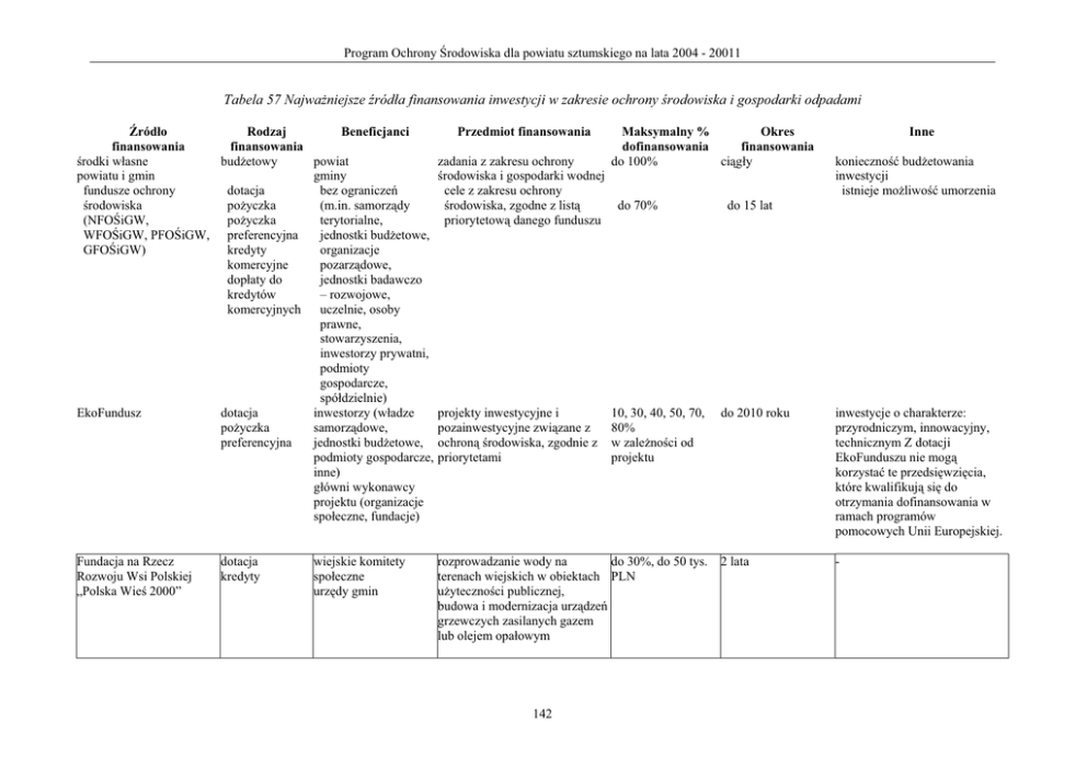 Program Ochrony ĝrodowiska dla powiatu sztumskiego na lata 2004 - 20011 Tabela 57 NajwaĪniejsze Ĩródáa finansowania inwestycji w zakresie ochrony Ğrodowiska i gospodarki odpadami ħródáo Rodzaj Beneficjanci finansowania finansowania Ğrodki wáasne budĪetowy powiat powiatu i gmin gminy bez ograniczeĔ fundusze ochrony dotacja (m.in. samorządy poĪyczka Ğrodowiska terytorialne, (NFOĝiGW, poĪyczka jednostki budĪetowe, WFOĝiGW, PFOĝiGW, preferencyjna organizacje GFOĝiGW) kredyty pozarządowe, komercyjne jednostki badawczo dopáaty do – rozwojowe, kredytów komercyjnych uczelnie, osoby prawne, stowarzyszenia, inwestorzy prywatni, podmioty gospodarcze, spóádzielnie) EkoFundusz dotacja inwestorzy (wáadze poĪyczka samorządowe, preferencyjna jednostki budĪetowe, podmioty gospodarcze, inne) gáówni wykonawcy projektu (organizacje spoáeczne, fundacje) Fundacja na Rzecz Rozwoju Wsi Polskiej „Polska WieĞ 2000” dotacja kredyty wiejskie komitety spoáeczne urzĊdy gmin Przedmiot finansowania Maksymalny % Okres dofinansowania finansowania do 100% ciągáy zadania z zakresu ochrony Ğrodowiska i gospodarki wodnej cele z zakresu ochrony Ğrodowiska, zgodne z listą do 70% priorytetową danego funduszu projekty inwestycyjne i pozainwestycyjne związane z ochroną Ğrodowiska, zgodnie z priorytetami 10, 30, 40, 50, 70, 80% w zaleĪnoĞci od projektu do 30%, do 50 tys. rozprowadzanie wody na terenach wiejskich w obiektach PLN uĪytecznoĞci publicznej, budowa i modernizacja urządzeĔ grzewczych zasilanych gazem lub olejem opaáowym 142 Inne koniecznoĞü budĪetowania inwestycji istnieje moĪliwoĞü umorzenia do 15 lat do 2010 roku inwestycje o charakterze: przyrodniczym, innowacyjny, technicznym Z dotacji EkoFunduszu nie mogą korzystaü te przedsiĊwziĊcia, które kwalifikują siĊ do otrzymania dofinansowania w ramach programów pomocowych Unii Europejskiej. 2 lata - Program Ochrony ĝrodowiska dla powiatu sztumskiego na lata 2004 - 20011 ħródáo finansowania Fundacja Wspomagania Wsi Rodzaj Beneficjanci finansowania kredyty zarządy gmin mikropoĪyczki osoby prywatne DuĔski Fundusz Pomocowy Ochrony ĝrodowiska DANCEE dotacje poĪyczki starostwa i gminy zakáady usáug komunalnych przedsiĊbiorstwa wodno – kanalizacyjne instytuty badawczo rozwojowe Komisja Europejska Departament XI dotacje osoby fizyczne i prawne Europejski Fundusz Rozwoju Wsi Polskiej Finesco SA fundusze UE Przedmiot finansowania Maksymalny % dofinansowania kanalizacja, oczyszczanie Ğcieków, przydomowe oczyszczalnie Ğcieków do 100% ochrona wód, powietrza, przyrody, gospodarka odpadami, kontrola zanieczyszczeĔ, wzmocnienie instytucjonalne innowacyjne i demonstracyjne od 30 do 100% programy dziaáania w przemyĞle, wspomaganie technicznych dziaáaĔ lokalnych instytucji dotacje gminy bĊdące budowa i wyposaĪenie do 70% kredyty inwestorami obiektów skáadowisk ochrony Ğrodowiska kredyty sektor publiczny inwestycje infrastrukturalne Leasing spóádzielnie proekologiczne, udziaáy mieszkaniowe wodnokanalizacyjne, kapitaáowe, TPF energetyczne, termoizolacyjne, budownictwa komunalnego, transportu miejskiego, gospodarki odpadami dotacja jednostki samorządu szeroko ujĊta problematyka do 75% terytorialnego ochrony Ğrodowiska organizacje pozarządowe inne podmioty publiczne podmioty gospodarcze osoby indywidualne 143 Okres finansowania do 5 lat Inne - - dostawy i prace budowlane muszą odpowiadaü unijnym standardom projekt musi uzyskaü poparcie lokalnych organów administracji i Ministerstwa ĝrodowiska 1 rok do 10 lat przeznaczony gáównie do maáych projektów kwota pomocy od 20 do 60 tys. Euro maksymalna kwota dotacji – 100 tys. zá kredytu – 200 tys. - b.d. - do 5 lat Pozostaáe Ĩródáa finansowania: Fundacje: - Environmental Know-How Fund w Warszawie, Ambasada Brytyjska al. RóĪ 1, 00-556 Warszawa, - Agencja Rozwoju Komunalnego w Warszawie; al. Ujazdowskie 19, 00-557 Warszawa, - Fundacja Wspóápracy Polsko-Niemieckiej; ul. Zielna 37, 00-1-8 Warszawa, - Polska Agencja Rozwoju Regionalnego; ul. ĩurawia 4a, 00-503 Warszawa, - Program Maáych Dotacji GEF, al. NiepodlegáoĞci 186, 00-608 Warszawa, - Projekt Umbrella. Banki aktywnie wspomagające finansowanie ochrony Ğrodowisk: - Bank Ochrony ĝrodowiska, - Bank Rozwoju Eksportu S.A., - Polski Bank Rozwoju S.A., - Bank ĝwiatowy, - Europejski Bank Odbudowy i Rozwoju. Fundusze inwestycyjne Fundusze inwestycyjne stanowią nowy segment rynku finansowego ochrony Ğrodowiska. WejĞcie ekologicznych funduszy inwestycyjnych na rynek finansowy ochrony Ğrodowiska moĪe okazaü siĊ kluczowe dla usprawnienia podejmowania decyzji inwestycyjnych oraz integracji ochrony Ğrodowiska z przedsiĊwziĊciami o charakterze gospodarczym. Instytucje leasingowe finansujące zadania z zakresu ochrony Ğrodowiska: - Towarzystwo Inwestycyjno-Leasingowe EKOLEASING S.A., - BEL Leasing Sp. z o.o., - BISE Leasing S.A., - Centralne Towarzystwo Leasingowe S.A., - Europejski Fundusz Leasingowy Sp. z o.o. Ocena dostĊpnoĞci Ĩródeá finansowania dla zadaĔ wymienionych w Programie Zadania wyznaczone w Programie mają swoje odzwierciedlenie w priorytetach funduszy ekologicznych. Istnieje wiĊc realna szansa uzyskania wsparcia z tych Ĩródeá. Z najwaĪniejszych naleĪy wymieniü zadania z zakresu gospodarki wodno – Ğciekowej, likwidacjĊ niskiej emisji, ochrona wód, ochrona powietrza i przed haáasem, ochrona przyrody i krajobrazu. Pomoc z tych Ĩródeá obejmuje przede wszystkim te dziedziny, w których standardy jakoĞci Ğrodowiska uzgodnione podczas negocjacji z Unią Europejską nie są dotrzymane. Dotyczy to przede wszystkim gospodarki wodno – Ğciekowej. W zakresie uzyskania kredytów bankowych duĪe szanse mają inwestycje z zakresu ochrony atmosfery, a takĪe wspierające rozwój odnawialnych Ĩródeá energii (np. maáych elektrowni wodnych, kotáownie na biopaliwo, itp.). Istnieje równieĪ moĪliwoĞü uzyskania dofinansowania z funduszy europe