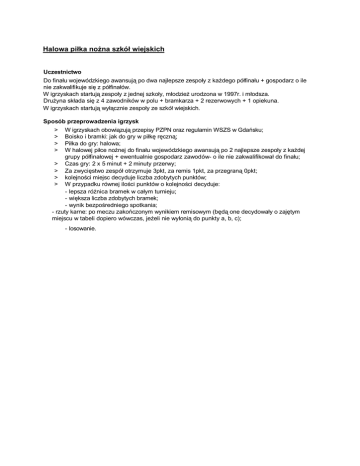 Halowa piłka nożna szkół wiejskich Uczestnictwo Do finału wojewódzkiego awansują po dwa najlepsze zespoły z każdego półfinału + gospodarz o ile nie zakwalifikuje się z półfinałów. W igrzyskach startują zespoły z jednej szkoły, młodzież urodzona w 1997r. i młodsza. Drużyna składa się z 4 zawodników w polu + bramkarza + 2 rezerwowych + 1 opiekuna. W igrzyskach startują wyłącznie zespoły ze szkół wiejskich. Sposób przeprowadzenia igrzysk > > > > W igrzyskach obowiązują przepisy PZPN oraz regulamin WSZS w Gdańsku; Boisko i bramki: jak do gry w piłkę ręczną; Piłka do gry: halowa; W halowej piłce nożnej do finału wojewódzkiego awansują po 2 najlepsze zespoły z każdej grupy półfinałowej + ewentualnie gospodarz zawodów- o ile nie zakwalifikował do finału; > Czas gry: 2 x 5 minut + 2 minuty przerwy; > Za zwycięstwo zespół otrzymuje 3pkt, za remis 1pkt, za przegraną 0pkt; > kolejności miejsc decyduje liczba zdobytych punktów; > W przypadku równej ilości punktów o kolejności decyduje: - lepsza różnica bramek w całym turnieju; - większa liczba zdobytych bramek; - wynik bezpośredniego spotkania; - rzuty karne: po meczu zakończonym wynikiem remisowym (będą one decydowały o zajętym miejscu w tabeli dopiero wówczas, jeżeli nie wyłonią do punkty a, b, c); - losowanie.