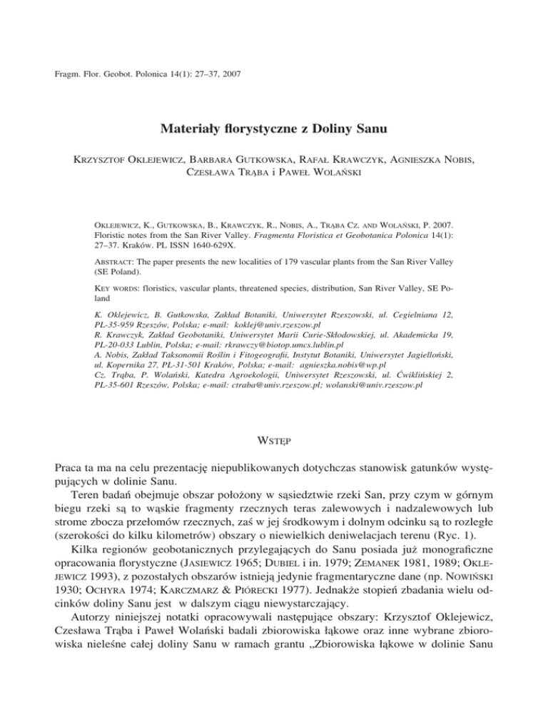 Fragm. Flor. Geobot. Polonica 14(1): 27–37, 2007 Materiały florystyczne z Doliny Sanu KRZYSZTOF OKLEJEWICZ, BARBARA GUTKOWSKA, RAFAŁ KRAWCZYK, AGNIESZKA NOBIS, CZESŁAWA TRĄBA i PAWEŁ WOLAŃSKI OKLEJEWICZ, K., GUTKOWSKA, B., KRAWCZYK, R., NOBIS, A., TRĄBA CZ. AND WOLAŃSKI, P. 2007. Floristic notes from the San River Valley. Fragmenta Floristica et Geobotanica Polonica 14(1): 27–37. Kraków. PL ISSN 1640-629X. ABSTRACT: The paper presents the new localities of 179 vascular plants from the San River Valley (SE Poland). KEY land WORDS: floristics, vascular plants, threatened species, distribution, San River Valley, SE Po- K. Oklejewicz, B. Gutkowska, Zakład Botaniki, Uniwersytet Rzeszowski, ul. Cegielniana 12, PL-35-959 Rzeszów, Polska; e-mail: [email protected] R. Krawczyk, Zakład Geobotaniki, Uniwersytet Marii Curie-Skłodowskiej, ul. Akademicka 19, PL-20-033 Lublin, Polska; e-mail: [email protected] A. Nobis, Zakład Taksonomii Roślin i Fitogeografii, Instytut Botaniki, Uniwersytet Jagielloński, ul. Kopernika 27, PL-31-501 Kraków, Polska; e-mail: [email protected] Cz. Trąba, P. Wolański, Katedra Agroekologii, Uniwersytet Rzeszowski, ul. Ćwiklińskiej 2, PL-35-601 Rzeszów, Polska; e-mail: [email protected]; [email protected] WSTĘP Praca ta ma na celu prezentację niepublikowanych dotychczas stanowisk gatunków występujących w dolinie Sanu. Teren badań obejmuje obszar położony w sąsiedztwie rzeki San, przy czym w górnym biegu rzeki są to wąskie fragmenty rzecznych teras zalewowych i nadzalewowych lub strome zbocza przełomów rzecznych, zaś w jej środkowym i dolnym odcinku są to rozległe (szerokości do kilku kilometrów) obszary o niewielkich deniwelacjach terenu (Ryc. 1). Kilka regionów geobotanicznych przylegających do Sanu posiada już monograficzne opracowania florystyczne (JASIEWICZ 1965; DUBIEL i in. 1979; ZEMANEK 1981, 1989; OKLEJEWICZ 1993), z pozostałych obszarów istnieją jedynie fragmentaryczne dane (np. NOWIŃSKI 1930; OCHYRA 1974; KARCZMARZ & PIÓRECKI 1977). Jednakże stopień zbadania wielu odcinków doliny Sanu jest w dalszym ciągu niewystarczający. Autorzy niniejszej notatki opracowywali następujące obszary: Krzysztof Oklejewicz, Czesława Trąba i Paweł Wolański badali zbiorowiska łąkowe oraz inne wybrane zbiorowiska nieleśne całej doliny Sanu w ramach grantu „Zbiorowiska łąkowe w dolinie Sanu 28 Fragm. Flor. Geobot. Polonica 14(1), 2007 Ryc. 1. Położenie badanego terenu w siatce ATPOL Fig. 1. Localization of the study area in the ATPOL square grid K. Oklejewicz i in.: Materiały florystyczne z Doliny Sanu 29 – waloryzacja przyrodnicza, ekologiczna i paszowa”, Barbara Gutkowska prowadzi intensywne badania florystyczne w południowej części Pogórza Dynowskiego, Agnieszka Nobis opracowuje florę roślin naczyniowych przylegającego do Sanu fragmentu Kotliny Sandomierskiej na odcinku od Leżachowa koło Sieniawy do Ulanowa, natomiast Rafał Krawczyk przeprowadził badania florystyczne w Dolinie Dolnego Sanu (od Ulanowa do ujścia Sanu do Wisły). Zamieszczone poniżej dane znacząco wypełniają luki w „Atlasie rozmieszczenia roślin...” (ZAJĄC & ZAJĄC 2001). WYKAZ GATUNKÓW Nomenklatura gatunków oraz układ systematyczny są zgodne z opracowaniem MIRKA i in. (2002). Lokalizacja stanowisk podana została w sieci ATPOL, przy czym zgodnie z metodyką zaproponowaną przez ZAJĄCA (1978) cyfry znajdujące się po symbolach literowych dużego kwadratu oznaczają: dwie pierwsze – numer kwadratu o boku 10 km, dwie kolejne numer kwadratu o boku 2 km. W pracy zastosowano następujące skróty i symbole: m. – między, k. – koło, * – zadomowiony antropofit, [*] – gatunek o statusie niejasnym we florze Polski, istnieje przypuszczenie, że może być antropofitem. Equisetum hyemale – Nadrzeczne zarośla wierzbowe na wysokich brzegach Sanu. Stalowa Wola (FF 04 34). E. ramosissimum – Suche łąki i pastwiska, nadrzeczne ziołorośla, nieużytki. Nisko (FF 05 30), Krzeszów (FF 26 13), Bieliniec (FF 16 21), Za Łączką k. Leżachowa (FF 58 03). E. pratense – Zarośla wierzbowe i nasadzenia sosny wzdłuż wysokich brzegów Sanu, wilgotne zarośla na skraju boru mieszanego. Nisko (FF 05 31), Przędzel (FF 15 14), Wólka Tanewska (FF 16 10), Tarnawiec (FF 37 24). Thelypteris palustris – Podtopione zarośla wierzbowe na brzegu stawu. Racławice (FF 15 02). Salvinia natans – Starorzecza i zalane zagłębienia śródpolne. Brandwica (FF 04 03), Przędzel (FF 15 14). Nuphar lutea – Starorzecza i niewielkie stawy. Brandwica (FF 04 03), Ulanów (FF 16 12), Tarnogóra (FF 26 33). Anemone ranunculoides – Zarośla wierzbowe nad Sanem w Czekaju Pniowskim (FE 93 01) i na skraju lasu mieszanego przy cieku wodnym w Kłyżowie (FF 05 32). Batrachium aquatile – Niewielki ciek wodny. Przędzel (FF 15 14). B. circinatum – Zalane wyrobiska piaskowe, stawy, starorzecza, oczka wodne. Nowiny (FE 93 02), Majdan Zbydniowski (FE 94 30), Brandwica (FF 04 03), Zarzecze (FF 15 04), Wólka Tanewska (FF 16 10), Torki (GF 81 10). Myosurus minimus – Gliniaste pola uprawne, koleiny dróg gruntowych. Olszowiec (FF 05 32), Bieliniec (FF 16 21), Kolonia Kamionka (FF 26 03), Rudka (FF 48 04), Kapleńskie (FF 48 13). Ranunculus auricomus – Wilgotne i podmokłe łąki, rzadziej lasy łęgowe. Zbydnów (FE 93 33), Dąbrowa Rzeczycka (FE 94 22), Jastkowice (FF 04 04), Pysznica (FF 05 22), Nisko (FF 14 04), Przędzel (FF 15 23), Ulanów (FF 16 11). R. bulbosus – Suche łąki i murawy. Motycze Poduchowne (FE 93 21), Jastkowice (FF 05 10), Racławice FF 15 02). R. lingua – Zbiorowiska szuwarowe. Jastkowice (FF 05 00), Przędzel (FF 16 20), Kopki (FF 26 12). R. sardous – Wilgotne i podmokłe pastwiska. Wola Rzeczycka (FE 94 21), Pysznica (FF 05 32), Nowa Wieś (FF 15 03), Glinianka (FF 16 12), Kopki (FF 26 12). 30 Fragm. Flor. Geobot. Polonica 14(1), 2007 Ranunculus sceleratus – Dna i brzegi wysychających starorzeczy i sadzawe