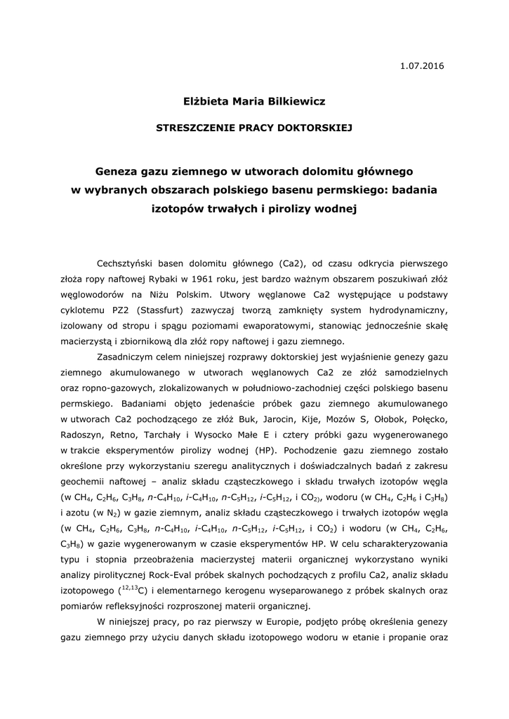 1.07.2016 Elżbieta Maria Bilkiewicz STRESZCZENIE PRACY DOKTORSKIEJ Geneza gazu ziemnego w utworach dolomitu głównego w wybranych obszarach polskiego basenu permskiego: badania izotopów trwałych i pirolizy wodnej Cechsztyński basen dolomitu głównego (Ca2), od czasu odkrycia pierwszego złoża ropy naftowej Rybaki w 1961 roku, jest bardzo ważnym obszarem poszukiwań złóż węglowodorów na Niżu Polskim. Utwory węglanowe Ca2 występujące u podstawy cyklotemu PZ2 (Stassfurt) zazwyczaj tworzą zamknięty system hydrodynamiczny, izolowany od stropu i spągu poziomami ewaporatowymi, stanowiąc jednocześnie skałę macierzystą i zbiornikową dla złóż ropy naftowej i gazu ziemnego. Zasadniczym celem niniejszej rozprawy doktorskiej jest wyjaśnienie genezy gazu ziemnego akumulowanego w utworach węglanowych Ca2 ze złóż samodzielnych oraz ropno-gazowych, zlokalizowanych w południowo-zachodniej części polskiego basenu permskiego. Badaniami objęto jedenaście próbek gazu ziemnego akumulowanego w utworach Ca2 pochodzącego ze złóż Buk, Jarocin, Kije, Mozów S, Ołobok, Połęcko, Radoszyn, Retno, Tarchały i Wysocko Małe E i cztery próbki gazu wygenerowanego w trakcie eksperymentów pirolizy wodnej (HP). Pochodzenie gazu ziemnego zostało określone przy wykorzystaniu szeregu analitycznych i doświadczalnych badań z zakresu geochemii naftowej – analiz składu cząsteczkowego i składu trwałych izotopów węgla (w CH4, C2H6, C3H8, n-C4H10, i-C4H10, n-C5H12, i-C5H12, i CO2), wodoru (w CH4, C2H6 i C3H8) i azotu (w N2) w gazie ziemnym, analiz składu cząsteczkowego i trwałych izotopów węgla (w CH4, C2H6, C3H8, n-C4H10, i-C4H10, n-C5H12, i-C5H12, i CO2) i wodoru (w CH4, C2H6, C3H8) w gazie wygenerowanym w czasie eksperymentów HP. W celu scharakteryzowania typu i stopnia przeobrażenia macierzystej materii organicznej wykorzystano wyniki analizy pirolitycznej Rock-Eval próbek skalnych pochodzących z profilu Ca2, analiz składu izotopowego (12,13C) i elementarnego kerogenu wyseparowanego z próbek skalnych oraz pomiarów refleksyjności rozproszonej materii organicznej. W niniejszej pracy, po raz pierwszy w Europie, podjęto próbę określenia genezy gazu ziemnego przy użyciu danych składu izotopowego wodoru w etanie i propanie oraz oceny przydatności tych danych do określania typu i stopnia przeobrażenia macierzystej materii organicznej. HP jest nowoczesną, eksperymentalną metodą, symulującą procesy naturalnego generowania i macierzystych. ekspulsji Polega węglowodorów, ona na zachodzące ogrzewaniu próbki w trakcie skalnej w pogrążania obecności skał wody. Doświadczenia HP zostały wykonane w Laboratorium Geochemii Naftowej i Środowiska Akademii Górniczo-Hutniczej im. S. Staszica w Krakowie, które jako pierwsze w Europie i trzecie na świecie, posiada aparaturę do przeprowadzania eksperymentów HP. Dwa kompozyty do eksperymentów HP zostały przygotowane z połączenia próbek wyselekcjonowanych na podstawie wyników pirolizy Rock-Eval, wykonanej dla 151 próbek skalnych, pochodzących z profilu utworów Ca2 trzynastu odwiertów, zlokalizowanych w pobliżu badanych akumulacji gazu ziemnego. Doświadczenia HP zostały przeprowadzone w warunkach 330 i 355oC w czasie 72 h, co odpowiada wczesnej i późnej fazie termogenicznych procesów generowania ropy. Gazy wytworzone ze skały macierzystej Ca2 posłużyły do identyfikacji węglowodorów gazowych wygenerowanych w procesach termogenicznych, a także do śledzenia zmian składu cząsteczkowego i izotopowego wraz ze wzrostem stopnia dojrzałości materii organicznej. W metanie, etanie i propanie, wytworzonych w trakcie doświadczeń HP z dwóch różnych typów kerogenu, zaobserwowano nieliniowy trend wartości δ13C zestawionych względem liczby atomów węgla w cząsteczkach tych gazów. Oznacza to, że podobny trend obserwowany w węglowodorach w gazie ziemnym, nie może świadczyć o ich złożonym procesie generowania, bez względu na typ kerogenu. Podobne wnioski wypływają z zestawienia wartości δ2H w metanie, etanie i propanie względem liczby atomów wodoru w cząsteczkach tych węglowodorów. Gazy HP wykazują trend linii wypukłych i wklęsłych, które również nie mogą świadczyć o złożonej historii generowania. Skład izotopowy węgla w gazach węglowodorowych wygenerowanych w trakcie eksperymentów HP odzwierciedla skład izotopowy węgla macierzystego kerogenu, wskazując na to, że typ macierzystej materii organicznej ma znaczny wpływ na wartości δ13C tych gazów. Nie zaobserwowano zależności w zmianach wartości δ2H w metanie, etanie i propanie gazów wygenerowanych w trakcie eksperymentów HP w odniesieniu do typu genetycznego kerogenu. Wzrost dojrzałości o materii organicznej w trakcie eksperymentów HP 2 w temperaturach 330 i 355 C jest odzwierciedlony we wzroście wartości δ H w metanie, natomiast wartości δ2H w etanie i propanie nie wykazują zmian związanych z różnymi warunkami temperaturowymi eksperymentów HP. Wobec tego jedynie wartości δ2H w metanie mogą posłużyć do oceny stopnia przeobrażenia materii organicznej. Skład trwałych izotopów wodoru w metanie, etanie i propanie nie dostarczył informacji ani o typie genetycznym, ani o procesach mieszania poszczególnych składowych genetycznych w gazach węglowodorowych. Na obszarze objętym badaniami stwierdzono występowanie dwóch niezależnych grup genetycznych gazów węglowodorowych. Pierwsza grupa genetyczna obejmuje gazy węglowodorowe, które są związane z rozproszoną materią organiczną Ca2. Gazy te powstały albo w wyniku procesów mikrobialnych i termogenicznych, albo wyłącznie w wyniku procesów termogenicznych. Brak składowej mikrobialnej w złożach, w których występują wyłącznie termogeniczne gazy węglowodorowe, świadczy o tym, że na etapie diagenetycznego generowania gazu ziemnego, pułapki w tych złożach nie były jeszcze uformowane. Natomiast występowan
