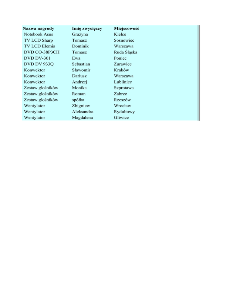 Nazwa nagrody Notebook Asus TV LCD Sharp TV LCD Elemis DVD CO-38P3CH DVD DV-301 DVD DV 933Q Konwektor Konwektor Konwektor Zestaw głośników Zestaw głośników Zestaw głośników Wentylator Wentylator Wentylator Imię zwycięzcy Grażyna Tomasz Dominik Tomasz Ewa Sebastian Sławomir Dariusz Andrzej Monika Roman spółka Zbigniew Aleksandra Magdalena Miejscowość Kielce Sosnowiec Warszawa Ruda Śląska Poniec Żurawiec Kraków Warszawa Lubliniec Szprotawa Zabrze Rzeszów Wrocław Rydułtowy Gliwice