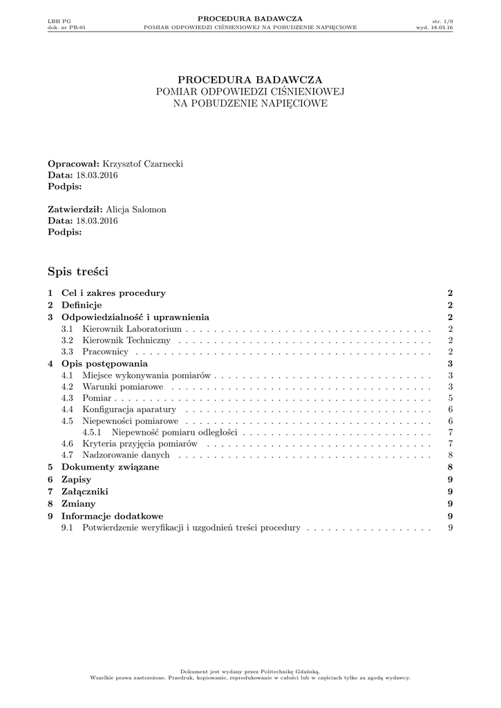 PROCEDURA BADAWCZA LBH PG dok. nr PB-01 str. 1/9 wyd. 18.03.16 POMIAR ODPOWIEDZI CIŚNIENIOWEJ NA POBUDZENIE NAPIĘCIOWE PROCEDURA BADAWCZA POMIAR ODPOWIEDZI CIŚNIENIOWEJ NA POBUDZENIE NAPIĘCIOWE Opracował: Krzysztof Czarnecki Data: 18.03.2016 Podpis: Zatwierdził: Alicja Salomon Data: 18.03.2016 Podpis: Spis treści 1 Cel i zakres procedury 2 Definicje 3 Odpowiedzialność i uprawnienia 3.1 Kierownik Laboratorium . . . . . . . . . . . . . . . . . 3.2 Kierownik Techniczny . . . . . . . . . . . . . . . . . . 3.3 Pracownicy . . . . . . . . . . . . . . . . . . . . . . . . 4 Opis postępowania 4.1 Miejsce wykonywania pomiarów . . . . . . . . . . . . . 4.2 Warunki pomiarowe . . . . . . . . . . . . . . . . . . . 4.3 Pomiar . . . . . . . . . . . . . . . . . . . . . . . . . . . 4.4 Konfiguracja aparatury . . . . . . . . . . . . . . . . . 4.5 Niepewności pomiarowe . . . . . . . . . . . . . . . . . 4.5.1 Niepewność pomiaru odległości . . . . . . . . . 4.6 Kryteria przyjęcia pomiarów . . . . . . . . . . . . . . 4.7 Nadzorowanie danych . . . . . . . . . . . . . . . . . . 5 Dokumenty związane 6 Zapisy 7 Załączniki 8 Zmiany 9 Informacje dodatkowe 9.1 Potwierdzenie weryfikacji i uzgodnień treści procedury . . . . . . . . . . . . . . . . . . . . . . . . . . . . . . . . . . . . . . . . . . . . . . . . . . . . . . . . . . . . . . . . . . . . . . . . . . . . . . . . . . . . . . . . . . . . . . . . . . . . . . . . . . . . . . . . . . . . . . . . . . . . . . . . . . . . . . . . . . . . . . . . . . . . . . . . . . . . . . . . . . . . . . . . . . . . . . . . . . . . . . . . . . . . . . . . . . . . . . . . . . . . . . . . . . . . . . . . Dokument jest wydany przez Politechnikę Gdańską. Wszelkie prawa zastrzeżone. Przedruk, kopiowanie, reprodukowanie w całości lub w częściach tylko za zgodą wydawcy. 2 2 2 2 2 2 3 3 3 5 6 6 7 7 8 8 9 9 9 9 9 PROCEDURA BADAWCZA LBH PG dok. nr PB-01 1 POMIAR ODPOWIEDZI CIŚNIENIOWEJ NA POBUDZENIE NAPIĘCIOWE str. 2/9 wyd. 18.03.16 Cel i zakres procedury Celem niniejszego dokumentu jest zdefiniowanie procedury pomiarowej odpowiedzi ciśnieniowej na pobudzenie napięciowe w polu swobodnym oraz określenie niepewności pomiarowej i warunków, jakie muszą być spełnione podczas prowadzenia pomiarów. Obiektem badań są przetworniki ultradźwiękowe, w tym również zespoły przetworników. Pomiary są prowadzone metodą bezpośrednią, a następnie przeliczane według wzoru do znormalizowanej odległości jednego metra. Pomiary dotyczą sygnałów w paśmie częstotliwościowym od 30 kHz do 100 kHz oraz w zakresie ciśnienia pobudzenia od 30 Pa do 60 kPa, natomiast wartość napięcia pobudzającego musi zawierać się w przedziale od 0,5 V do 1 kV. Opisana w niniejszym dokumencie metoda badawcza jest znormalizowana w normie PN-EN 60565 [5]. 2 Definicje • • • • 3 Przetwornik – badany przetwornik ultradźwiękowy lub zespół takich przetworników. Hydrofon – wzorcowany hydrofon za pomocą, którego dokonuje się pomiaru. Laboratorium – Laboratorium Badawcze Hydroakustyki Politechniki Gdańskiej. Odpowiedź ciśnieniowa na pobudzenie napięciowe (ang. Transmitting Voltage Response), w skrócie TVR, wyraża właściwości nadawcze przetwornika ultradźwiękowego lub zespołu takich przetworników w liniowym zakresie pracy. TVR oblicza się dla wybranej częstotliwości sygnału, zazwyczaj jest to częstotliwość rezonansowa przetwornika. Możliwe jest również sporządzanie charakterystyk TVR dla pasma częstotliwości (tzw. częstotliwościowa funkcja przenoszenia). Pomiaru dokonuje się w tzw. polu dalekim na wybranym kierunku, zazwyczaj na osi akustycznej. Odpowiedzialność i uprawnienia 3.1 • • • • • 3.2 • • • • • 3.3 Kierownik Laboratorium Nadzór nad stosowaniem procedury badawczej. Nadzór nad dokumentami i zapisami. Planowanie badań. Autoryzacja wyników badań. Zatrzymanie i wznowienie badań niezgodnych. Kierownik Techniczny Opracowanie procedur badawczych oraz instrukcji. Odpowiedzialność za merytoryczną część procedury badawczej. Prowadzenie walidacji metod badawczych. Sporządzanie sprawozdań i raportów z badań. Modyfikacja istniejących metod badawczych. Pracownicy • Wykonywanie pomiarów zgodnie z procedura badawczą. • Archiwizacja wyników badań. • Weryfikacja metod badawczych. Dokument jest wydany przez Politechnikę Gdańską. Wszelkie prawa zastrzeżone. Przedruk, kopiowanie, reprodukowanie w całości lub w częściach tylko za zgodą wydawcy. LBH PG dok. nr PB-01 4 PROCEDURA BADAWCZA POMIAR ODPOWIEDZI CIŚNIENIOWEJ NA POBUDZENIE NAPIĘCIOWE str. 3/9 wyd. 18.03.16 Opis postępowania 4.1 Miejsce wykonywania pomiarów Pomiary mogą być wykonywane w basenach krytych lub w akwenach otwartych, mogą również dotyczyć urządzeń hydroakustycznych zainstalowanych na statkach lub okrętach wojennych zacumowanych w basenach portowych. Dodatkowo Wydział Elektroniki Telekomunikacji i Informatyki, Politechniki Gdańskiej udostępnia dla potrzeb Laboratorium wytłumiony basen pomiarowy, w którym mogą być prowadzone badania niektórych przetworników ultradźwiękowych. Ponadto Wydział Elektroniki Telekomunikacji i Informatyki Politechniki Gdańskiej zapewnia dla Laboratorium dostęp do Stacji Badań Hydroakustycznych zlokalizowanej w Joninach Małych nad jeziorem Wdzydze. Stacja ta wyposażona jest w pływający pomost o długości 40 m, kontener laboratoryjny posadowiony na pływającym katamaranie, oraz w stabilną wieżę pomiarową ustawianą na dnie jeziora. Wykonywanie badań w różnych lokalizacjach narzuca szczególne warunki przechowywania, transportowania i instalowania aparatury pomiarowej. • Podczas wykonywania pomiarów na statkach lub okrętach wojennych aparatura pomiarowa powinna być umieszczona w udostępnionej w tym celu kabinie. • Podczas wykonywania pomiarów terenowych w innych obcych obiektach dopuszcza się umieszczenie aparatury pomiarowej w samochodzie, przy za