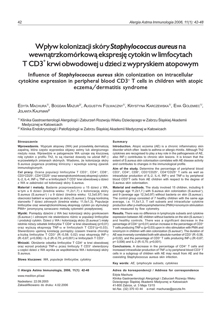 42 Alergia Astma Immunologia 2006, 11(1): 42-48 Wp³yw kolonizacji skóry Staphylococcus aureus na wewn¹trzkomórkow¹ ekspresjê cytokin w limfocytach + T CD3 krwi obwodowej u dzieci z wypryskiem atopowym Influence of Staphylococcus aureus skin colonization on intracellular cytokine expression in peripheral blood CD3 + T cells in children with atopic eczema/dermatitis syndrome EDYTA MACHURA1/, BOGDAN MAZUR2/, AUGUSTYN FOLWACZNY1/, KRYSTYNA KARCZEWSKA1/, EWA GOLEMIEC1/, JOLANTA KAUFMAN2/ 1/ Klinika Gastroenterologii Alergologii i Zaburzeñ Rozwoju Wieku Dzieciêcego w Zabrzu l¹skiej Akademii Medycznej w Katowicach 2/ Klinika Endokrynologii i Patofizjologii w Zabrzu l¹skiej Akademii Medycznej w Katowicach Streszczenie Summary Wprowadzenie. Wyprysk atopowy (WA) jest przewlek³¹ dermatoz¹ zapaln¹, która czêsto wyprzedza objawy astmy lub alergicznego nie¿ytu nosa. Wprawdzie w patogenezie WA uznaje siê kluczow¹ rolê cytokin o profilu Th2, to s¹ równie¿ dowody na udzia³ INF-γ w przewlek³ych zmianach skórnych. Wiadomo, ¿e kolonizacja skóry S.aureus pogarsza przebieg kliniczny i wywo³uje szereg zjawisk immunologicznych. Cel pracy. Ocena populacji limfocytów T CD3 + , CD4 +, CD8 + , CD3+CD25+, CD4+CD25+ oraz wewn¹trzkomórkowej ekspresji cytokin: IL-2, IL-4, INF-γ, TNF-α w limfocytach T CD3+ krwi obwodowej u dzieci z WA w zale¿noci od kolonizacji skóry S.aureus. Introduction. Atopic eczema (AE) is a chronic inflammatory skin disorder which often leads to asthma or allergic rhinitis. Although Th2 cytokines are recognised to play a key role in the pathogenesis of AE, also INF-γ contributes to chronic skin lesions. It is known that the extent of S.aureus skin colonisation correlates with AE disease activity and contributes to changes in the immunological profile. Materia³ i metody. Badanie przeprowadzono u 15 dzieci z WA, w tym u 6 dzieci (rednia wieku: 11,2±1,7) z kolonizacj¹ skóry S.aureus (S.aureus+) i u 9 dzieci (rednia wieku: 12,3±0,97) bez obecnoci bakterii w wymazach ze skóry (S.aureus-). Grupê kontroln¹ stanowi³o 7 dzieci zdrowych (rednia wieku: 11,5±1,3). Populacje limfocytów oraz wewn¹trzkomórkow¹ ekspresjê cytokin po stymulacji PMA+ jonomycyn¹ oznaczano metod¹ cytometrii przep³ywowej. Material and methods. The study involved 15 children, including 6 (average age 11,2±1,7.) with S.aureus skin colonization (S.aureus+), and 9 (average age 12,3±0,97) without bacteria on skin (S.aureus-). The control group consisted of 7 healthy children with the same age average, i.e. 11,5±1,3. T cell subsets and intracellular cytokine production after p-methoxyamphetamine (PMA)+ionomycin stimulation were measured by flow cytometry. Wyniki. Pomiêdzy dzieæmi z WA bez kolonizacji skóry gronkowcem (S.aureus-) i zdrowymi nie stwierdzono ró¿nic w populacji limfocytów i produkcji cytokin. Dzieci z WA i kolonizacj¹ skóry (S.aureus+) mia³y istotnie ni¿szy odsetek limfocytów T CD4+ w krwi obwodowej (p<0,01) oraz wy¿sz¹ ekspresjê TNF-α w limfocytach T CD3+ (p<0,03). Stwierdzono ujemn¹ korelacjê pomiêdzy czasem trwania choroby a liczb¹ limfocytów T CD3 + (R:-0,58; 0,02) oraz ekspresj¹ INF-γ (R:-0,67; p<0,006) i IL-2 (R:-0,75; p<0,001) w limfocytach T CD3+. Results. There was no difference in lymphocyte subsets and cytokine expression between AE children without bacteria on the skin (S.aureus-) and healthy controls. There was a significant decrease in the percentage of CD4+ (p<0,01) and an increase in the percentage of CD3+ T cells producing TNF-α (p<0,03) upon in vitro stimulation with PMA and ionomycin in children with skin colonization (S.aureus+). The duration of AE was inversely correlated both with absolute number of CD3+ (R:-0,58, p<0,02), and the percentage of CD3+ T cells producing INF-γ (R:-0,67; p< 0,006) and IL-2 (R:-0,75; p<0,001). Wnioski. Obni¿enie odsetka limfocytów T CD4+ w krwi obwodowej oraz wzrost produkcji TNF-α przez limfocyty T CD3+ stwierdzony u czêci dzieci z WA wynika ze wspó³istnienia WA i kolonizacji skóry S.aureus. S³owa kluczowe: WA, populacje limfocytów, cytokiny © Alergia Astma Immunologia, 2006, 11(1): 42-48 www.mediton.pl/aai Nades³ano: 22.09.2005 Zakwalifikowano do druku: 4.02.2006 Aim of the study. Determine the percentage of peripheral blood CD3+ , CD4+ , CD8 +, CD3 +CD25+ , CD4 +CD25+ T cells as well as intracellular production of IL-2, IL-4, INF-γ and TNF-α by peripheral blood CD3+ T cells from AE children with respect to the degree of S.aureus skin colonisation. Conclusions. A decrease in the percentage of CD4+ T cells and increased intracellular production of TNF-α by peripheral blood CD3+ T cells in a subgroup of children with AE may result from AE and the coexisting Staphylococcus aureus skin infection. Key words: AE, lymphocyte subsets, cytokines Adres do korespondencji / Address for correspondence Edyta Machura Klinika Gastroenterologii Alergologii i Zaburzeñ Rozwoju Wieku Dzieciêcego l¹skiej Akademii Medycznej w Katowicach 41-800 Zabrze, ul. 3 Maja 13/15 tel./fax. (32) 370 43 44 e-mail: [email protected] Machura E, Mazur B, Folwaczny A i wsp. Wp³yw kolonizacji skóry Staphylococcus aureus na Wyprysk atopowy (WA) to przewlek³a choroba zapalna skóry z towarzysz¹cym wybitnym wi¹dem, typow¹ morfologi¹ i lokalizacj¹ zmian skórnych. Zwykle zaczyna siê w okresie dzieciêcym i czêsto wyprzedza objawy astmy lub alergicznego nie¿ytu nosa [1]. O ile rozpoznanie WA w oparciu o kryteria Hanifina i Rajki nie sprawia zwykle trudnoci, to z³o¿ona patogeneza choroby budzi wiele w¹tpliwoci [2,3]. U oko³o 80% pacjentów z WA stwierdza siê obecnoæ swoistych IgE dla alergenów inhalacyjnych lub pokarmowych [3]. Chocia¿ wy³¹czne znaczenie alergii/atopii w WA jest kontrowersyjne, to immunologiczne mechanizmy le¿¹ce u podstaw WA s¹ podobne jak w innych chorobach alergicznych [4,5]. Wród wielu nieprawid³owoci immunologicznych stwierdzanych u chorych z WA istotne znaczenie przypisuje si