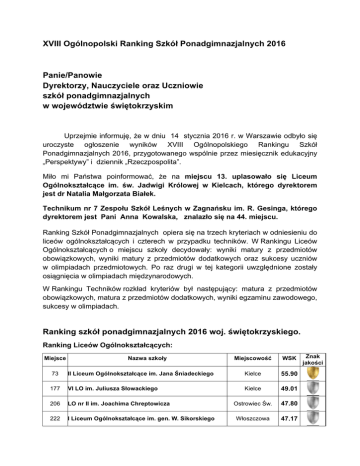 XVIII Ogólnopolski Ranking Szkół Ponadgimnazjalnych 2016 Panie/Panowie Dyrektorzy, Nauczyciele oraz Uczniowie szkół ponadgimnazjalnych w województwie świętokrzyskim Uprzejmie informuję, że w dniu 14 stycznia 2016 r. w Warszawie odbyło się uroczyste ogłoszenie wyników XVIII Ogólnopolskiego Rankingu Szkół Ponadgimnazjalnych 2016, przygotowanego wspólnie przez miesięcznik edukacyjny „Perspektywy” i dziennik „Rzeczpospolita”. Miło mi Państwa poinformować, że na miejscu 13. uplasowało się Liceum Ogólnokształcące im. św. Jadwigi Królowej w Kielcach, którego dyrektorem jest dr Natalia Małgorzata Białek. Technikum nr 7 Zespołu Szkół Leśnych w Zagnańsku im. R. Gesinga, którego dyrektorem jest Pani Anna Kowalska, znalazło się na 44. miejscu. Ranking Szkół Ponadgimnazjalnych opiera się na trzech kryteriach w odniesieniu do liceów ogólnokształcących i czterech w przypadku techników. W Rankingu Liceów Ogólnokształcących o miejscu szkoły decydowały: wyniki matury z przedmiotów obowiązkowych, wyniki matury z przedmiotów dodatkowych oraz sukcesy uczniów w olimpiadach przedmiotowych. Po raz drugi w tej kategorii uwzględnione zostały osiągnięcia w olimpiadach międzynarodowych. W Rankingu Techników rozkład kryteriów był następujący: matura z przedmiotów obowiązkowych, matura z przedmiotów dodatkowych, wyniki egzaminu zawodowego, sukcesy w olimpiadach. Ranking szkół ponadgimnazjalnych 2016 woj. świętokrzyskiego. Ranking Liceów Ogólnokształcących: Miejsce 73 Nazwa szkoły II Liceum Ogólnokształcące im. Jana Śniadeckiego 177 VI LO im. Juliusza Słowackiego 206 LO nr II im. Joachima Chreptowicza 222 I Liceum Ogólnokształcące im. gen. W. Sikorskiego Miejscowość WSK Kielce 55.90 Kielce 49.01 Ostrowiec Św. 47.80 Włoszczowa 47.17 Znak jakości Miejsce Nazwa szkoły Miejscowość WSK 272 I Liceum Ogólnokształcące im. Tadeusza Kościuszki Busko-Zdrój 44.65 278 I Liceum Ogólnokształcące im. Stefana Żeromskiego Kielce 44.29 286 I Liceum Ogólnokształcące im. Juliusza Słowackiego I Ogólnokształcące Liceum Akademickie 314 im. J. Kossakowskiej-Dębickiej 43.28 Sandomierz 43.14 Kielce 42.26 Ostrowiec Św. 42.04 373 II LO im. Marii Skłodowskiej-Curie Końskie 41.52 389 I LO im. Komisji Edukacji Narodowej Końskie 41.12 446 Liceum Ogólnokształcące w ZS im. St. Staszica Staszów 40.08 Ostrowiec Św. 39.84 Kielce 39.57 Miejscowość WSK Ostrowiec Św. 51.40 Włoszczowa 47.94 Ostrowiec Św. 44.81 241 Technikum w ZS Ponadgimnazjalnych Sędziszów 43.45 287 Technikum nr I w ZS Ponadgimnazjalnych nr I Jędrzejów 42.20 345 IV Liceum Ogólnokształcące 350 LO nr III im. Władysława Broniewskiego 455 Liceum Ogólnokształcące nr I im. St. Staszica 464 I Prywatne Liceum Ogólnokształcące Skarżysko-Kam. 44.09 Kielce 320 I Liceum Ogólnokształcące Collegium Gostomianum Znak jakości Ranking Techników: Miejsce 80 Nazwa szkoły Technikum nr 3 w ZS nr 3 129 Technikum nr I w ZS Ponadgimnazjalnych nr 2 199 Technikum nr 2 w ZS nr 2 Znak jakości Ranking Maturalny Liceów Ogólnokształcących: Miejsce 28 69 176 Nazwa szkoły Liceum Ogólnokształcące im. św. Jadwigi Królowej II Liceum Ogólnokształcące im. Jana Śniadeckiego VI Liceum Ogólnokształcące im. Juliusza Słowackiego Miejscowość Kielce Kielce Kielce Ranking Maturalny Techników: Miejsce 41 105 189 Nazwa szkoły Miejscowość Technikum nr 3 w Zespole Szkół nr 3 Technikum nr 2 w Zespole Szkół nr 2 Technikum nr 8 przy Zespole Szkół Ponadgimnazjalnych Ostrowiec Św. Ostrowiec Św. Kielce Ranking Egzaminów Zawodowych: Miejsce 10 21 55 62 Nazwa szkoły Miejscowość Technikum w Zespole Szkół Ponadgimnazjalnych Technikum nr 7 Zespół Szkół Leśnych im. R. Gesinga Technikum nr I w Zespole Szkół Ponadgimnazjalnych nr 2 Technikum w Zespole Szkół CKR im. Bolesława Chrobrego Sędziszów Zagnańsk Włoszczowa Chroberz Ranking Szkół Mistrzów: Miejsce Nazwa szkoły Miejscowość TECHNIK INFORMATYK 5 Technikum nr I w Zespole Szkół Ponadgimnazjalnych nr I Jędrzejów TECHNIK ROLNIK 1 2 4 Technikum w Zespole Szkół CKR im. Bolesława Chrobrego Technikum nr I w Zespole Szkół Ponadgimnazjalnych nr 2 Technikum nr 2 w ZSP nr 2 im. S. Roweckiego „Grota” Chroberz Włoszczowa Jędrzejów TECHNIK MECHANIK 9 Technikum w Zespole Szkół Ponadgimnazjalnych Sędziszów TECHNIK LEŚNIK 1 Technikum nr 7 Zespół Szkół Leśnych im. R. Gesinga Zagnańsk Uwaga! W zestawieniu Szkół Mistrzów pokazano szkoły, w których do egzaminu zawodowego przystąpiło minimum 10 osób. Ranking Szkół Olimpijskich: Miejsce 8 119 Nazwa szkoły Miejscowość Liceum Ogólnokształcące im. św. Jadwigi Królowej II Liceum Ogólnokształcące im. Marii Skłodowskiej-Curie Kielce Końskie Szczegółowe wyniki rankingu dostępne na stronie internetowej www.perspektywy.pl Świętokrzyski Kurator Oświaty Małgorzata Muzoł