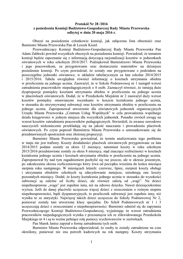 Protokół Nr 28 /2016 z posiedzenia Komisji Budżetowo-Gospodarczej Rady Miasta Przeworska odbytej w dniu 20 maja 2016 r. Obecni na posiedzeniu członkowie komisji, jak załączona lista obecności oraz Burmistrz Miasta Przeworska Pan dr Leszek Kisiel. Przewodniczący Komisji Budżetowo-Gospodarczej Rady Miasta Przeworska Pan Adam Zabłocki powitał wszystkich obecnych na posiedzeniu komisji. Powiedział, że tematem komisji będzie zapoznanie się z informacją dotyczącą racjonalizacji kosztów w jednostkach oświatowych w roku szkolnym 2016/2017. Podziękował Burmistrzowi Miasta Przeworska i jego pracownikom, za przygotowanie oraz dostarczenie materiałów na dzisiejsze posiedzenie komisji. Po czym powiedział, że zostały one przygotowane z podziałem na poszczególne jednostki oświatowe, w układzie tabelarycznym za lata szkolne 2014/2015 i 2015/2016. Tabela uwzględnia również informację o kosztach utrzymania obiektu w przeliczeniu na jednego ucznia. Zauważył, że w Szkole Podstawowej nr 1 nastąpił wzrost zatrudnienia pracowników niepedagogicznych o 8 osób. Zaznaczył również, że istnieją duże dysproporcje pomiędzy kosztami utrzymania obiektu w przeliczeniu na jednego ucznia w placówkach oświatowych. Dodał, że w Przedszkolu Miejskim nr 2 zauważył duży wzrost kosztów pomiędzy omawianymi rocznikami w koszcie kształcenia jednego ucznia, w stosunku do otrzymywanej subwencji oraz kosztów utrzymania obiektu w przeliczeniu na jednego ucznia. Zaproponował utworzenie dla oświatowych jednostek organizacyjnych Urzędu Miasta Przeworska „Centrum Usług Wspólnych” w celu prowadzenia wspólnego działu księgowości w jednym miejscu dla wszystkich jednostek. Ponadto zwrócił uwagę na wzrost kosztów zatrudnienia pracowników pedagogicznych. Stwierdził, że awanse zawodowe nauczycieli niekoniecznie przekładają się na jakość nauczania i prowadzenia placówek oświatowych. Po czym poprosił Burmistrza Miasta Przeworska o ustosunkowanie się do przedstawionych spostrzeżeń oraz złożonej propozycji. Burmistrz Miasta Przeworska powiedział, że termin analizowania tego problemu w maju nie jest trafiony. Koszty działalności placówek oświatowych przygotowane za lata 2014/2015 podane zostały za okres 12 miesięcy, natomiast koszty w roku szkolnym 2015/2016 przedstawione zostały za okres 8 miesięcy, stąd znaczące rozbieżności w kosztach kształcenia jednego ucznia i kosztach utrzymania obiektu w przeliczeniu na jednego ucznia. Zaproponował by nad tym zagadnieniem pochylić się raz jeszcze, ale w okresie jesiennym, po zakończeniu okresu rozliczeniowego który trwa od początku września do końca miesiąca sierpnia roku następnego. W miesiącach letnich: czerwiec, lipiec, sierpień koszty obsługi i utrzymania obiektów szkolnych są zdecydowanie mniejsze, uśredniają one koszty pozostałych miesięcy. Dodał, że koszty kształcenia jednego ucznia w stosunku do wysokości subwencji są zależne od liczby dzieci, ale również zależą od „wagi”. Na dzieci niepełnosprawne „waga” jest zupełnie inna, niż na zdrowe dziecko. Nawet dziesięciokrotnie wyższa. Jeśli do danej placówki uczęszcza więcej dzieci z orzeczeniem o rożnym stopniu niepełnosprawności, bądź dyspanseryjnych, to przelicznik subwencji jest zupełnie inny, niż wynika to ze statystyki. Najwięcej takich dzieci uczęszcza do Szkoły Podstawowej Nr 2, ponieważ zostały tam utworzone klasy specjalne. Do Szkół Podstawowych nr 1 i 3 uczęszczają dzieci z orzeczeniami o niepełnosprawności. Burmistrz odniósł się do zapytania Przewodniczącego Komisji Budżetowo-Gospodarczej, wyjaśniając że wzrost zatrudnienia pracowników niepedagogicznych wynika z przesunięcia ich ze zlikwidowanego Przedszkola Miejskiego nr 4 i są to woźne pełniące rolę pomocy wychowawców w zerówkach. Pan Marek Janisz zapytał o formę zatrudnienia tych osób. Burmistrz Miasta Przeworska odpowiedział, że osoby te zostały zatrudnione na czas określony, ponieważ nie zna potrzeb kadrowych na rok następny. Koszty utrzymania 1 obiektów szkolnych i w gimnazjum w roku szkolnym 2015/2016, w rozliczeniu na pełne 12 miesięcy powinny być dużo niższe. Burmistrz Miasta Przeworska powiedział, że subwencja oświatowa w 2014 roku wynosiła – 9 241 508.00 zł, w roku 2015 – 10 082 278.00 zł. Dodał, że kwota subwencji otrzymanej średnio miesięcznie na jedno dziecko w roku 2014 wynosiła 491,52 zł, a w roku 2015- 511,06 zł. Powiedział, że w przeworskich przedszkolach jest stała liczba zarówno oddziałów, jak i personelu. Przedszkola pełnią dyżury w okresie wakacyjnym. Dodał, że przedszkola są w całości finansowane przez Gminę Miejską Przeworsk. Jest tylko opłata za pobyt dziecka w placówce wg. zadeklarowanego czasu pobytu powyżej pięciu godzin lekcyjnych. Miasto finansuje pobyt dzieci w przedszkolach niepublicznych działających na zasadach przedszkoli publicznych w kwocie około 1 mln złotych rocznie. Ponadto przekazuje się dotację do przedszkoli spoza Przeworska, do których uczęszczają dzieci zamieszkujące w naszym mieście (w Łańcucie, w Zarzeczu) w wysokości w 75 % kosztów liczonych przez tamte placówki. Liczba miejsc w przeworskich oddziałach przedszkolnych pokrywa zapotrzebowanie na te dzieci. Pan Burmistrz powiedział, że podjęto szereg działań mających na celu zwiększenie oszczędności w prowadzeniu wszystkich placówek oświatowych poprzez m. in. ogłoszenie jednego przetargu na energię elektryczną dla wszystkich jednostek, ogłoszenie jednego przetargu na ubezpieczenie od następstw nieszczęśliwych wypadków dzieci i młodzieży w szkole. Dzięki podpisaniu jednej umowy polisy na obsługę wszystkich placówek oświatowych w naszym mieście uzyskano zwiększony zakres ubezpieczenia i w ciągu dwu lat zaoszczędzono około 50 000-60 000 zł. Dodał, że chce przeprowadzić wspólnie ze Starostwem Powiatowym w Przeworsku pr