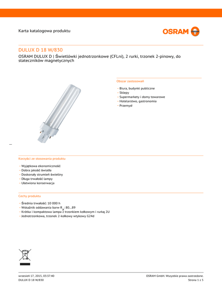 Karta katalogowa produktu DULUX D 18 W/830 OSRAM DULUX D | Świetlówki jednotrzonkowe (CFLni), 2 rurki, trzonek 2-pinowy, do stateczników magnetycznych Obszar zastosowań _ Biura, budynki publiczne _ Sklepy _ Supermarkety i domy towarowe _ Hotelarstwo, gastronomia _ Przemysł __ Korzyści ze stosowania produktu _ Wyjątkowa ekonomiczność _ Dobra jakość światła _ Doskonały strumień świetlny _ Długa trwałość lampy _ Ułatwiona konserwacja Cechy produktu _ Średnia trwałość: 10 000 h _ Wskaźnik oddawania barw R : 80…89 _ Krótka i kompaktowa lampa az trzonkiem kołkowym i rurką 2U _ Jednotrzonkowa, trzonek 2-kołkowy wtykowy G24d wrzesień 17, 2015, 03:37:40 DULUX D 18 W/830 OSRAM GmbH. Wszystkie prawa zastrzeżone. Strona 1 z 5 Karta katalogowa produktu Dane techniczne Dane elektryczne Moc znamionowy 18,0 W Moc znamionowa 18,00 W Dane fotometryczne Znamionowy strumień świetlny 1200 lm Barwa światła zgodna z EN 12464-1 LUMILUX Warm White Str. świetlny znam. w temp. otocz. 25 ° 1200 lm Znamionowy strumień świetlny 1200 lm Temperatura barwowa 3000 K Wsp. zachow. str. świetlnego po 2 000 h 0,85 Wsp. zachow. str. świetlnego po 4 000 h 0,78 Wsp. zachow. str. świetlnego po 6 000 h 0,76 Wsp. zachow. str. świetlnego po 8 000 h 0,75 Wymiary i waga __ Średnica 12,0 mm Długość całkowita 153,0 mm Długość 153,0 mm Długość zgodnie z normą IEC 140 mm Długość bez trzonka pinowego/połączenie 130,00 mm Bańka zewnętrzna T11 Średnica rury 12 mm Maksymalna średnica 11,0 mm Trwałość Znamionowa trwałość wrzesień 17, 2015, 03:37:40 DULUX D 18 W/830 10000 h OSRAM GmbH. Wszystkie prawa zastrzeżone. Strona 2 z 5 Karta katalogowa produktu Trwałość 10000 h Trwałość użytkowa 6500 h Współczynnik trwałości po 2 000 h 0,99 Współczynnik trwałości po 4 000 h 0,99 Współczynnik trwałości po 6 000 h 0,95 Współczynnik trwałości po 8 000 h 0,81 Tryb pracy LLMF/LSF 50 Hz Trwałość 10000 h 1) 1) Z CCG / LLCG Dodatkowe dane produktu Trzonek (standardowe rozwiązanie) G24d-2 Nominalna zawartość rtęci 1,3 mg Uwaga dotycząca produktu Nadaje się tylko do pracy ze statecznikiem 0,22 A Możliwości Do zastosowania w oświetleniu wew. Tak Certyfikaty i Normy __ Klasa efektywności energetycznej B Zużycie energii 23 kWh/1000h Kraj - specyficzna kategoryzacja Międzynarodowy system kodowania wrzesień 17, 2015, 03:37:40 DULUX D 18 W/830 FSQ-18/830-I-G24d-2 OSRAM GmbH. Wszystkie prawa zastrzeżone. Strona 3 z 5 Karta katalogowa produktu Rozsył światła Rozkład widmowy promieniowania __ Wyposażenie / Akcesoria _ Przeznaczone do eksploatacji z konwencjonalnymi układami zasilającymi Instrukcja bezpieczeństwa W przypadku zbicia lampy: www.osram.com/brokenlamp Opcje kontroli wrzesień 17, 2015, 03:37:40 DULUX D 18 W/830 OSRAM GmbH. Wszystkie prawa zastrzeżone. Strona 4 z 5 Karta katalogowa produktu Dane logistyczne Kod produktu Opis produktu Opakowanie (liczba produktów / opakowanie) Wymiary (długość x szerokość x wysokość) Objętość Waga brutto 4050300025704 DULUX D 18 W/830 Karton wysylkowy 10 153 mm x 174 mm x 119 mm 3.17 dm³ 645.00 g 4050300025704 DULUX D 18 W/830 Karton wysylkowy 50 368 mm x 175 mm x 184 mm 11.85 dm³ 3563.50 g Wymieniony kod produktu oznacza najmniejszą ilość produktu, jaka może być zamówiona. Jednostka transportowa może zawierać jedną sztukę lub więcej. Składając zamówienie prosimy o zamawianie ilości odpowiadających jednej lub wielokrotności jednostki transportowej. Oświadczenie Zastrzega się możliwość zmian bez uprzedzenia. Błędy i ominięcia są możliwe. Należy zawsze upewnić się czy korzystasz z najnowszej wersji katalogu. __ wrzesień 17, 2015, 03:37:40 DULUX D 18 W/830 OSRAM GmbH. Wszystkie prawa zastrzeżone. Strona 5 z 5