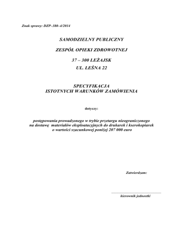 Znak sprawy: DZP–380–4/2014 SAMODZIELNY PUBLICZNY ZESPÓŁ OPIEKI ZDROWOTNEJ 37 – 300 LEśAJSK UL. LEŚNA 22 SPECYFIKACJA ISTOTNYCH WARUNKÓW ZAMÓWIENIA dotyczy: postępowania prowadzonego w trybie przetargu nieograniczonego na dostawę materiałów eksploatacyjnych do drukarek i kserokopiarek o wartości szacunkowej poniŜej 207 000 euro Zatwierdzam: ...................................................... kierownik jednostki ROZDZIAŁ I TRYB UDZIELENIA ZAMÓWIENIA Zamawiający: Samodzielny Publiczny Zespół Opieki Zdrowotnej, 37–300 LeŜajsk, ul. Leśna 22, tel./fax. (17) 240 47 23 zaprasza do składania ofert na „Dostawę materiałów eksploatacyjnych do drukarek i kserokopiarek” w trybie przetargu nieograniczonego zgodnie z przepisami ustawy z dnia 29 stycznia 2004 r. Prawo zamówień publicznych (Dz. U. z 2013 r., poz. 907 z późn. zm.) – zwanej dalej: ustawą Pzp. Wspólny Słownik Zamówień (CPV): 30192113-6, 30125110-5, 30125120-8 Adres strony internetowej: www.spzoz-lezajsk.pl ROZDZIAŁ II OPIS PRZEDMIOTU ZAMÓWIENIA 1. Szczegółowy opis przedmiotu zamówienia stanowi Załącznik Nr 2. 2. Załącznik nr 2 wymieniony w punkcie powyŜszym stanowi integralną cześć oferty. 3. Zamawiający wymaga dostarczenia oryginalnych, fabrycznie nowych, nieuŜywanych i nie uszkodzonych materiałów eksploatacyjnych, oryginalnie zapakowanych, oraz zamienników (nie dopuszcza się tonerów regenerowanych) wyprodukowanych w okresie 6 miesięcy przed dostawą do Zamawiającego. 4. Wszystkie oferowane produkty muszą być fabrycznie nowe, nie noszące śladów uszkodzeń zewnętrznych oraz uprzedniego uŜywania wyprodukowane z materiałów w 100% nowych i nieregenerowanych, wykluczające wady materiałowe w szczególności nieszczelności i mikropęknięcia. 5. Zamawiający dopuszcza moŜliwość zaproponowania produktu równowaŜnego, przez co rozumie produkt kompatybilny ze sprzętem, do którego jest zamówiony, o parametrach takich samych bądź lepszych (pojemność tuszu, tonera, wydajność i jakość wydruku) w stosunku do typu zamawianego produktu fabrycznie nowego (nowo wytworzonego w całości, pochodzącego od producenta urządzenia, do którego materiał jest przeznaczony). Produkt powinien być opisany specyfikacją produktową zawierającą podstawowe parametry techniczne. 6. W przypadku materiałów eksploatacyjnych równowaŜnych raporty z testów wystawionych przez instytucje uprawnione do kontroli jakości niezaleŜne od producenta tonerów lub tuszy potwierdzające, Ŝe podana wydajność jest wynikiem przeprowadzenia testów zgodnie z normą ISO/IEC 19752 (w przypadku monochromatycznych drukarek laserowych), ISO/IEC 24711 (w przypadku tuszy do drukarek atramentowych) i ISO/IEC 19798 (w przypadku tonerów do kolorowych drukarek laserowych). 7. Dostarczone materiały eksploatacyjne: 1) nie mogą powodować utraty gwarancji na urządzenia, do którego są przeznaczone. Wykonawca bierze na siebie pełną odpowiedzialność za uszkodzenie sprzętu spowodowane uŜywaniem zaoferowanych materiałów, 2) nie mogą ujemnie wpływać na jakość wydruków, brudzić wydruków (tj. poza tekstem, tabelami, wykresami itp. na wydruku nie mogą znajdować się niepoŜądane kropki, plamki, kreski, smugi itp.), 3) wydruki muszą być o jednakowej jakości, ostrości i kontraście, 4) proszek znajdujący się w tonerach nie moŜe się wysypywać, 5) nie mogą ujemnie wpływać na jakość pracy podzespołów urządzeń drukujących (tj. powodować zgrzytów/pisków oraz zanieczyszczeń urządzenia, 6) powinny zapewniać jakość wydruku w opcjach systemu Windows: wersję oszczędną, normalną i dokładną, rozróŜnialną wzrokowo, 2 7) nie mogą naruszać praw patentowych, ani własności intelektualnej producentów urządzeń drukujących. 8. Dostarczone przez Wykonawcę materiały eksploatacyjne winny posiadać znak firmowy producenta, etykiety zawierające numer katalogowy oraz termin waŜności a takŜe nienaruszone plomby i cechy pierwotnego opakowania. 9. Gwarancja będzie obowiązywała od momentu instalacji materiału eksploatacyjnego w danym urządzeniu do całkowitego wyczerpania produktu. 10. W przypadku, gdy materiał oryginalny posiada układ elektroniczny (chip) przekazujący informacje o stanie zuŜycia tuszu lub tonera, oferowany materiał równowaŜny musi posiadać analogiczny układ, tak samo działający. 11. W załączniku Nr 2 do SIWZ, w pozycjach zaznaczonych kolorem niebieskim wymaga się aby materiały eksploatacyjne były materiałami oryginalnymi czyli pochodzącymi od producenta urzadzenia. 12. Wykonawca zobowiązuje się w ramach ceny oferty do odbioru na własny koszt, wszystkich zuŜytych materiałów eksploatacyjnych dostarczonych wcześniej do Zamawiającego i podania ich recyklingowi lub utylizacji na własny koszt, co najmniej raz w miesiącu. Odbiór musi nastąpić w ciągu 3 dni roboczych od dnia zgłoszenia. Wykonawca potwierdzi Zamawiającemu odbiór kartą odbioru odpadu, zgodnie z obowiązującymi przepisami prawa w tym zakresie. ROZDZIAŁ III TERMIN WYKONANIA ZAMÓWIENIA Termin realizacji zamówienia – 12 miesięcy od dnia podpisania umowy. ROZDZIAŁ IV WARUNKI UDZIAŁU W POSTĘPOWANIU ORAZ OPIS SPOSOBU DOKONYWANIA OCENY SPEŁNIANIA TYCH WARUNKÓW 1. W postępowaniu mogą wziąć udział Wykonawcy, którzy spełniają warunki, dotyczące: 1) posiadania uprawnień do wykonywania określonej działalności lub czynności, jeŜeli przepisy prawa nakładają obowiązek ich posiadania; 2) posiadania wiedzy i doświadczenia; 3) dysponowania odpowiednim potencjałem technicznym oraz osobami zdolnymi do wykonania zamówienia; 4) sytuacji ekonomicznej i finansowej. 2. W postępowaniu mogą wziąć udział Wykonawcy, którzy spełniają warunek udziału w postępowaniu dotyczący braku podstaw do wykluczenia z postępowania o udzielenie zamówienia publicznego w okolicznościach, o których mowa w art. 24 ust. 1 ustawy Pzp oraz w art. 24 ust.