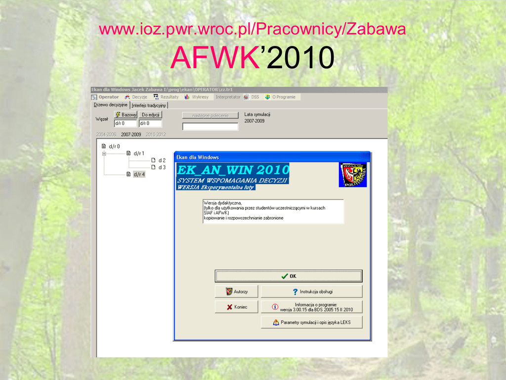 www.ioz.pwr.wroc.pl/Pracownicy/Zabawa AFWK’2010 AFWK’2010: zasady • Prezentacja - poprawa zestawu (czyli przygotowanie konkurencyjnego wariantu) pod względem zysku netto i sprzedaży (wyrażonej w złotych) – okres 2010-2012, poprawiać można tylko górną część macierzy zmiennych decyzyjnych 9 wierszy x 3 kolumny; • Przygotowanie narzędzia wspomagającego analizę wybranego zagadnienia w analizie finansowej „Analizator sytuacji finansowej”; zadanie wykonywane w parach. Orientacyjna tematyka – materiały edukacyjne ze strony www.tf.pl. Szczegóły w czasie zajęć nr 2. • Wyścig szczurów (gra kierownicza,); zadanie wykonywane w parach; Wagi rankingu do wyścigu szczurów: 5,4,3,2,1,1,1,1,1 pod uwagę jest brana wartość na koniec roku 2015 („wynik syntetyczny”). Uwaga – nie ma ograniczeń na wartości zmiennych decyzyjnych dla lat 2010-2015 (oprócz wbudowanych w program). •„Małe” zadanie domowe (do rozwiązania w Excelu) – z reguły do oddania na zajęciach następujących po rozdaniu tematów. Równoważne jest przygotowanie prezentacji z systemów wspomagających analizy finansowe lub prezentacji zastosowań arkusza kalkulacyjnego na podstawie literatury w jęz. angielskim (dla maks. 2 grup). Poszczególne zadania z reguły wykonywane są w parach. W przypadku konieczności (nieparzysta liczba osób w grupie zajęciowej) wykonywania któregoś z zadań w grupie trzyosobowej – inny regulamin zaliczeń (aby starać się o ocenę >= 4,0 - zaliczenie kartkówki z podstaw analizy finansowej w pierwszym podejściu albo „Analizator” z możliwością wykonywania analiz porównawczych). AFWK’2010: zasady • Warunek zaliczenia – wszystkie zadania ocenione pozytywnie • Punkty za zadania: Pierwsza prezentacja – do 2 punktów Analizator – do 12 punktów „Małe zadanie domowe” – do 5 punktów Gra „Wyścig szczurów” – punktacja „zaliczająca” od 1 do 5 punktów (wynika z miejsca w rankingu) • Można zdobyć punkty za aktywność • Bardzo ważna terminowość i obecność na zajęciach Terminy zajęć Terminy zajęć PN PA: 22.02, 8.03, 22.03, 29.03, 19.04, 17.05, 31.05, 14.06 (1 godzina) WT PA: 23.02, 9.03, 23.03, 30.03, 20.04, 4.05, 18.05, 15.06 (1 godzina) PN NP: 1.03, 15.03, 12.04, 26.04, 10.05, 24.05, 7.06, 14.06 (2 godzina) AFWK: 1 zajęcia • Obsługa programu Ekanwin (budowanie drzew decyzyjnych, wprowadzanie danych, oglądanie sprawozdań) • Uwagi techniczne do procesu instalacji Ekanwin • Wprowadzanie sprawozdań Ekanwin do programu MS Word; tworzenie zestawu sprawozdań do drukowania; Uwaga: na następne zajęcia proszę przynosić wydruk sprawozdań dla swoich zmiennych decyzyjnych • Zasady zaliczenia WWW: www.ioz.pwr.wroc.pl/Pracownicy/Zabawa e-mail: [email protected] Wybierz tydzień parzysty nieparzysty Plan zajęć dla tygodnia parzystego AFWK: 2 zajęcia TP • • • • • • Przedstawienie „poprawionych” zestawów; manipulować można zamówieniami surowców, zleceniami produkcyjnymi i cenami wyrobów gotowych. Celem jest ok. 5% poprawa zysku netto (jeśli był zerowy to jego wykazanie zysku netto) oraz sprzedaży (też 5%) a także krótkie przedstawienie perspektywy dalszej poprawy. Przygotować proszę: krótką prezentację – 5 minut (2 strony w MS Word z początkowymi i finalnymi parametrami + pliki drzewa (*.sir oraz *.tr1). Uwaga: rozwiązania proszę przysłać poprzedniego dnia drogą elektroniczną ([email protected]) w formacie zip a nie rar. Rozwiązania przyniesione dopiero na zajęcia będą niestety oceniane niżej. Każda grupa – krótka prezentacja przyjętej strategii i jej efektów. Wskazane krótkie opracowanie w formie wydruku (do oddania na trzecich zajęciach) Wybór zakresu merytorycznego dla „Analizatora sytuacji finansowej” Wprowadzenie do Visual Basic dla Aplikacji w Excelu, omówienie procedury wczytującej sprawozdania finansowe z Ekanwina do Excela AFWK : 3 zajęcia TP • Dostarczenie wydruków z pierwszą prezentacją. • Krótka dyskusja o różnicach w poszczególnych zestawach decyzyjnych – proszę przynieść wydruki kompletu sprawozdań! • Wprowadzenie do Visual Basic dla Aplikacji w Excelu, omówienie procedury wczytującej sprawozdania finansowe z Ekanwina do Excela – ciąg dalszy. • Każda grupa 2-osobowa przedstawia wykaz (listę) sprawozdań potrzebnych do wczytywania i pokazuje na koniec zajęć, że potrafi zmodyfikować odpowiednio procedurę wczytującą. • Jeśli zostanie trochę czasu to wprowadzenie do zajęć nr 4 (modelowanie wartości pieniądza w czasie) AFWK : 4 i 5 zajęcia TP • • • • • Kontynuacja poprzednich zajęć: Zastosowanie bardziej zaawansowanych możliwości MS Excel: paski przewijania (w celu zdynamizowania analiz), nadawanie nazw zakresom komórek, wykresy. Orientacyjny zakres merytoryczny – „wartość pieniądza w czasie”, „modelowanie metod amortyzacji”. Prezentacje – (dla wybierających tę formę) równoważnika „małych zadań domowych” oraz przydzielenie tematów „małego zadania domowego nr 1 i nr 2” do wykonania w Excelu Uwaga: Termin oddania (plik e-mailem + wydruk sprawozdania) „małych zadań domowych” – pierwsze zajęcia po rozdaniu tematów danego zadania AFWK : 6 zajęcia TP • Prace nad analizatorem sytuacji ekonomicznej przedsiębiorstwa Omega • Prace nad grą „wyścig szczurów” • Krótka prezentacja (przy komputerze) bieżącego etapu konstruowania analizatora AFWK : 7 zajęcia TP • Oddanie gry „wyścig szczurów” (pliki + wydruk – szczegóły reguł punktacji podane będą w trakcie semestru) – grupa WT PA 9 – 1 czerwca, w godzinach konsultacji jak WT PA • Prace nad analizatorem sytuacji ekonomicznej przedsiębiorstwa Omega • Poprawa (niezaliczonych) „małych zadań domowych” AFWK : 8 zajęcia TP (przedostatni i ostatni dzień przed sesją), zajęcia trwające jedną godzinę • Termin oddania „Analizatorów” – 7 i
