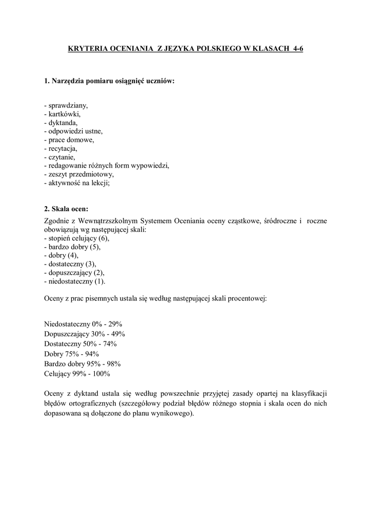 KRYTERIA OCENIANIA Z JĘZYKA POLSKIEGO W KLASACH 4-6 1. Narzędzia pomiaru osiągnięć uczniów: - sprawdziany, - kartkówki, - dyktanda, - odpowiedzi ustne, - prace domowe, - recytacja, - czytanie, - redagowanie różnych form wypowiedzi, - zeszyt przedmiotowy, - aktywność na lekcji; 2. Skala ocen: Zgodnie z Wewnątrzszkolnym Systemem Oceniania oceny cząstkowe, śródroczne i roczne obowiązują wg następującej skali: - stopień celujący (6), - bardzo dobry (5), - dobry (4), - dostateczny (3), - dopuszczający (2), - niedostateczny (1). Oceny z prac pisemnych ustala się według następującej skali procentowej: Niedostateczny 0% - 29% Dopuszczający 30% - 49% Dostateczny 50% - 74% Dobry 75% - 94% Bardzo dobry 95% - 98% Celujący 99% - 100% Oceny z dyktand ustala się według powszechnie przyjętej zasady opartej na klasyfikacji błędów ortograficznych (szczegółowy podział błędów różnego stopnia i skala ocen do nich dopasowana są dołączone do planu wynikowego). 3. Zasady bieżącego oceniania ucznia: - sprawdziany są zapowiadane z tygodniowym wyprzedzeniem. Termin zostaje wpisany do dziennika LIBRUS. Sprawdzian jest poprzedzony lekcją powtórzeniową, do której uczeń ma obowiązek się przygotować. - kartkówki obejmują materiał z ostatniej lekcji (kartkówka nie jest zapowiadana) lub z 2-3 lekcji (kartkówka wtedy jest zapowiadana i wpisywana do dziennika LIBRUS) - każdy uczeń w ciągu semestru może być trzy razy nieprzygotowany (brak zeszytu, podręcznika zeszytu ćwiczeń), musi to jednak zgłosić na początku lekcji, może także w ciągu semestru zgłosić trzy razy brak zadania (z wyjątkiem prac zadanych z wyprzedzeniem, np. tygodniowym, dwutygodniowym). Każde następne nieprzygotowanie traktowane jest, jako ocena niedostateczna. - jeśli z przyczyn losowych uczeń nie może pisać sprawdzianu lub kartkówki z całą klasą ma obowiązek uczynić to w terminie dwóch tygodni poza godzinami lekcyjnymi w porozumieniu z nauczycielem przedmiotu. Jeśli uczeń tego nie uczyni otrzymuje odpowiednio z kartkówki lub sprawdzianu ocenę niedostateczną. - w przypadku celowego unikania pisania sprawdzianu lub kartkówki (wagary) lub w przypadku odmowy przez ucznia pisania sprawdzianu (kartkówki) mimo jego obecności na zajęciach uczeń otrzymuje ocenę niedostateczną. 4. Zasady ustalania oceny śródrocznej i rocznej: - przy wystawianiu oceny śródrocznej i rocznej obowiązuje następująca hierarchia ocen: 1. Sprawdziany i testy 2. Kartkówki 3. Dyktanda 4. Ocena z odpowiedzi 5. Zadania domowe 6. Aktywność na lekcji 7. Pozostałe oceny - podstawą do wystawienia ocen śródrocznych i rocznych nie jest średnia arytmetyczna, - ocenę roczną wystawia się na podstawie ocen cząstkowych uzyskanych w drugim półroczu oraz w oparciu o ocenę śródroczną 5. Wymagania edukacyjne na poszczególne oceny: Stopień celujący (6) – może otrzymać uczeń, który: - pracował systematycznie oraz z dużym zaangażowaniem na każdej lekcji i w domu; - wykazywał się inwencją twórczą; - biegle posługiwał się zdobytymi wiadomościami w rozwiązywaniu problemów teoretycznych lub praktycznych z programu nauczania danej klasy; - wykazywał się indywidualną pracą wykraczającą poza realizowany program; - jest oczytany (czyta nie tylko lektury); - reprezentował klasę, szkołę w konkursach przedmiotowych, np. w polonistycznym, ortograficznym, recytatorskim itp. kwalifikując się do dalszego etapu. Stopień bardzo dobry (5) – otrzymuje uczeń, który: - pracował systematycznie z zaangażowaniem na każdej lekcji i w domu; - wykazał się wiedzą i umiejętnościami na poziomie ponadpodstawowym, o znacznym stopniu trudności; - wszystkie zadania wykonywał w terminie. Stopień dobry (4) – otrzymuje uczeń, który: - pracował systematycznie na każdej lekcji i w domu; - opanował umiejętności umiarkowanie trudne, ale i niezbędne w dalszej nauce; - poprawnie stosował wiadomości, wykonywał nietypowe zadania teoretyczne i praktyczne; - wykonywał zadania w terminie określonym przez nauczyciela a także uzupełniał ewentualne braki. Stopień dostateczny (3) – otrzymuje uczeń, który: - pracował w miarę systematycznie i doskonalił w sobie tę cechę; - opanował wiadomości i umiejętności z języka polskiego na poziomie podstawowym; - umie zastosować zdobyte wiadomości w sytuacjach typowych, wg poznanego wzorca. Stopień dopuszczający (2) – otrzymuje uczeń, który: - wykazał się znajomością treści całkowicie niezbędnych w dalszym zdobywaniu wiedzy z języka polskiego; - wykonywał samodzielnie lub z niewielką pomocą nauczyciela zadania typowe, wyćwiczone na lekcji, o niewielkim stopniu trudności. Stopień niedostateczny (1) – otrzymuje uczeń, który: - nie opanował wiadomości i umiejętności elementarnych, a stwierdzone braki uniemożliwiają dalsze zdobywanie wiedzy z języka polskiego; - nie umie wykonać zadań o niewielkim stopniu trudności nawet z pomocą nauczyciela. Szczegółowy wykaz wiadomości i umiejętności znajduje się w planie wynikowym dla danej klasy i jest do wglądu u nauczyciela przedmiotu lub w gabinecie wicedyrektorów. 6. Zasady bieżącego poprawiania ocen cząstkowych: - każdy uczeń ma prawo do poprawy ocen niedostatecznych, dopuszczających i dostatecznych z prac pisemnych (sprawdzianów i kartkówek) w terminie dwóch tygodni od daty otrzymania oceny - poprawa oceny niedostatecznej, dopuszczającej i dostatecznej z dyktanda jest możliwa podczas kolejnego dyktanda - uczeń, który w terminie nie poprawi oceny traci prawo do jej poprawy - uczeń dokonuje poprawy ocen na zajęciach dodatkowych lub na lekcji - każda ocena z poprawy zapisywana jest w dzienniku LIBRUS Monika Kuta Danuta Wosz Renata Zbroińska