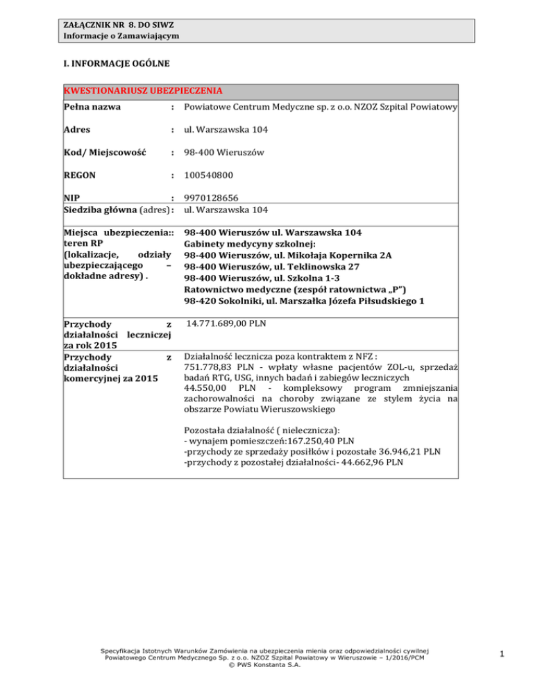 ZAŁĄCZNIK NR 8. DO SIWZ Informacje o Zamawiającym I. INFORMACJE OGÓLNE KWESTIONARIUSZ UBEZPIECZENIA Pełna nazwa : Powiatowe Centrum Medyczne sp. z o.o. NZOZ Szpital Powiatowy Adres : ul. Warszawska 104 Kod/ Miejscowość : 98-400 Wieruszów REGON : 100540800 NIP : Siedziba główna (adres) : 9970128656 ul. Warszawska 104 Miejsca ubezpieczenia:: teren RP (lokalizacje, odziały ubezpieczającego – dokładne adresy) . 98-400 Wieruszów ul. Warszawska 104 Gabinety medycyny szkolnej: 98-400 Wieruszów, ul. Mikołaja Kopernika 2A 98-400 Wieruszów, ul. Teklinowska 27 98-400 Wieruszów, ul. Szkolna 1-3 Ratownictwo medyczne (zespół ratownictwa „P”) 98-420 Sokolniki, ul. Marszałka Józefa Piłsudskiego 1 Przychody z działalności leczniczej za rok 2015 Przychody z działalności komercyjnej za 2015 14.771.689,00 PLN Działalność lecznicza poza kontraktem z NFZ : 751.778,83 PLN - wpłaty własne pacjentów ZOL-u, sprzedaż badań RTG, USG, innych badań i zabiegów leczniczych 44.550,00 PLN - kompleksowy program zmniejszania zachorowalności na choroby związane ze stylem życia na obszarze Powiatu Wieruszowskiego Pozostała działalność ( nielecznicza): - wynajem pomieszczeń:167.250,40 PLN -przychody ze sprzedaży posiłków i pozostałe 36.946,21 PLN -przychody z pozostałej działalności- 44.662,96 PLN Specyfikacja Istotnych Warunków Zamówienia na ubezpieczenia mienia oraz odpowiedzialności cywilnej Powiatowego Centrum Medycznego Sp. z o.o. NZOZ Szpital Powiatowy w Wieruszowie – 1/2016/PCM © PWS Konstanta S.A. 1 Opis prowadzonej: działalności: (dokładny opis, proszę wymienić wszystkie rodzaje działalności, które mają zostać objęte ubezpieczeniem). PKD : EKD : Nr KRS Data rejestracji Nr księgi rejestrowej Data wpisu do rejestru pod. L. Data rozpoczęcia działalności Przedsiębiorstwa podmiotu leczniczego Zakres prowadzonej działalności: udzielanie świadczeń zdrowotnych- lecznictwo otwarte i lecznictwo zamknięte (oddziały: pediatryczny, chorób wewnętrznych), chirurgia jednego dnia, izba przyjęć, poradnie: chirurgiczna, ortopedyczna, ginekologiczno-położnicza, diabetologiczna, neurologiczna, okulistyczna, dermatologiczna, gruźlicy i chorób płuc, zdrowia psychicznego, psychologiczna, pracowni: USG, EKG, endoskopii, diagnostyki obrazowej, fizykoterapii, kinezyterapii, fizjoterapii, poradnia rehabilitacyjna, gabinet medycyny szkolnej, pielęgniarka epidemiologiczna, Zakład Opiekuńczo-Leczniczy, hospicjum domowe, kuchnia szpitalna, administracja Ratownictwo Medyczne (gabinet lekarza POZ, gabinet pielęgniarki i położnej środowiskowej, gabinet zabiegowy, zespół transportu sanitarnego, Zespół ratownictwa medycznego „P”, Zespół ratownictwa medycznego „S” ) Działalność komercyjna: 1. Działalność lecznicza poza kontraktem z NFZ :wpłaty własne pacjentów ZOL-u, sprzedaż badań RTG, USG, innych badań i zabiegów leczniczych, kompleksowy program zmniejszania zachorowalności na choroby związane ze stylem życia na obszarze Powiatu Wieruszowskiego 2. Pozostała działalność ( nielecznicza): wynajem pomieszczeń, sprzedaży posiłków, pozostała działalności 8610 Szpitalnictwo 8610 Szpitalnictwo 0000309670 04.07.2008r. 00000002235 20.08.2008r. od 01-09-2008r. 1. Oddziały szpitalne – REGON: 10054080000052 2. Ambulatoryjna Opieka Specjalistyczna - REGON: 10054080000077 3. Zakład Opiekuńczo-Leczniczy – Regon: REGON: 10054080000060 4. Zespoły Wyjazdowe – Regon: REGON: 10054080000084 II. Dane do oceny ryzyka Rodzaje wykonywanych usług 1. Porady lekarskie - tak, 2. Wizyty domowe - tak, 3. Zabiegi –tak – chirurgia jednego dnia 4. Pogotowie ratunkowe - tak, 5. Lecznictwo otwarte - tak, 6. Lecznictwo zamknięte - tak, 7. Transport chorych - tak, 8. Stacja krwiodawstwa - nie, 9. Konsultacje - tak, 10. Stacja dializ - nie, 11. Laboratorium analityczne - nie 12. Badania diagnostyczne: - pracownia rentgenowska - tak - pracownia USG - tak - tomograf - nie Specyfikacja Istotnych Warunków Zamówienia na ubezpieczenia mienia oraz odpowiedzialności cywilnej Powiatowego Centrum Medycznego Sp. z o.o. NZOZ Szpital Powiatowy w Wieruszowie – 1/2016/PCM © PWS Konstanta S.A. 2 - EKG- tak, EEG - nie - Inne ( proszę wymienić):Liczba pacjentów przyjętym w roku 2015: Lecznictwo otwarte. 33101 Lecznictwo zamknięte. 1811 Liczba lekarzy pracujących: Na umowę o pracę: 0 Kontrakty i inne: 52 Liczba lekarzy wykonujących zabiegi: Liczba lekarzy 10 I stopień specjalizacji 11 Inny personel Inne zatrudnione osoby: Ilość łóżek w 2015 r II stopień specjalizacji 14 Liczba Specjaliści Pielęgniarki: Położne: Technik analityki medycznej: Technik RTG: Technik farmacji: Technik fizjoterapeuta: Inny średni: Sanitariusze: Salowe Administracja, kierowcy, gospodarczy: 79 14 52 1 4 1 2 21 10 Czy ZOZ posiada OIOM TAK / NIE Liczba łóżek Czy ZOZ posiada odział ginekologiczno – położniczy Ilość przyjętych porodów: 2012 r. Czy oddział ginekologiczno – położniczy posiada inkubatory: Czy odział ginekologiczno – położniczy : TAK / NIE Liczba łóżek: 0 TAK / NIE DOTYCZY Liczba: Posiada salę operacyjna do wykonywania cesarskiego cięcia Ma zapewniony 24 h dyżur anestezjologiczny: Liczba zabiegów złożonych przeprowadzonych: 2015 r. : 0 Czy w ZOZ wykonywane są: - operacje chirurgii plastycznej: - eksperymenty medyczne: NIE NIE Czy ZOZ posiada Aptekę szpitalną Dział farmacji szpitalnej Własną kuchnię 24 TAK / NIE DOTYCZY TAK /NIE DOTYCZY NIE TAK TAK OBOWIĄZUJĄCE W SZPITALU : Specyfikacja Istotnych Warunków Zamówienia na ubezpieczenia mienia oraz odpowiedzialności cywilnej Powiatowego Centrum Medycznego Sp. z o.o. NZOZ Szpital Powiatowy w Wieruszowie – 1/2016/PCM © PWS Konstanta S.A. 3 PROCEDURY: wszystkie wymagane w szpitalnictwie SZPITAL POSIADA - AKREDYTACJĘ , ISO : Szpital Posiada Certyfikat Systemu Zarządzania Jakością wg normy ISO 9001: 2008, szpital posiada akredytację. INFORMACJE DODATKOWE 