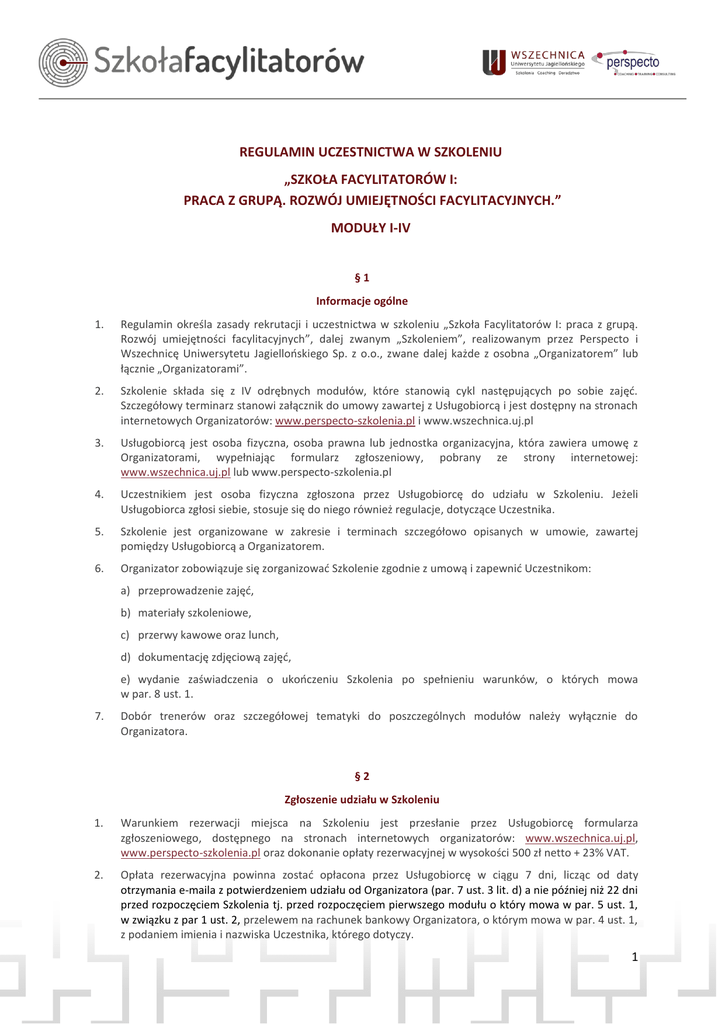 REGULAMIN UCZESTNICTWA W SZKOLENIU „SZKOŁA FACYLITATORÓW I: PRACA Z GRUPĄ. ROZWÓJ UMIEJĘTNOŚCI FACYLITACYJNYCH.” MODUŁY I-IV §1 Informacje ogólne 1. Regulamin określa zasady rekrutacji i uczestnictwa w szkoleniu „Szkoła Facylitatorów I: praca z grupą. Rozwój umiejętności facylitacyjnych”, dalej zwanym „Szkoleniem”, realizowanym przez Perspecto i Wszechnicę Uniwersytetu Jagiellońskiego Sp. z o.o., zwane dalej każde z osobna „Organizatorem” lub łącznie „Organizatorami”. 2. Szkolenie składa się z IV odrębnych modułów, które stanowią cykl następujących po sobie zajęć. Szczegółowy terminarz stanowi załącznik do umowy zawartej z Usługobiorcą i jest dostępny na stronach internetowych Organizatorów: www.perspecto-szkolenia.pl i www.wszechnica.uj.pl 3. Usługobiorcą jest osoba fizyczna, osoba prawna lub jednostka organizacyjna, która zawiera umowę z Organizatorami, wypełniając formularz zgłoszeniowy, pobrany ze strony internetowej: www.wszechnica.uj.pl lub www.perspecto-szkolenia.pl 4. Uczestnikiem jest osoba fizyczna zgłoszona przez Usługobiorcę do udziału w Szkoleniu. Jeżeli Usługobiorca zgłosi siebie, stosuje się do niego również regulacje, dotyczące Uczestnika. 5. Szkolenie jest organizowane w zakresie i terminach szczegółowo opisanych w umowie, zawartej pomiędzy Usługobiorcą a Organizatorem. 6. Organizator zobowiązuje się zorganizować Szkolenie zgodnie z umową i zapewnić Uczestnikom: a) przeprowadzenie zajęć, b) materiały szkoleniowe, c) przerwy kawowe oraz lunch, d) dokumentację zdjęciową zajęć, e) wydanie zaświadczenia o ukończeniu Szkolenia po spełnieniu warunków, o których mowa w par. 8 ust. 1. 7. Dobór trenerów oraz szczegółowej tematyki do poszczególnych modułów należy wyłącznie do Organizatora. §2 Zgłoszenie udziału w Szkoleniu 1. Warunkiem rezerwacji miejsca na Szkoleniu jest przesłanie przez Usługobiorcę formularza zgłoszeniowego, dostępnego na stronach internetowych organizatorów: www.wszechnica.uj.pl, www.perspecto-szkolenia.pl oraz dokonanie opłaty rezerwacyjnej w wysokości 500 zł netto + 23% VAT. 2. Opłata rezerwacyjna powinna zostać opłacona przez Usługobiorcę w ciągu 7 dni, licząc od daty otrzymania e-maila z potwierdzeniem udziału od Organizatora (par. 7 ust. 3 lit. d) a nie później niż 22 dni przed rozpoczęciem Szkolenia tj. przed rozpoczęciem pierwszego modułu o który mowa w par. 5 ust. 1, w związku z par 1 ust. 2, przelewem na rachunek bankowy Organizatora, o którym mowa w par. 4 ust. 1, z podaniem imienia i nazwiska Uczestnika, którego dotyczy. 1 3. Opłata rezerwacyjna jest zaliczana na poczet ceny całego Szkolenia, z tym że w przypadku płatności w ratach, zaliczenie następuje na poczet pierwszej raty. 4. Zgłoszenie na Szkolenie może zostać złożone w następujących formach: a) pocztą elektroniczną, b) faksem, c) osobiście, d) pocztą tradycyjną. 5. Zgłoszenie dotyczy jednej pełnej edycji Szkolenia, realizowanej w terminach określonych na stronach Organizatorów www.wszechnica.uj.pl oraz www.perspecto-szkolenia.pl par. 1 ust. 4. 6. Liczba uczestników w jednej edycji Szkolenia nie może przekroczyć 16 osób. 7. O wpisaniu na listę Uczestników, decyduje kolejność dokonywania opłat rezerwacyjnych, przy czym rozstrzygająca jest data uznania rachunku bankowego Organizatora. Organizatorzy informują Usługobiorcę o wpisie zgłoszonej osoby na listę Uczestników niezwłocznie, za pośrednictwem poczty elektronicznej na wskazany w zgłoszeniu adres e-mail. 8. Osoba dokonująca prawidłowego zgłoszenia po osiągnięciu limitu osób na daną edycję Szkolenia, zostaje powiadomiona o tym fakcie i ma prawo do wyboru jednej z poniższych opcji: a) żądanie zwrotu opłaty rezerwacyjnej, przy czym par. 3 ust. 5 stosuje się odpowiednio, b) wpisanie na listę rezerwacyjną. 9. Warunkiem wzięcia udziału w Szkoleniu jest pozytywne zaliczenie rozmowy wstępnej, służącej weryfikacji oczekiwań i zdolności komunikacyjnych Uczestnika zgodnie z par. 7 ust. 3. Rozmowa wstępna odbywa się z udziałem Uczestnika i przedstawicieli Organizatora. 10. Uczestnik który nie zaliczy pozytywnie rozmowy wstępnej, zostaje o tym fakcie powiadomiony, a opłata rezerwacyjna zostaje mu zwrócona. 11. Jeżeli przed rozpoczęciem Szkolenia którykolwiek z Uczestników zrezygnuje z udziału lub nie otrzyma potwierdzenia udziału po rozmowie wstępnej, osoba znajdująca się na pierwszym miejscu na liście rezerwacyjnej, automatycznie wstępuje na jego miejsce, o czym zostanie niezwłocznie poinformowana za pośrednictwem poczty elektronicznej na wskazany w zgłoszeniu adres e-mail, wraz z wyznaczeniem terminu do dokonania opłaty za Szkolenie. O wstąpieniu na miejsce rezygnującego Uczestnika, decyduje kolejność wpisów na listę rezerwacyjną. 12. Jeżeli nikt z Uczestników nie zrezygnuje z udziału w Szkoleniu przed jego rozpoczęciem, opłata rezerwacyjna będzie zwracana osobom wpisanym na listę rezerwacyjną. §3 Rezygnacja z udziału i odwołanie Szkolenia 1. W przypadku zgłoszenia rezygnacji z udziału w Szkoleniu najpóźniej do 15 dni przed wyznaczonym terminem Szkolenia, opłata rezerwacyjna zostanie w całości zwrócona Usługobiorcy, przy czym par. 3 ust. 5 stosuje się odpowiednio. 2. W przypadku odstąpienia od umowy/rezygnacji ze Szkolenia przez którąkolwiek ze Stron, Organizator zwraca Usługobiorcy wszelkie wniesione przez niego opłaty pomniejszone o zakres wyświadczonych usług do dnia odstąpienia oraz proporcjonalne koszty poniesione przez Organizatora. Organizator na żądanie Usługobiorcy zobowiązany jest do przedstawienia mu stosownego rozliczenia w tym zakresie. 3. Organizator zastrzega sobie prawo do odwołania lub zmiany terminu Szkolenia: a) z przyczyn od niego niezależnych, spowodowanych tzw. siłą wyższą, 2 b) w terminie 14 dni przed rozpoczęciem szkolenia w przypadku niewystarczającej liczby