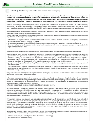 Powiatowy Urząd Pracy w Katowicach http://pup.katowice.pl/strona/refundacja-kosztow-wyposażenia-lub-doposażenia-stanowiska-pracy/295 Refundacja kosztów wyposażenia lub doposażenia stanowiska pracy O refundację kosztów wyposażenia lub doposażenia stanowiska pracy dla skierowanego bezrobotnego może ubiegać się podmiot prowadzący działalność gospodarczą, niepubliczne przedszkole, niepubliczna szkoła lub producent rolny. Refundacja poniesionych kosztów wyposażenia lub doposażenia stanowiska pracy może nastąpić do wysokości 6 – krotnego przeciętnego wynagrodzenia, obowiązującego na dzień podpisania umowy. Podmiot prowadzący działalność gospodarczą, niepubliczne przedszkole, niepubliczna szkoła lub producent rolny, zamierzający wyposażyć lub doposażyć stanowisko pracy dla skierowanego bezrobotnego może złożyć wniosek do urzędu pracy właściwego ze względu na siedzibę podmiotu lub miejsce wykonywania pracy przez skierowanego bezrobotnego. Podstawą refundacji kosztów wyposażenia lub doposażenia stanowiska pracy dla skierowanego bezrobotnego jest umowa zawarta w formie pisemnej pod rygorem nieważności. Umowa zawiera w szczególności zobowiązanie podmiotu prowadzącego działalność gospodarczą, niepublicznego przedszkola, niepublicznej szkoły lub producenta rolnego do: ● ● ● zatrudnienia na wyposażonym lub doposażonym stanowisku pracy w pełnym wymiarze czasu pracy skierowanego bezrobotnego przez okres co najmniej 24 miesięcy, utrzymania przez okres co najmniej 24 miesięcy stanowisk pracy utworzonych w związku z przyznaną refundacją, złożenia rozliczenia zawierającego zestawienie kwot wydatkowanych zgodnie z przeznaczeniem na wyposażenie lub doposażenie stanowiska pracy. Refundacja kosztów wyposażenia lub doposażenia stanowiska pracy dla skierowanego bezrobotnego następuje po: 1. przedłożeniu przez podmiot prowadzący działalność gospodarczą, niepubliczne przedszkole, niepubliczną szkołę lub producenta rolnego rozliczenia zawierającego zestawienie kwot wydatkowanych zgodnie z przeznaczeniem od dnia zawarcia umowy na wyposażenie lub doposażenie stanowiska pracy oraz przedstawienie oryginałów (do wglądu) i kserokopii faktur lub rachunków wraz z potwierdzeniem dokonania zapłaty. Zestawienie, o którym mowa nie może zawierać wydatków, na finansowanie których Wnioskodawca otrzymał wcześniej środki publiczne, 2. przeprowadzeniu przez Powiatowy Urząd Pracy w Katowicach kontroli utworzonego stanowiska pracy, jego wyposażenia lub doposażenia, 3. zatrudnieniu przez podmiot prowadzący działalność gospodarczą, niepubliczne przedszkole, niepubliczną szkołę lub producenta rolnego skierowanego bezrobotnego i przekazaniu Urzędowi kopii umowy o pracę w terminie 3 dni od dnia zawarcia umowy o pracę. Urząd przeprowadza kontrolę utworzonego stanowiska pracy, jego wyposażenia lub doposażenia przed skierowaniem osoby bezrobotnej i dokonaniem wypłaty refundacji. Refundacja następuje po spełnieniu powyższych warunków, weryfikacji przedłożonego Urzędowi rozliczenia zawierającego zestawienie kwot wydatkowanych na wyposażenie lub doposażenie stanowiska pracy oraz spełnieniu innych warunków umowy, w terminie 14 dni od dnia przekazania Urzędowi kopii umowy o pracę zawartej ze skierowanym bezrobotnym w formie przelewu środków na rachunek bankowy. Refundacji nie podlegają koszty poniesione przed dniem zawarcia umowy. Podmiot prowadzący działalność gospodarczą, niepubliczne przedszkole, niepubliczna szkoła, producent rolny zobowiązany jest do zwrotu równowartości odliczonego lub zwróconego zgodnie z ustawą z dnia 11 marca 2004r. o podatku od towarów i usług, podatku naliczonego dotyczącego zakupionych towarów i usług w ramach przyznanej refundacji oraz udokumentowania dokonanego zwrotu poprzez przedstawienie oryginałów (do wglądu) i kserokopii składanych do Urzędu Skarbowego deklaracji podatkowych. O refundację kosztów wyposażenia lub doposażenia stanowiska pracy dla skierowanego bezrobotnego może ubiegać się podmiot, który prowadzi działalność gospodarczą przez okres co najmniej 6 miesięcy przed dniem złożenia wniosku o refundację oraz nie zalega z wypłacaniem w terminie wynagrodzeń pracownikom oraz opłacaniem w terminie składek i innych danin publicznych, a także w okresie 6 miesięcy przed złożeniem wniosku nie zmniejszył wymiaru czasu pracy pracownika i nie rozwiązał stosunku pracy z pracownikiem w drodze wypowiedzenia bądź na mocy porozumienia stron z przyczyn niedotyczących pracowników. Wnioskodawca dokonuje zwrotu w terminie 30 dni od dnia doręczenia wezwania starosty, całości przyznanej refundacji wraz z odsetkami ustawowymi naliczonymi od dnia uzyskania środków, w przypadku: 1. złożenia niezgodnych z prawdą oświadczeń do wniosku o refundację, 2. naruszenia innych warunków umowy. Wnioskodawca dokonuje zwrotu w terminie 30 dni od dnia doręczenia wezwania starosty, przyznanej refundacji w wysokości proporcjonalnej do okresu niezatrudniania na utworzonych stanowiskach pracy skierowanych bezrobotnych, wraz z odsetkami ustawowymi, w przypadku nie zatrudnienia w pełnym wymiarze czasu pracy na wyposażonym lub doposażonym stanowisku pracy skierowanego bezrobotnego przez okres co najmniej 24 miesięcy lub nie utrzymania przez okres co najmniej 24 miesięcy stanowisk pracy utworzonych w związku z przyznaną refundacją Refundacja dokonywana podmiotowi prowadzącemu działalność gospodarczą stanowi pomoc de minimis, w rozumieniu przepisów rozporządzenia Komisji (UE) nr 1407/2013 z dnia 18 grudnia 2013r.w sprawie stosowania art. 107 i 108 Traktatu o funkcjonowaniu Unii Europejskiej do pomocy de minimis (Dz. Urz. UE L 352 z 24.12.2013, str. 1) i jest udzielana zgodnie z przepisami tego rozporządzenia, z wyłączeniem środków przyznawanych w zakresie krajowego transportu osób taksówkami. Refundacja dokonywana niepu