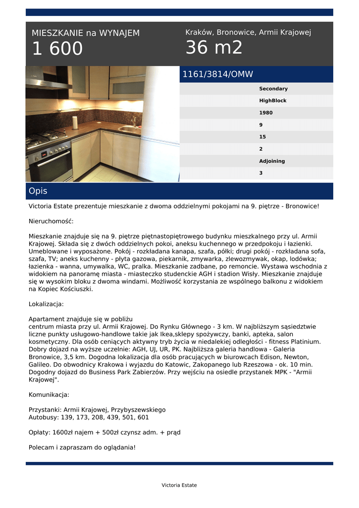 Kraków, Bronowice, Armii Krajowej MIESZKANIE na WYNAJEM 36 m2 1 600 1161/3814/OMW Secondary HighBlock 1980 9 15 2 Adjoining 3 Opis Victoria Estate prezentuje mieszkanie z dwoma oddzielnymi pokojami na 9. piętrze - Bronowice! Nieruchomość: Mieszkanie znajduje się na 9. piętrze piętnastopiętrowego budynku mieszkalnego przy ul. Armii Krajowej. Składa się z dwóch oddzielnych pokoi, aneksu kuchennego w przedpokoju i łazienki. Umeblowane i wyposażone. Pokój - rozkładana kanapa, szafa, półki; drugi pokój - rozkładana sofa, szafa, TV; aneks kuchenny - płyta gazowa, piekarnik, zmywarka, zlewozmywak, okap, lodówka; łazienka - wanna, umywalka, WC, pralka. Mieszkanie zadbane, po remoncie. Wystawa wschodnia z widokiem na panoramę miasta - miasteczko studenckie AGH i stadion Wisły. Mieszkanie znajduje się w wysokim bloku z dwoma windami. Możliwość korzystania ze wspólnego balkonu z widokiem na Kopiec Kościuszki. Lokalizacja: Apartament znajduje się w pobliżu centrum miasta przy ul. Armii Krajowej. Do Rynku Głównego - 3 km. W najbliższym sąsiedztwie liczne punkty usługowo-handlowe takie jak Ikea,sklepy spożywczy, banki, apteka, salon kosmetyczny. Dla osób ceniących aktywny tryb życia w niedalekiej odległości - fitness Platinium. Dobry dojazd na wyższe uczelnie: AGH, UJ, UR, PK. Najbliższa galeria handlowa - Galeria Bronowice, 3,5 km. Dogodna lokalizacja dla osób pracujących w biurowcach Edison, Newton, Galileo. Do obwodnicy Krakowa i wyjazdu do Katowic, Zakopanego lub Rzeszowa - ok. 10 min. Dogodny dojazd do Business Park Zabierzów. Przy wejściu na osiedle przystanek MPK - "Armii Krajowej". Komunikacja: Przystanki: Armii Krajowej, Przybyszewskiego Autobusy: 139, 173, 208, 439, 501, 601 Opłaty: 1600zł najem + 500zł czynsz adm. + prąd Polecam i zapraszam do oglądania! Victoria Estate Paulina Zajdel tel. +48 789 453 049 email: [email protected] Victoria Estate Powered by TCPDF (www.tcpdf.org)