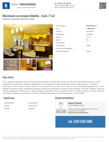 tel. (022) 763 96 00 email: [email protected] www: wolomin.pln.com.pl Mieszkanie na wynajem Kobyłka - 3 pok. 77 m2 Lokalizacja: mazowieckie, wołomiński, Kobyłka numer oferty MW-34413-7 cena 1 400 PLN cena m 18 PLN/m2 mieszkanie wynajem, metraż 77 m2 piętro 0/1 liczba pokoi 3 rok budowy 2008 2 informacje dodatkowe materiał budynku cegła Opis oferty Cicha, spokojna, bezpieczna okolica- mieszkanie posadowione na zamkniętym osiedlu. Mieszkanie w stanie bardzo dobrym, w pełni wyposażone w sprzęt AGD- możliwość doposażenia w inne elementy. W skład mieszkania wchodzą: Salon połączony z aneksem kuchennym- 35,2 m2, Pokój- 14,8 m2, Pokój 11,2 m2, Łazienka- 5,3 m2, Holl- 4,4 m2, Sień- 3,2 m2, Pomieszczenie gospodarcze- 3,4 m2, Ogródek. Mieszkanie widne, rozkładowe gustownie wykończone. Ogrzewane za pomocą pieca gazowego i kominka. W pobliżu szkoła jak również podstawowa infrastruktura, w dalszej odległości stacja PKP. Czynsz na poziomie 1400 zł + opłaty licznikowe + kaucja. Zachęcam do kontaktu i oglądania nieruchomości w terenie. Pośrednik prowadzący Teresa Kwiatkowska, nr licencji 4887 Lokalizacja Osoba kontaktowa Łukasz Paziński województwo mazowieckie powiat wołomiński [email protected] miasto Kobyłka Chętnie udzielę dodatkowych informacji związanych z tą ofertą. Zapraszam do kontaktu! tel. 509 000 088 Zawsze dążymy do tego, aby informacje o proponowanych przez nas ofertach były jak najbardziej dokładne. Niekiedy jednak, ze względu na fakt, iż uzyskujemy je od osób trzecich nie jest możliwe ich zweryfikowanie, wobec czego należy traktować je orientacyjnie i nie stanowią one oferty w rozumieniu kodeksu cywilnego.