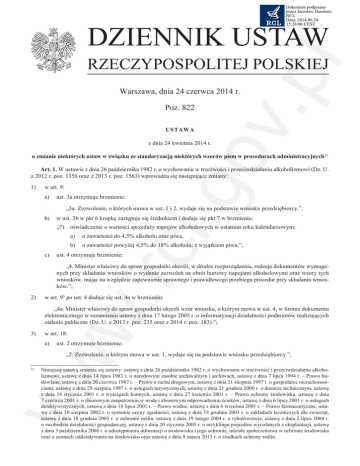 Dokument podpisany przez Jarosław Deminet; RCL Data: 2014.06.24 15:28:06 CEST DZIENNIK USTAW v.p l RZECZYPOSPOLITEJ POLSKIEJ Warszawa, dnia 24 czerwca 2014 r. Poz. 822 USTAWA .go z dnia 24 kwietnia 2014 r. o zmianie niektórych ustaw w związku ze standaryzacją niektórych wzorów pism w procedurach administracyjnych1) Art. 1. W ustawie z dnia 26 października 1982 r. o wychowaniu w trzeźwości i przeciwdziałaniu alkoholizmowi (Dz. U. z 2012 r. poz. 1356 oraz z 2013 r. poz. 1563) wprowadza się następujące zmiany: 1)w art. 9: a)ust. 3a otrzymuje brzmienie: „3a. Zezwolenia, o których mowa w ust. 1 i 2, wydaje się na podstawie wniosku przedsiębiorcy.”, b)w ust. 3b w pkt 6 kropkę zastępuje się średnikiem i dodaje się pkt 7 w brzmieniu: w. rcl „7) oświadczenie o wartości sprzedaży napojów alkoholowych w ostatnim roku kalendarzowym: a)o zawartości do 4,5% alkoholu oraz piwa, b)o zawartości powyżej 4,5% do 18% alkoholu, z wyjątkiem piwa.”, c)ust. 4 otrzymuje brzmienie: „4. Minister właściwy do spraw gospodarki określi, w drodze rozporządzenia, rodzaje dokumentów wymaganych przy składaniu wniosków o wydanie zezwoleń na obrót hurtowy napojami alkoholowymi oraz wzory tych wniosków, mając na względzie zapewnienie sprawnego i prawidłowego przebiegu procedur przy składaniu wniosków.”; 2)w art. 95 po ust. 4 dodaje się ust. 4a w brzmieniu: „4a. Minister właściwy do spraw gospodarki określi wzór wniosku, o którym mowa w ust. 4, w formie dokumentu elektronicznego w rozumieniu ustawy z dnia 17 lutego 2005 r. o informatyzacji działalności podmiotów realizujących zadania publiczne (Dz. U. z 2013 r. poz. 235 oraz z 2014 r. poz. 183).”; 3)w art. 18: a)ust. 2 otrzymuje brzmienie: ww „2. Zezwolenie, o którym mowa w ust. 1, wydaje się na podstawie wniosku przedsiębiorcy.”, 1) Niniejszą ustawą zmienia się ustawy: ustawę z dnia 26 października 1982 r. o wychowaniu w trzeźwości i przeciwdziałaniu alkoholizmowi, ustawę z dnia 14 lipca 1983 r. o narodowym zasobie archiwalnym i archiwach, ustawę z dnia 7 lipca 1994 r. – Prawo budowlane, ustawę z dnia 20 czerwca 1997 r. – Prawo o ruchu drogowym, ustawę z dnia 21 sierpnia 1997 r. o gospodarce nieruchomościami, ustawę z dnia 29 sierpnia 1997 r. o usługach turystycznych, ustawę z dnia 21 grudnia 2000 r. o dozorze technicznym, ustawę z dnia 18 stycznia 2001 r. o wyścigach konnych, ustawę z dnia 27 kwietnia 2001 r. – Prawo ochrony środowiska, ustawę z dnia 7 czerwca 2001 r. o zbiorowym zaopatrzeniu w wodę i zbiorowym odprowadzaniu ścieków, ustawę z dnia 6 lipca 2001 r. o usługach detektywistycznych, ustawę z dnia 18 lipca 2001 r. – Prawo wodne, ustawę z dnia 6 września 2001 r. – Prawo farmaceutyczne, ustawę z dnia 30 sierpnia 2002 r. o systemie oceny zgodności, ustawę z dnia 18 grudnia 2003 r. o zakładach leczniczych dla zwierząt, ustawę z dnia 18 grudnia 2003 r. o ochronie roślin, ustawę z dnia 19 lutego 2004 r. o rybołówstwie, ustawę z dnia 2 lipca 2004 r. o swobodzie działalności gospodarczej, ustawę z dnia 20 stycznia 2005 r. o recyklingu pojazdów wycofanych z eksploatacji, ustawę z dnia 3 października 2008 r. o udostępnianiu informacji o środowisku i jego ochronie, udziale społeczeństwa w ochronie środowiska oraz o ocenach oddziaływania na środowisko oraz ustawę z dnia 8 marca 2013 r. o środkach ochrony roślin. Dziennik Ustaw – 2 – Poz. 822 b)w ust. 6 pkt 3 otrzymuje brzmienie: c)po ust. 6 dodaje się ust. 6a w brzmieniu: v.p l „3) zgodę właściciela, użytkownika, zarządcy lub administratora budynku, jeżeli punkt sprzedaży będzie zlokalizowany w budynku mieszkalnym wielorodzinnym;”, „6a. Minister właściwy do spraw gospodarki określi wzór wniosku o wydanie zezwolenia w formie dokumentu elektronicznego w rozumieniu ustawy z dnia 17 lutego 2005 r. o informatyzacji działalności podmiotów realizujących zadania publiczne.”; 4)w art. 181 dodaje się ust. 6 w brzmieniu: „6. Minister właściwy do spraw gospodarki określi wzory wniosków o wydanie zezwoleń, o których mowa w ust. 1 i 4, w formie dokumentów elektronicznych w rozumieniu ustawy z dnia 17 lutego 2005 r. o informatyzacji działalności podmiotów realizujących zadania publiczne.”; .go 5)w art. 184 dodaje się ust. 4 w brzmieniu: „4. Minister właściwy do spraw gospodarki określi wzór wniosku, o którym mowa w ust. 1, w formie dokumentu elektronicznego w rozumieniu ustawy z dnia 17 lutego 2005 r. o informatyzacji działalności podmiotów realizujących zadania publiczne.”. Art. 2. W ustawie z dnia 14 lipca 1983 r. o narodowym zasobie archiwalnym i archiwach (Dz. U. z 2011 r. Nr 123, poz. 698 i Nr 171, poz. 1016) wprowadza się następujące zmiany: 1)w art. 51c: a)w ust. 1 wprowadzenie do wyliczenia otrzymuje brzmienie: „Wpisu do rejestru dokonuje się na podstawie wniosku przedsiębiorcy zawierającego następujące dane:”, w. rcl b)dodaje się ust. 4 w brzmieniu: „4. Minister właściwy do spraw kultury i ochrony dziedzictwa narodowego określi wzór wniosku, o którym mowa w ust. 1, zawierającego oświadczenie, o którym mowa w ust. 2, w formie dokumentu elektronicznego w rozumieniu ustawy z dnia 17 lutego 2005 r. o informatyzacji działalności podmiotów realizujących zadania publiczne (Dz. U. z 2013 r. poz. 235 oraz z 2014 r. poz. 183).”; 2)w art. 51f dodaje się ust. 3 w brzmieniu: „3. Minister właściwy do spraw kultury i ochrony dziedzictwa narodowego określi wzór zaświadczenia, o którym mowa w ust. 1, w formie dokumentu elektronicznego w rozumieniu ustawy z dnia 17 lutego 2005 r. o informatyzacji działalności podmiotów realizujących zadania publiczne.”. Art. 3. W ustawie z dnia 7 lipca 1994 r. – Prawo budowlane (Dz. U. z 2013 r. poz. 1409 oraz z 2014 r. poz. 40 i 768) w art. 31 po ust. 2 dodaje się ust. 2a w brzmieniu: ww „2a. Minister właściwy do spraw budownictwa, lokalnego planowania i zagospodarow