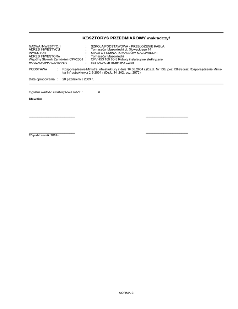 KOSZTORYS PRZEDMIAROWY /nakładczy/ NAZWA INWESTYCJI ADRES INWESTYCJI INWESTOR ADRES INWESTORA Wspólny Słownik Zamówień CPV2008 RODZAJ OPRACOWANIA PODSTAWA : Data opracowania : : : : : : : SZKOŁA PODSTAWOWA - PRZEŁOŻENIE KABLA Tomaszów Mazowiecki ul. Słowackiego 14 MIASTO I GMINA TOMASZÓW MAZOWIECKI Tomaszów Mazowiecki CPV 453 100 00-3 Roboty instalacyjne elektryczne INSTALACJE ELEKTRYCZNE Rozporządzenie Ministra Infrastruktury z dnia 18.05.2004 r.(Dz.U. Nr 130, poz.1389) oraz Rozporządzenie Ministra Infrastruktury z 2.9.2004 r.(Dz.U. Nr 202, poz. 2072) 20 październik 2009 r. Ogółem wartość kosztorysowa robót : zł Słownie: __________________________ ________________________ __________________________ 20 październik 2009 r. ________________________ NORMA 3 Tomaszów-kabel-EN KOSZTORYS L Podstawa Opis p. 1KABEL - PRZEŁOŻENIE KABLA 1 KNR-W 2-01 Ręczne kopanie rowów dla kabli o głębokości do d.1 0701-05 1.0 m i szer. dna do 0.6 w gruncie kat. III - odkopanie kabla obmiar = 16,000m -- R -1* robocizna 1,4r-g/m Razem koszty bezpośrednie: Razem z narzutami: 2 KNR-W 2-01 Ręczne zasypywanie rowów dla kabli o głębokośd.1 0704-06 ci do 1.0 m i szer. dna do 0.6 m w gruncie kat. IV obmiar = 16,000m -- R -1* robocizna 0,988r-g/m Razem koszty bezpośrednie: Razem z narzutami: 3 KNR-W 5-10 Ręczne wyjęcie kabla z wykopanego rowu d.1 0103-04 obmiar = 18,000m -- R -1* robocizna 0,177r-g/m -- S -2* Samochód dostaw.do 0.9t (1) 0,0149m-g/m Razem koszty bezpośrednie: Razem z narzutami: 4 KNR-W 2-01 Ręczne kopanie rowów dla kabli o głębokości do d.1 0701-05 1.0 m i szer. dna do 0.6 w gruncie kat. III - odkopanie kabla obmiar = 16,000m -- R -1* robocizna 1,4r-g/m Razem koszty bezpośrednie: Razem z narzutami: 5 KNR-W 2-01 Ręczne zasypywanie rowów dla kabli o głębokośd.1 0704-06 ci do 1.0 m i szer. dna do 0.6 m w gruncie kat. IV obmiar = 16,000m -- R -1* robocizna 0,988r-g/m Razem koszty bezpośrednie: Razem z narzutami: 6 KNR-W 5-10 Ręczne układanie kabli wielożyłowych o masie do d.1 0103-04 3.0 kg/m na nap.znam.poniżej 110 kV w rowach kablowych obmiar = 16,000m -- R -1* robocizna 0,177r-g/m -- M -2* Wazelina techniczna niskotopliwa N (TN) 0,017kg/m 3* Opaska kablowa OKi - ocechowana 0,1szt/m 4* Folia kalandrowana z PCW uplastycznionego grub. pow. 0,4-0,6 mm gat I/II 0,42m2/m 5* Słupek bet. oznaczeniwy, pomiarowy SO 0,015szt/m 6* materiały pomocnicze 4% -- S -7* Samochód dostaw.do 0.9t (1) 0,0149m-g/m 8* Przyczepa do przewoż.kabli 4t 0,0045m-g/m 9* Ciągnik kołowy 37kW (1) 0,0045m-g/m Razem koszty bezpośrednie: Razem z narzutami: -2- Norma 3.16 jm Nakłady m r-g 22,4000 m r-g 15,8080 m r-g 3,1860 m-g 0,2682 m r-g 22,4000 m r-g 15,8080 m r-g 2,8320 kg 0,2720 szt 1,6000 m2 6,7200 szt 0,2400 % 4,0000 m-g 0,2384 m-g 0,0720 m-g 0,0720 Koszt jedn. R M S Tomaszów-kabel-EN PODSUMOWANIE Robocizna Materiały Sprzęt CAŁY KOSZTORYS RAZEM RAZEM OGÓŁEM Słownie: -3- Norma 3.16 Tomaszów-kabel-EN Lp. 1.robocizna ZESTAWIENIE ROBOCIZNY Nazwa Jm r-g Słownie: -4- Norma 3.16 Ilość Cena jedn. 82,4340 RAZEM Wartość Tomaszów-kabel-EN Lp. ZESTAWIENIE MATERIAŁÓW Nazwa 1.Folia kalandrowana z PCW uplastycznionego grub. pow. 0,4-0,6 mm gat I/II 2.Opaska kablowa OKi - ocechowana 3.Słupek bet. oznaczeniwy, pomiarowy SO 4.Wazelina techniczna niskotopliwa N (TN) 5.materiały pomocnicze Jm m2 szt szt kg zł Ilość 6,7200 Cena jedn. 1,6000 0,2400 0,2720 RAZEM Słownie: -5- Norma 3.16 Wartość Tomaszów-kabel-EN ZESTAWIENIE SPRZĘTU Lp. Nazwa 1.Ciągnik kołowy 37kW (1) 2.Przyczepa do przewoż.kabli 4t 3.Samochód dostaw.do 0.9t (1) Jm m-g m-g m-g Słownie: -6- Norma 3.16 Ilość Cena jedn. 0,0720 0,0720 0,5066 RAZEM Wartość