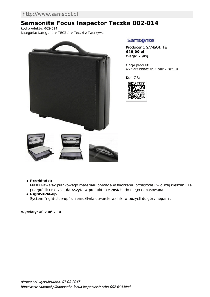 http://www.samspol.pl Samsonite Focus Inspector Teczka 002-014 kod produktu: 002-014 kategoria: Kategorie > TECZKI > Teczki z Tworzywa Producent: SAMSONITE 649,00 zł Waga: 2.9kg Opcje produktu: wybierz kolor:: 09 Czarny szt.10 Kod QR: Przekładka Płaski kawałek piankowego materiału pomaga w tworzeniu przegródek w dużej kieszeni. Ta przegródka nie została wszyta w produkt, ale została do niego dopasowana. Right-side-up System "right-side-up" uniemożliwia otwarcie walizki w pozycji do góry nogami. Wymiary: 40 x 46 x 14 strona: 1/1 wydrukowano: 07-03-2017 http://www.samspol.pl/samsonite-focus-inspector-teczka-002-014.html