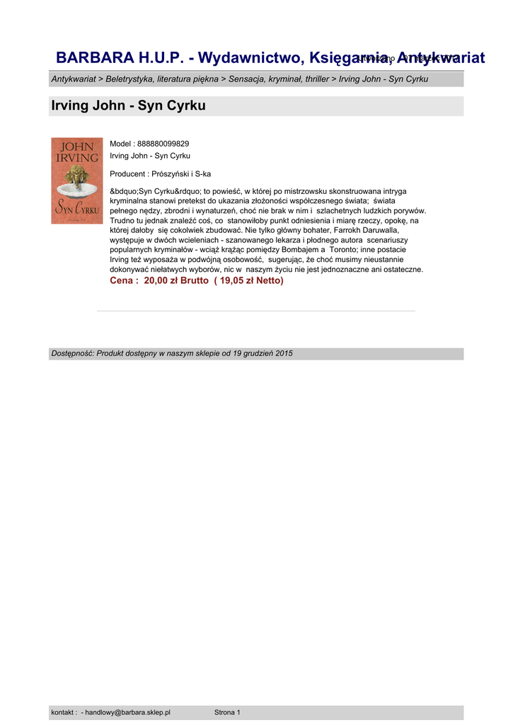 Utworzono Antykwariat : 07 marzec 2017 BARBARA H.U.P. - Wydawnictwo, Księgarnia, Antykwariat > Beletrystyka, literatura piękna > Sensacja, kryminał, thriller > Irving John - Syn Cyrku Irving John - Syn Cyrku Model : 888880099829 Irving John - Syn Cyrku Producent : Prószyński i S-ka „Syn Cyrku” to powieść, w której po mistrzowsku skonstruowana intryga kryminalna stanowi pretekst do ukazania złożoności współczesnego świata; świata pełnego nędzy, zbrodni i wynaturzeń, choć nie brak w nim i szlachetnych ludzkich porywów. Trudno tu jednak znaleźć coś, co stanowiłoby punkt odniesienia i miarę rzeczy, opokę, na której dałoby się cokolwiek zbudować. Nie tylko główny bohater, Farrokh Daruwalla, występuje w dwóch wcieleniach - szanowanego lekarza i płodnego autora scenariuszy popularnych kryminałów - wciąż krążąc pomiędzy Bombajem a Toronto; inne postacie Irving też wyposaża w podwójną osobowość, sugerując, że choć musimy nieustannie dokonywać niełatwych wyborów, nic w naszym życiu nie jest jednoznaczne ani ostateczne. Cena : 20,00 zł Brutto ( 19,05 zł Netto) Dostępność: Produkt dostępny w naszym sklepie od 19 grudzień 2015 kontakt : - [email protected] Strona 1