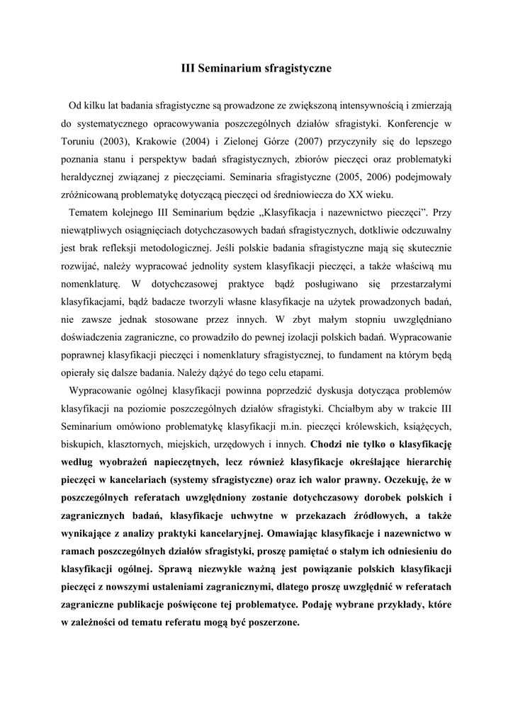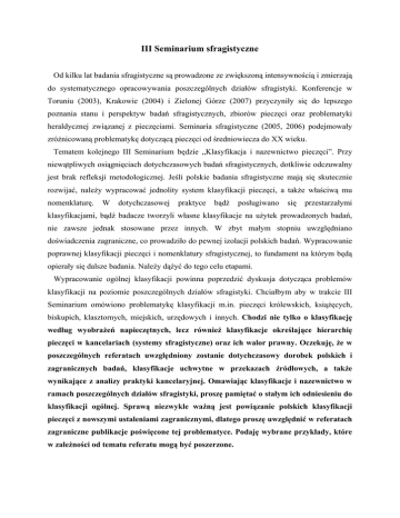 III Seminarium sfragistyczne Od kilku lat badania sfragistyczne są prowadzone ze zwiększoną intensywnością i zmierzają do systematycznego opracowywania poszczególnych działów sfragistyki. Konferencje w Toruniu (2003), Krakowie (2004) i Zielonej Górze (2007) przyczyniły się do lepszego poznania stanu i perspektyw badań sfragistycznych, zbiorów pieczęci oraz problematyki heraldycznej związanej z pieczęciami. Seminaria sfragistyczne (2005, 2006) podejmowały zróżnicowaną problematykę dotyczącą pieczęci od średniowiecza do XX wieku. Tematem kolejnego III Seminarium będzie „Klasyfikacja i nazewnictwo pieczęci”. Przy niewątpliwych osiągnięciach dotychczasowych badań sfragistycznych, dotkliwie odczuwalny jest brak refleksji metodologicznej. Jeśli polskie badania sfragistyczne mają się skutecznie rozwijać, należy wypracować jednolity system klasyfikacji pieczęci, a także właściwą mu nomenklaturę. W dotychczasowej praktyce bądź posługiwano się przestarzałymi klasyfikacjami, bądź badacze tworzyli własne klasyfikacje na użytek prowadzonych badań, nie zawsze jednak stosowane przez innych. W zbyt małym stopniu uwzględniano doświadczenia zagraniczne, co prowadziło do pewnej izolacji polskich badań. Wypracowanie poprawnej klasyfikacji pieczęci i nomenklatury sfragistycznej, to fundament na którym będą opierały się dalsze badania. Należy dążyć do tego celu etapami. Wypracowanie ogólnej klasyfikacji powinna poprzedzić dyskusja dotycząca problemów klasyfikacji na poziomie poszczególnych działów sfragistyki. Chciałbym aby w trakcie III Seminarium omówiono problematykę klasyfikacji m.in. pieczęci królewskich, książęcych, biskupich, klasztornych, miejskich, urzędowych i innych. Chodzi nie tylko o klasyfikację według wyobrażeń napieczętnych, lecz również klasyfikacje określające hierarchię pieczęci w kancelariach (systemy sfragistyczne) oraz ich walor prawny. Oczekuję, że w poszczególnych referatach uwzględniony zostanie dotychczasowy dorobek polskich i zagranicznych badań, klasyfikacje uchwytne w przekazach źródłowych, a także wynikające z analizy praktyki kancelaryjnej. Omawiając klasyfikacje i nazewnictwo w ramach poszczególnych działów sfragistyki, proszę pamiętać o stałym ich odniesieniu do klasyfikacji ogólnej. Sprawą niezwykle ważną jest powiązanie polskich klasyfikacji pieczęci z nowszymi ustaleniami zagranicznymi, dlatego proszę uwzględnić w referatach zagraniczne publikacje poświęcone tej problematyce. Podaję wybrane przykłady, które w zależności od tematu referatu mogą być poszerzone. T. Diederich, Prolegomena zu einer neuen Siegel Typologie, Archiv für Diplomatik, Schriftgeschichte, Siegel- und Wappenkunde, Bd. 29, 1983. Tenże, Reflexions sur la typologie des sceaux, Janus, 1993/1. M. Pastoureau, Les Sceaux, [Typologie des Sources du Moyen Age Occidental], Brepols 1981. Tenże, Typologie des sceaux medievaux, Histoitr & genealogie. Annales de genealogie et d’heraldique, Nr 20, 1988, Nr 24, 1989, Nr 31, 1990. W. Vahl, Beschreibung und Auswertung mittelalterlicher Siegel, Archiv für Diplomatik, Schriftgeschichte, Siegel- und Wappenkunde, Bd.42, 1996. Vocabulaire International de la Sigillographie, Roma 1990. Planowany termin Seminarium początek grudnia 2008. Zenon Piech