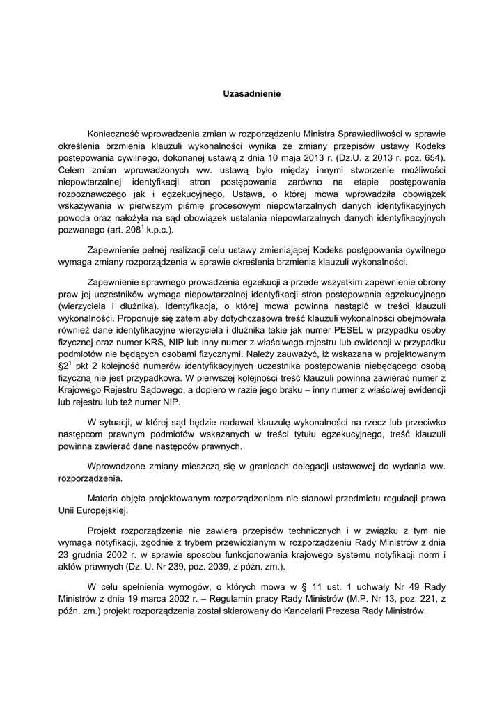 Uzasadnienie Konieczność wprowadzenia zmian w rozporządzeniu Ministra Sprawiedliwości w sprawie określenia brzmienia klauzuli wykonalności wynika ze zmiany przepisów ustawy Kodeks postepowania cywilnego, dokonanej ustawą z dnia 10 maja 2013 r. (Dz.U. z 2013 r. poz. 654). Celem zmian wprowadzonych ww. ustawą było między innymi stworzenie moŜliwości niepowtarzalnej identyfikacji stron postępowania zarówno na etapie postępowania rozpoznawczego jak i egzekucyjnego. Ustawa, o której mowa wprowadziła obowiązek wskazywania w pierwszym piśmie procesowym niepowtarzalnych danych identyfikacyjnych powoda oraz nałoŜyła na sąd obowiązek ustalania niepowtarzalnych danych identyfikacyjnych pozwanego (art. 2081 k.p.c.). Zapewnienie pełnej realizacji celu ustawy zmieniającej Kodeks postępowania cywilnego wymaga zmiany rozporządzenia w sprawie określenia brzmienia klauzuli wykonalności. Zapewnienie sprawnego prowadzenia egzekucji a przede wszystkim zapewnienie obrony praw jej uczestników wymaga niepowtarzalnej identyfikacji stron postępowania egzekucyjnego (wierzyciela i dłuŜnika). Identyfikacja, o której mowa powinna nastąpić w treści klauzuli wykonalności. Proponuje się zatem aby dotychczasowa treść klauzuli wykonalności obejmowała równieŜ dane identyfikacyjne wierzyciela i dłuŜnika takie jak numer PESEL w przypadku osoby fizycznej oraz numer KRS, NIP lub inny numer z właściwego rejestru lub ewidencji w przypadku podmiotów nie będących osobami fizycznymi. NaleŜy zauwaŜyć, iŜ wskazana w projektowanym §21 pkt 2 kolejność numerów identyfikacyjnych uczestnika postępowania niebędącego osobą fizyczną nie jest przypadkowa. W pierwszej kolejności treść klauzuli powinna zawierać numer z Krajowego Rejestru Sądowego, a dopiero w razie jego braku – inny numer z właściwej ewidencji lub rejestru lub teŜ numer NIP. W sytuacji, w której sąd będzie nadawał klauzulę wykonalności na rzecz lub przeciwko następcom prawnym podmiotów wskazanych w treści tytułu egzekucyjnego, treść klauzuli powinna zawierać dane następców prawnych. Wprowadzone zmiany mieszczą się w granicach delegacji ustawowej do wydania ww. rozporządzenia. Materia objęta projektowanym rozporządzeniem nie stanowi przedmiotu regulacji prawa Unii Europejskiej. Projekt rozporządzenia nie zawiera przepisów technicznych i w związku z tym nie wymaga notyfikacji, zgodnie z trybem przewidzianym w rozporządzeniu Rady Ministrów z dnia 23 grudnia 2002 r. w sprawie sposobu funkcjonowania krajowego systemu notyfikacji norm i aktów prawnych (Dz. U. Nr 239, poz. 2039, z późn. zm.). W celu spełnienia wymogów, o których mowa w § 11 ust. 1 uchwały Nr 49 Rady Ministrów z dnia 19 marca 2002 r. – Regulamin pracy Rady Ministrów (M.P. Nr 13, poz. 221, z późn. zm.) projekt rozporządzenia został skierowany do Kancelarii Prezesa Rady Ministrów. Projekt rozporządzenia został zamieszczony na stronie internetowej Biuletynu Informacji Publicznej Ministerstwa Sprawiedliwości, zgodnie z ustawą z dnia 7 lipca 2005 r. o działalności lobbingowej w procesie stanowienia prawa (Dz. U. Nr 169, poz. 1414, z późn. zm.) oraz w Biuletynie Informacji Publicznej Rządowego Centrum Legislacji. OCENA SKUTKÓW REGULACJI 1. Podmioty, na które oddziałuje projektowana regulacja Projektowana regulacja dotyczy sądów i stron postępowania cywilnego. 2. Konsultacje społeczne Projekt został przedstawiony do zaopiniowania Krajowej Radzie Sądownictwa, Prokuratorowi Generalnemu, Krajowej Radzie Prokuratury, Krajowej Radzie Radców Prawnych, Naczelnej Radzie Adwokackiej, Krajowej Radzie Komorniczej, Stowarzyszeniu Sędziów Polskich „Iustitia”, Stowarzyszeniu Sędziów „Themis”, Ogólnopolskiemu Stowarzyszeniu Referendarzy Sądowych, Stowarzyszeniu Sędziów Sądów Rodzinnych, sądom powszechnym, Polskiej Konfederacji Pracodawców Prywatnych Lewiatan, Bussines Center Club Polska, Konfederacji Przedsiębiorstw Finansowych. 3. Wpływ regulacji na sektor finansów publicznych, w tym na budŜet państwa i budŜety jednostek samorządu terytorialnego Projekt nie będzie miał wpływu na sektor finansów publicznych, w tym na budŜet państwa i budŜety jednostek samorządu terytorialnego. Przedmiotowa regulacja nie spowoduje konieczności poniesienia dodatkowych wydatków z budŜetu państwa. Z danych statystycznych za 2012 r. wynika, iŜ sądy powszechne w sprawach cywilnych nadały 581.033 klauzul wykonalności. Ustalenie numerów identyfikacyjnych uczestników postępowania egzekucyjnego odbędzie się z wykorzystaniem juŜ istniejących instrumentów teleinformatycznych. 4. Wpływ regulacji na rynek pracy Wejście w Ŝycie rozporządzenia nie będzie miało wpływu na rynek pracy. 5. Wpływ regulacji na konkurencyjność gospodarki i przedsiębiorczość, w tym na funkcjonowanie przedsiębiorstw Wejście w Ŝycie rozporządzenia stworzy moŜliwość niepowtarzalnej identyfikacji stron postępowania co wpłynie na bezpieczeństwo obrotu gospodarczego. Po za powyŜszym stwierdzeniem projektowane rozporządzenie nie będzie miało wpływu na konkurencyjność gospodarki i przedsiębiorczość, w tym takŜe na funkcjonowanie przedsiębiorstw. 6. Wpływ regulacji na sytuację i rozwój regionalny Wejście w Ŝycie rozporządzenia nie będzie miało wpływu na sytuację i rozwój regionalny. 7. Opinia Kancelarii Prezesa Rady Ministrów od Oceny Skutków Regulacji. Ocena Skutków Regulacji uwzględnia uwagi zgłoszone w opinii Szefa Kancelarii Prezesa Rady Ministrów do Oceny Skutków Regulacji . Wynik konsultacji społecznych Projektu rozporządzenia Ministra Sprawiedliwości zmieniającego rozporządzenie w sprawie określenia brzmienia klauzuli wykonalności W ramach konsultacji społecznych projekt przedstawiony został w celu wyraŜenia opinii: Krajowej Radzie Sądownictwa, Prokuratorowi Generalnemu, Krajowej Radzie Prokuratury, Krajowej Radzie Radców Prawnych, Naczelnej Radzie A