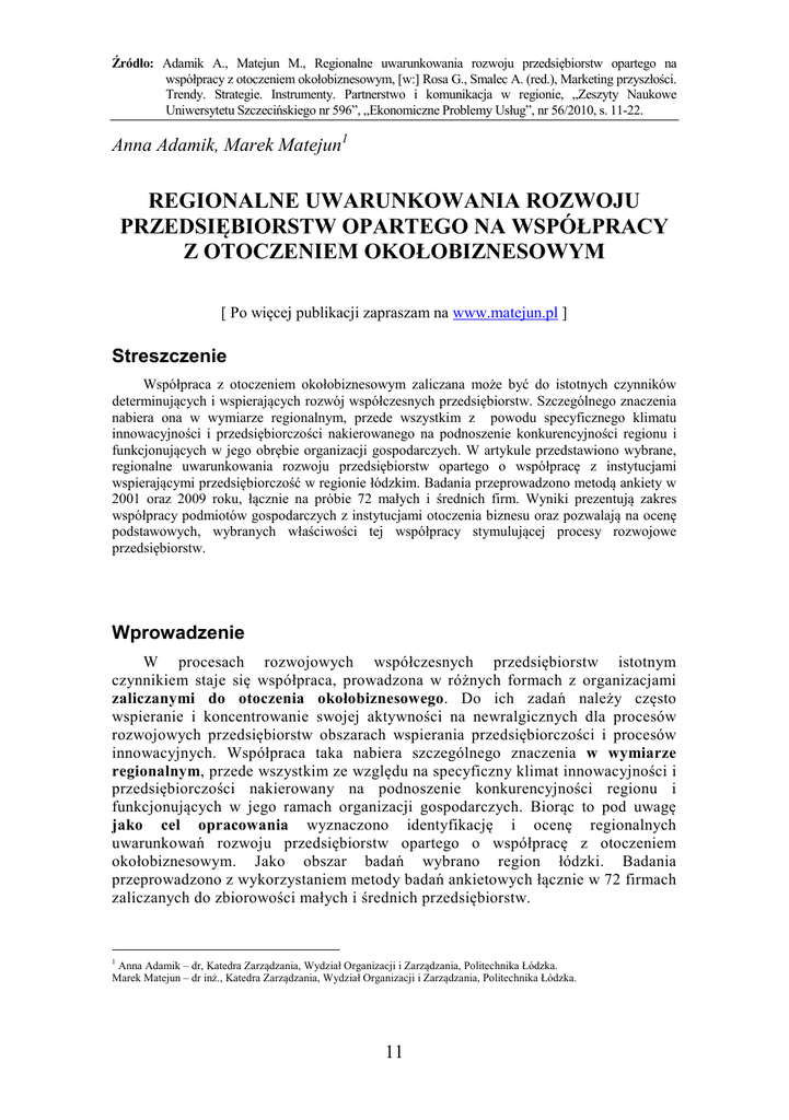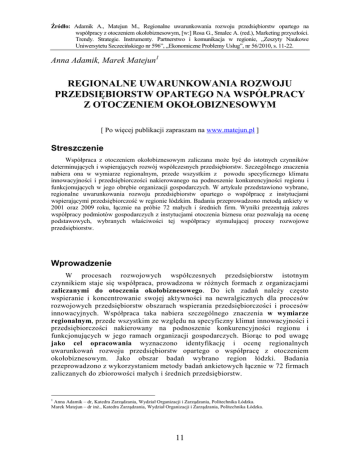Źródło: Adamik A., Matejun M., Regionalne uwarunkowania rozwoju przedsiębiorstw opartego na współpracy z otoczeniem okołobiznesowym, [w:] Rosa G., Smalec A. (red.), Marketing przyszłości. Trendy. Strategie. Instrumenty. Partnerstwo i komunikacja w regionie, „Zeszyty Naukowe Uniwersytetu Szczecińskiego nr 596”, „Ekonomiczne Problemy Usług”, nr 56/2010, s. 11-22. Anna Adamik, Marek Matejun1 REGIONALNE UWARUNKOWANIA ROZWOJU PRZEDSIĘBIORSTW OPARTEGO NA WSPÓŁPRACY Z OTOCZENIEM OKOŁOBIZNESOWYM [ Po więcej publikacji zapraszam na www.matejun.pl ] Streszczenie Współpraca z otoczeniem okołobiznesowym zaliczana może być do istotnych czynników determinujących i wspierających rozwój współczesnych przedsiębiorstw. Szczególnego znaczenia nabiera ona w wymiarze regionalnym, przede wszystkim z powodu specyficznego klimatu innowacyjności i przedsiębiorczości nakierowanego na podnoszenie konkurencyjności regionu i funkcjonujących w jego obrębie organizacji gospodarczych. W artykule przedstawiono wybrane, regionalne uwarunkowania rozwoju przedsiębiorstw opartego o współpracę z instytucjami wspierającymi przedsiębiorczość w regionie łódzkim. Badania przeprowadzono metodą ankiety w 2001 oraz 2009 roku, łącznie na próbie 72 małych i średnich firm. Wyniki prezentują zakres współpracy podmiotów gospodarczych z instytucjami otoczenia biznesu oraz pozwalają na ocenę podstawowych, wybranych właściwości tej współpracy stymulującej procesy rozwojowe przedsiębiorstw. Wprowadzenie W procesach rozwojowych współczesnych przedsiębiorstw istotnym czynnikiem staje się współpraca, prowadzona w różnych formach z organizacjami zaliczanymi do otoczenia okołobiznesowego. Do ich zadań należy często wspieranie i koncentrowanie swojej aktywności na newralgicznych dla procesów rozwojowych przedsiębiorstw obszarach wspierania przedsiębiorczości i procesów innowacyjnych. Współpraca taka nabiera szczególnego znaczenia w wymiarze regionalnym, przede wszystkim ze względu na specyficzny klimat innowacyjności i przedsiębiorczości nakierowany na podnoszenie konkurencyjności regionu i funkcjonujących w jego ramach organizacji gospodarczych. Biorąc to pod uwagę jako cel opracowania wyznaczono identyfikację i ocenę regionalnych uwarunkowań rozwoju przedsiębiorstw opartego o współpracę z otoczeniem okołobiznesowym. Jako obszar badań wybrano region łódzki. Badania przeprowadzono z wykorzystaniem metody badań ankietowych łącznie w 72 firmach zaliczanych do zbiorowości małych i średnich przedsiębiorstw. 1 Anna Adamik – dr, Katedra Zarządzania, Wydział Organizacji i Zarządzania, Politechnika Łódzka. Marek Matejun – dr inż., Katedra Zarządzania, Wydział Organizacji i Zarządzania, Politechnika Łódzka. 11 Źródło: Adamik A., Matejun M., Regionalne uwarunkowania rozwoju przedsiębiorstw opartego na współpracy z otoczeniem okołobiznesowym, [w:] Rosa G., Smalec A. (red.), Marketing przyszłości. Trendy. Strategie. Instrumenty. Partnerstwo i komunikacja w regionie, „Zeszyty Naukowe Uniwersytetu Szczecińskiego nr 596”, „Ekonomiczne Problemy Usług”, nr 56/2010, s. 11-22. Współczesne uwarunkowania i kierunki rozwoju przedsiębiorstw Zjawisko rozwoju przedsiębiorstwa jest jednym z najbardziej złożonych, a często również najbardziej oczekiwanych procesów zachodzących w trakcie funkcjonowania firmy. Jego istotę stanowią zmiany zachodzące w czasie2. W polskojęzycznej literaturze toczy się jednak dyskusja na temat charakteru tych zmian. Część badaczy utożsamia rozwój wyłącznie ze zmianami jakościowymi, przeciwstawiając mu jednocześnie zjawisko wzrostu, opisane czynnikami ilościowymi3. Inni z kolei zwracają uwagę na warunek zachodzenia komplementarnych i uzupełniających się zmian ilościowych i jakościowych jako przesłanek rozwoju4. Uzasadniają to występowaniem w praktyce gospodarczej przedsiębiorstw jednoczesnego i wzajemnie uzupełniającego się wymiaru tych zmian. Niezależnie od przyjętych założeń istotne wydaje się jednak uzupełnienie definicji rozwoju przedsiębiorstwa o subiektywnie pozytywną ocenę kierunku tych zmian dokonaną przez interesariuszy organizacji5. W literaturze zachodniej terminy wzrostu i rozwoju są stosowane często zamiennie, chociaż dominują badania na temat wzrostu (growth) organizacji6. Wśród istotnych nurtów rozważań można tu wymienić na przykład rolę innowacji w „twórczym niszczeniu” zmieniającym stan równowagi układów gospodarczych7, rolę przedsiębiorcy i jego talentów w rozwoju firmy8, rolę zewnętrznych czynników wzrostu9, czy też rozważania dotyczące zasobów i barier w procesie wzrostu organizacji10. W procesie rozwoju przedsiębiorstwo może przyjmować różne drogi i kierunki. Wśród dylematów można wymienić wybór pomiędzy specjalizacją a dywersyfikacją działalności11, a także wybór pomiędzy rozwojem wewnętrznym i zewnętrznym12. 2 J. Machaczka, Zarządzanie rozwojem organizacji, PWN, Warszawa-Kraków 1998, s. 14; B. Kaczmarek, Cz. Sikorski, Podstawy zarządzania. Zachowania organizacyjne, Absolwent, Łódź 1995, s. 225 3 E. Masłyk-Musiał, Zarządzanie zmianami w firmie, Centrum Informacji Menedżera, Warszawa 1996, s. 36, A. Stabryła, Zarządzanie rozwojem firmy, Akademia Ekonomiczna w Krakowie, Kraków 1996, s. 9, Z. Pierścionek, Strategie rozwoju firmy, Wydawnictwo Naukowe PWN, Warszawa 1996, s. 11. 4 J. Penc, Leksykon biznesu, Agencja Wydawnicza Placet, Warszawa 1997, s. 381; S. Lachiewicz, Cykl życia małej firmy, w: Małe firmy w regionie łódzkim. Znaczenie – struktura – warunki działania, red. S. Lachiewicz, Wydawnictwo Politechniki Łódzkiej, Łódź 2003, s. 94, M. Matejun, Barriers to development of high-technology small and medium sized enterprises, Wydawnictwo Politechniki Łódzkiej, Łódź 2008, s. 24. 5 M. Matejun, Barriers to development of high-technology small