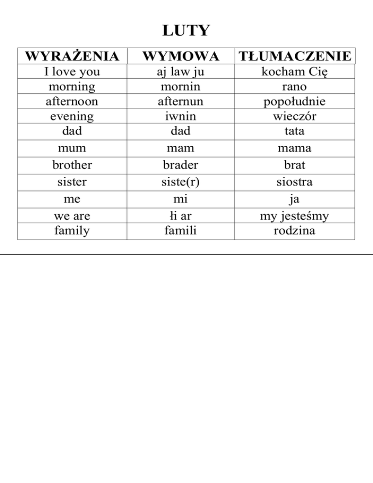 LUTY WYRAŻENIA WYMOWA TŁUMACZENIE I love you morning afternoon evening dad mum brother sister me we are family aj law ju mornin afternun iwnin dad mam brader siste(r) mi łi ar famili kocham Cię rano popołudnie wieczór tata mama brat siostra ja my jesteśmy rodzina