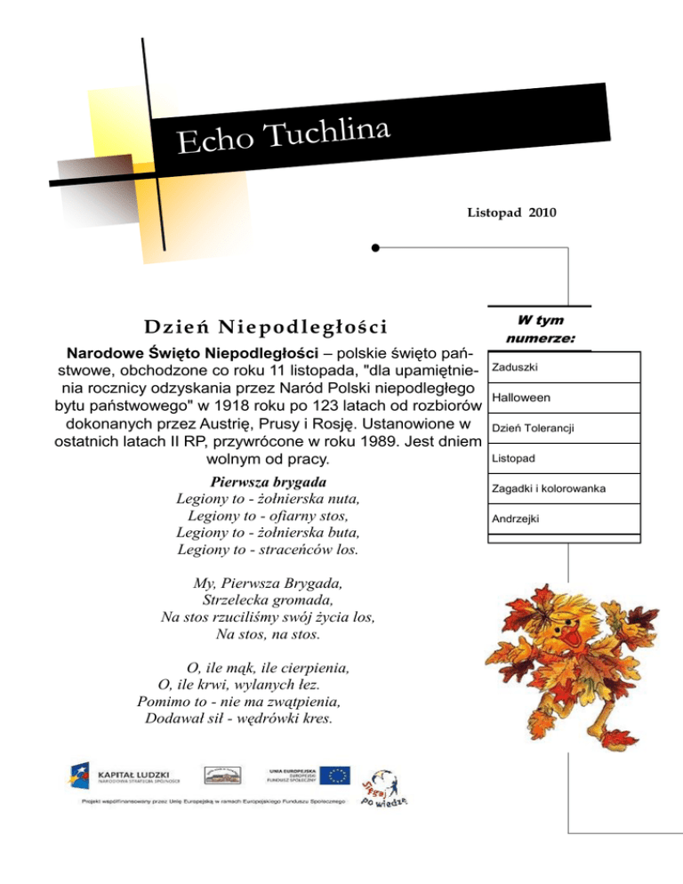 a n i l h c u T o h Ec Listopad 2010 Dzień Niepodległośc i Narodowe Święto Niepodległości – polskie święto państwowe, obchodzone co roku 11 listopada, "dla upamiętnienia rocznicy odzyskania przez Naród Polski niepodległego bytu państwowego" w 1918 roku po 123 latach od rozbiorów dokonanych przez Austrię, Prusy i Rosję. Ustanowione w ostatnich latach II RP, przywrócone w roku 1989. Jest dniem wolnym od pracy. Pierwsza brygada Legiony to - żołnierska nuta, Legiony to - ofiarny stos, Legiony to - żołnierska buta, Legiony to - straceńców los. My, Pierwsza Brygada, Strzelecka gromada, Na stos rzuciliśmy swój życia los, Na stos, na stos. O, ile mąk, ile cierpienia, O, ile krwi, wylanych łez. Pomimo to - nie ma zwątpienia, Dodawał sił - wędrówki kres. W tym numerze: Zaduszki Halloween Dzień Tolerancji Listopad Zagadki i kolorowanka Andrzejki Zaduszki - polski współczesny odpowiednik pogańskiego święta Dziadów. Przypada ono 2 listopada w Dzień Zaduszny, po dniu Wszystkich Świętych. Tego dnia ludzie wspominają wszystkich, którzy odeszli z tego świata, polscy katolicy modlą się za wszystkich wiernych zmarłych, których dusze według ich wiary przebywają teraz w czyśćcu. Obecnie groby odwiedza się raczej w dzień Wszystkich Świętych, który jest dniem wolnym od pracy. Zwyczaje W Zaduszki odwiedza się cmentarze, groby zmarłych z rodziny i uczestniczy się w mszach, modląc się w intencji zmarłych. Tego dnia istnieje tradycja zapalania świeczek czy zniczy na grobach zmarłych oraz składania kwiatów, wieńców lub też innego typu ozdób mających być symbolem pamięci o tychże zmarłych. Tradycja stawiania zniczy na grobach wywodzi się z dawnego pogańskiego zwyczaju rozpalania ognisk na mogiłach, wierzono bowiem, że ogrzeją one błąkające się po ziemi dusze. Dawniej zwyczaj zakazywał tego dnia wykonywania niektórych czynności, aby nie skaleczyć, nie rozgnieść czy w inny sposób nie znieważyć odwiedzającej dom duszy. Zakazane było: klepanie masła, deptanie kapusty, maglowanie, przędzenie i tkanie, cięcie sieczki, wylewanie pomyj i spluwanie. Inne oryginalne kulturowo sposoby obchodzenia tego święta to m.in. anglosaski Halloween (przypadające 31 października) i meksykański Dzień Zmarłych (hiszp.: Día de los Muertos Pochodzenie nazwy listopad. Nazwa miesiąca pochodzi od opadających jesienią liści (por. czes. listopad, ukr. листопад; chorw. listopad ‛ październik’). Łacińska nazwa November =)została zapożyczona przez większość języków europejskich. Przysłowia na listopad: Jaka pogoda listopadowa, taka i marcowa W listopadzie jak na autostradzie W listopadzie liście opadają, a ludzie znicze na grobach stawiają Deszcz z początkiem listopada, mrozy w styczniu zapowiada Gdy w listopadzie gawrony gromadnie latają, deszcze albo śniegi zapowiadają Deszcz w połowie listopada, tęgi mróz w połowie stycznia zapowiada Gdy pogoda w Ofiarowanie, ostra zima nastanie. Dobry bób kiedy głód; kiedy nie ma głodu, to się nie chce bobu. Gdyby nie Kaśka, nie byłoby Jaśka. Międzynarodowy Dzień Tolerancji W 1996 roku Zgromadzenie Ogólne Narodów Zjednoczonych zachęciło państwa członkowskie do obchodów 16 listopada Międzynarodowego Dnia Tolerancji, któremu towarzyszyć mają działania skierowane zarówno do szkół, jak i całego społeczeństwa. Międzynarodowy Dzień Tolerancji ma stanowić okazję do refleksji nad własną postawą wobec "innych", ma też podkreślać potrzebę tolerancji i szacunku wobec każdego człowieka. Zagadnienia te stają się coraz ważniejsze w wielokulturowym świecie, w którym diametralnie różniący się od siebie ludzie żyją często tak blisko siebie. Tolerancja Ważnych jest w życiu bardzo wiele rzeczy, nikt w to nie wątpi i nikt temu nie przeczy. W gronie wielu wartości człowiek egzystuje, na solidnych podstawach swe życie buduje. Tolerować znaczy kochać, tolerować znaczy żyć tolerować egzystować, tolerować to szczęśliwym być Nie ważne, czy biały, czy czarny, żółty też. Nie ważne, czy gruby, czy chudy człowiek jest. Zacznij tolerować też samego siebie. Kochaj, szanuj, ufaj, a będziesz w niebie. Jak się bawimy w Listopadzie!!! Bawić możemy się na przykład przy zagrabianiu liści. Można w nie skakać, rzucać się nimi nawzajem ze swoimi kolegami. Grać w piłkę nożną na podwórku, możemy robić kapelusze lub urządzać pokazy mody przy pomocy różnokolorowych liści. Zbierać żołędzie i kasztany i później robić z nich różne figurki. Kolorowe liście ususzyć i założyć album z jesiennymi liśćmi. Życzymy miłej zabawy ;) HALLOWEEN Halloween wywodzi się z celtyckiego obrządku Samhain. Ponad 2 tys. lat temu w ten dzień żegnano lato, witano zimę oraz obchodzono święto zmarłych. Celtowie wierzyli, iż w dzień Samhain zacierała się granica między zaświatami a światem ludzi żyjących, zaś duchom, zarówno złym jak i dobrym, łatwiej było się przedostać do świata żywych. Nazwa Halloween jest najprawdopodobniej skróconym All Hallows' Eve – wigilia Wszystkich Świętych. W Polsce z tej okazji dla dorosłych organizowane są liczne imprezy kulturalne w nocnych klubach, występy teatralne oraz projekcje filmowe w kinach. Szkoły i przedszkola organizują z tej okazji dodatkowe atrakcje dla swoich wychowanków. W Halloween dzieci przychodzą do szkoły przebrane za straszne postacie filmowe. Chodzenie od domu do domu i zbieranie przez dzieci cukierków zdarza się sporadycznie, lecz coraz częściej. W Polsce wiele ludzi nie akceptuje tego święta, ponieważ boją się go. Amerykanie kupują przed Halloween maski i kostiumy, w które przebierają się głównie dzieci. Zgodnie z tradycyjnym obyczajem, chodzą one tego dnia grupami, przebrane za zjawy, duchy i potwory, od domu do domu, pukają do drzwi i, grożąc psotami, proszą o poczęstunek. Typową ozdobą ganków staje si