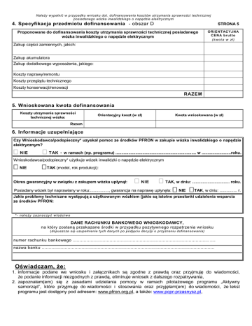 Należy wypełnić w przypadku wniosku dot. dofinansowania koszt ów utrzymania sprawności technicznej posiadanego wózka inwalidzkiego o napędzie elektrycznym 4. Specyfikacja przedmiotu dofinansowania - obszar D STRONA 5 Proponowane do dofinansowania koszty utrzymania sprawności technicznej posiadanego wózka inwalidzkiego o napędzie elektrycznym O R I E N T AC Y J N A CENA brutto ( k w o t a w zł ) Zakup części zamiennych, jakich: Zakup akumulatora Zakup dodatkowego wyposażenia, jakiego: Koszty naprawy/remontu Koszty przeglądu technicznego Koszty konserwacji/renowacji RAZEM 5. Wnioskowana kwota dofinansowania Koszty utrzymania sprawności technicznej wózka: Orientacyjny koszt (w zł) Kwota wnioskowana (w zł) Razem 6. Informacje uzupełniające Czy Wnioskodawca/podopieczny* uzyskał pomoc ze środków PFRON w zakupie wózka inwalidzkiego o napędzie elektrycznym? NIE T AK - w ramach (np. programu) ..................................................................... w .........................roku. Wnioskodawca/podopieczny* użytkuje wózek inwalidzki o napędzie elektrycznym NIE TAK (model, rok produkcji): TAK, w dniu: ................................ roku. Posiadany wózek był naprawiany w roku:................, gwarancja na naprawę upłynęła: NIE TAK, w dniu: ............... r. Okres gwarancyjny w związku z zakupem wózka upłynął: NIE Jakie problemy techniczne występują z użytkowanym wózkiem (jakie są istotne przesłanki udzielenia wsparcia ze środków PFRON: * - n a l e ży za zn a c zy ć w ł a ś c i w e DANE RACHUNKU BANKOWEGO WNIOSKODAWCY, na który zostaną przekazane środki w przypadku pozytywn ego rozpatrzenia wniosku (dopuszcza się uzupełnienie tych danych po podjęciu decyzji o przyznaniu dofinansowania) numer rachunku bankowego .................................................................................................... .... nazwa banku .............................................................................................................................. Oświadczam, że: 1. informacje podane we wniosku i załącznikach są zgodne z prawdą oraz przyjmuję do wiadomości, że podanie informacji niezgodnych z prawdą, eliminuje wniosek z dalszego rozpatrywania, 2. zapoznałam(em) się z zasadami udzielania pomocy w ramach pilotażowego programu „Aktywny samorząd”, które przyjmuję do wiadomości i stosowania oraz przyjęłam(em) do wiadomości, że tekst programu jest dostępny pod adresem: www.pfron.org.pl, a także: www.pcpr-przasnysz.pl, ST RO NA 6 3. w ciągu trzech lat przed złożeniem wniosku nie uzyskałem (-łam) pomocy ze środków PFRON na cele objęte niniejszym wnioskiem, 4. przyjmuję do wiadomości i stosowania, iż złożenie niniejszego wniosku o dofinansowanie nie gwarantuje uzyskania pomocy w ramach realizacji programu oraz, że warunkiem zawarcia umowy dofinansowania jest spełnianie warunków uczestnictwa określonych w programie także w dniu podpisania umowy, 5. przyjmuję do wiadomości i stosowania, że ewentualne wyjaśnienia, uzupełnienia zapisów lub brakujących załączników do wniosku należy dostarczyć niezwłocznie, w terminie wyznaczonym przez Realizatora programu oraz, że prawidłowo zaadresowana korespondencja, która pomimo dwukrotnego awizowania nie zostanie odebrana, uznawana będzie za doręczoną, 6. w ciągu ostatnich 3 lat byłem(am) stroną umowy dofinansowania ze środków PFRON i rozwiązanej z przyczyn leżących po mojej stronie: tak - nie, 7. przyjmuję do wiadomości i stosowania, iż w przypadku przyznanego dofinansowania, przelanie środków finansowych może nastąpić na rachunek bankowy Wnioskodawcy lub też na rachunek bankowy sprzedawcy/usługodawcy, na podstawie przedstawionej i podpisanej przez Wnioskodawcę faktury VAT. Wnioskodawca nie mogący pisać, lecz mogący czytać, zamiast podpisu może uczynić na dokumencie tuszowy odcisk palca, a obok tego odcisku inna osoba wypisze jej imię i nazwisko umieszczając swój podpis; zamiast Wnioskodawcy może także podpisać się inna osoba, z tym że jej podpis musi być poświadczony przez notariusza lub wójta (burmistrza, prezydenta miasta), starostę lub marszałka województwa z zaznaczeniem, że podpis został złożony na życzenie nie mogącego pisać, lecz mogącego czytać. ...................................... dnia ..... /....... /20..... r. ............................ podpis Wnioskodawcy 7. Załączniki: wymagane do wniosku oraz dodatkowe (wiersze 6-12) WYPEŁNIA WYŁĄCZNIE REALIZATOR PROGRAMU (należy zaznaczyć właściwe) Nazwa załącznika Dołączono do wniosku Uzupełniono 1. Kserokopia aktualnego orzeczenia o znacznym stopniu niepełnosprawności (lub orzeczenia równoważnego) albo orzeczenia o niepełnosprawności podopiecznego (osoby do 16 roku życia) 2. Oświadczenie o wysokości średnich miesięcznych dochodów brutto w przeliczeniu na jednego członka rodziny pozostającego we wspólnym gospodarstwie domowym (sporządzone wg wzoru określonego w załączniku nr 1 do wniosku) 3. Oświadczenia o wyrażeniu zgody na przetwarzanie danych osobowych przez Realizatora programu i PFRON (sporządzone wg wzoru określonego w załączniku nr 3 do formularza wniosku) - wypełnione przez Wnioskodawcę oraz inne osoby posiadające zdolność do czynności prawnych, których dane osobowe zostały przekazane do Realizatora programu 4. Kserokopia aktu urodzenia dziecka - w przypadku wniosku dotyczącego niepełnoletniej osoby niepełnosprawnej 5. Kserokopia dokumentu stanowiącego opiekę prawną nad podopiecznym – w przypadku wniosku dotyczącego osoby niepełnosprawnej, w imieniu której występuje opiekun prawny 6. Zestawienie dowodów księgowych (faktury VAT) potwierdzających zakup dodatkowego wyposażenia, części zamiennych i akumulatorów do posiadanego wózka inwalidzkiego o napędzie elektrycznym i/lub jego niezbędnych napraw, remontów, przeglądów technicznych, konserwacji i renowacji 