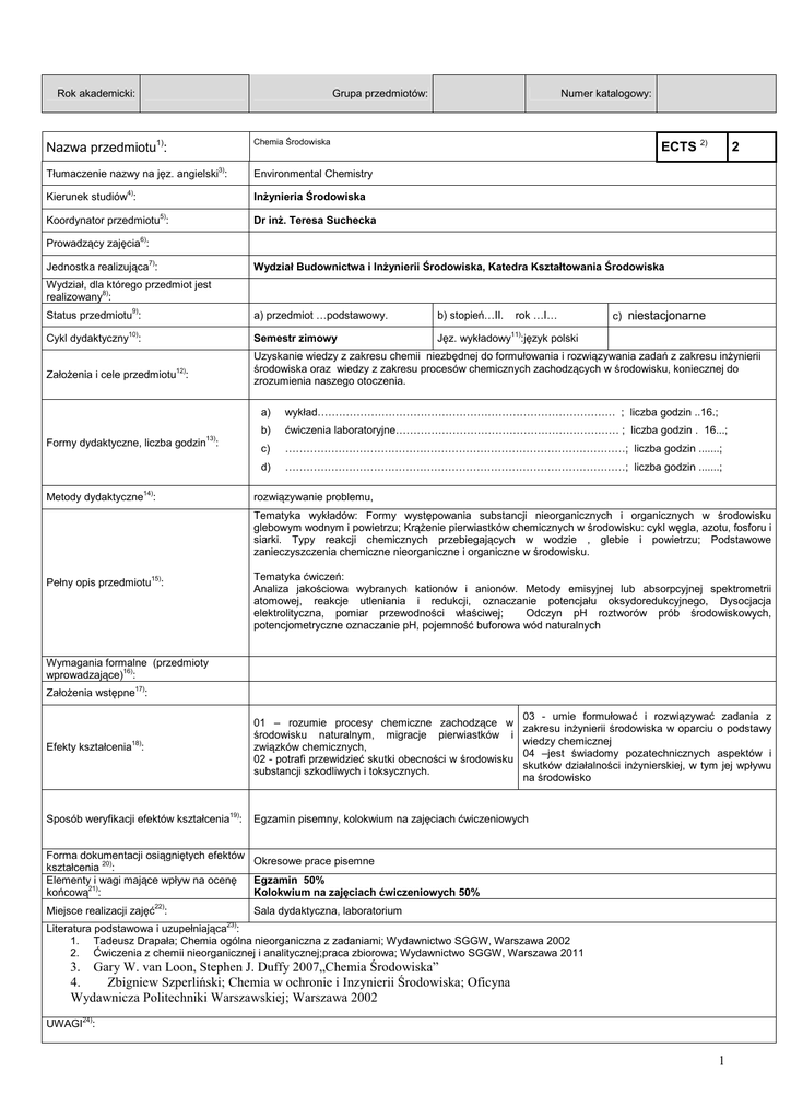 Rok akademicki: Grupa przedmiotów: Nazwa przedmiotu1): Chemia Środowiska Tłumaczenie nazwy na jęz. angielski3): Environmental Chemistry 4) Numer katalogowy: ECTS 2) 2 Inżynieria Środowiska Kierunek studiów : Koordynator przedmiotu5): Dr inż. Teresa Suchecka 6) Prowadzący zajęcia : Jednostka realizująca7): Wydział Budownictwa i Inżynierii Środowiska, Katedra Kształtowania Środowiska Wydział, dla którego przedmiot jest realizowany8): Status przedmiotu9): 10) a) przedmiot …podstawowy. b) stopień…II. rok …I… c) niestacjonarne 11) Cykl dydaktyczny : Semestr zimowy Założenia i cele przedmiotu12): Uzyskanie wiedzy z zakresu chemii niezbędnej do formułowania i rozwiązywania zadań z zakresu inżynierii środowiska oraz wiedzy z zakresu procesów chemicznych zachodzących w środowisku, koniecznej do zrozumienia naszego otoczenia. Formy dydaktyczne, liczba godzin13): Metody dydaktyczne14): Jęz. wykładowy :język polski a) wykład………………………………………………………………………… ; liczba godzin ..16.; b) ćwiczenia laboratoryjne……………………………………………………… ; liczba godzin . 16...; c) ……………………………………………………………………………………; liczba godzin .......; d) ……………………………………………………………………………………; liczba godzin .......; rozwiązywanie problemu, Tematyka wykładów: Formy występowania substancji nieorganicznych i organicznych w środowisku glebowym wodnym i powietrzu; Krążenie pierwiastków chemicznych w środowisku: cykl węgla, azotu, fosforu i siarki. Typy reakcji chemicznych przebiegających w wodzie , glebie i powietrzu; Podstawowe zanieczyszczenia chemiczne nieorganiczne i organiczne w środowisku. Pełny opis przedmiotu15): Tematyka ćwiczeń: Analiza jakościowa wybranych kationów i anionów. Metody emisyjnej lub absorpcyjnej spektrometrii atomowej, reakcje utleniania i redukcji, oznaczanie potencjału oksydoredukcyjnego, Dysocjacja elektrolityczna, pomiar przewodności właściwej; Odczyn pH roztworów prób środowiskowych, potencjometryczne oznaczanie pH, pojemność buforowa wód naturalnych Wymagania formalne (przedmioty wprowadzające)16): Założenia wstępne17): 03 - umie formułować i rozwiązywać zadania z zakresu inżynierii środowiska w oparciu o podstawy wiedzy chemicznej 04 –jest świadomy pozatechnicznych aspektów i skutków działalności inżynierskiej, w tym jej wpływu na środowisko Efekty kształcenia18): 01 – rozumie procesy chemiczne zachodzące w środowisku naturalnym, migracje pierwiastków i związków chemicznych, 02 - potrafi przewidzieć skutki obecności w środowisku substancji szkodliwych i toksycznych. Sposób weryfikacji efektów kształcenia19): Egzamin pisemny, kolokwium na zajęciach ćwiczeniowych Forma dokumentacji osiągniętych efektów Okresowe prace pisemne kształcenia 20): Egzamin 50% Elementy i wagi mające wpływ na ocenę Kolokwium na zajęciach ćwiczeniowych 50% końcową21): Miejsce realizacji zajęć22): Sala dydaktyczna, laboratorium Literatura podstawowa i uzupełniająca23): 1. Tadeusz Drapała; Chemia ogólna nieorganiczna z zadaniami; Wydawnictwo SGGW, Warszawa 2002 2. Ćwiczenia z chemii nieorganicznej i analitycznej;praca zbiorowa; Wydawnictwo SGGW, Warszawa 2011 3. Gary W. van Loon, Stephen J. Duffy 2007„Chemia Środowiska” 4. Zbigniew Szperliński; Chemia w ochronie i Inzynierii Środowiska; Oficyna Wydawnicza Politechniki Warszawskiej; Warszawa 2002 UWAGI24): 1 Wskaźniki ilościowe charakteryzujące moduł/przedmiot25) : Szacunkowa sumaryczna liczba godzin pracy studenta (kontaktowych i pracy własnej) niezbędna dla osiągnięcia zakładanych efektów kształcenia18) - na tej podstawie należy wypełnić pole ECTS2: …55 h Łączna liczba punktów ECTS, którą student uzyskuje na zajęciach wymagających bezpośredniego udziału nauczycieli akademickich: …2. ECTS Łączna liczba punktów ECTS, którą student uzyskuje w ramach zajęć o charakterze praktycznym, takich jak zajęcia laboratoryjne, projektowe, itp.: ……1 ECTS Tabela zgodności kierunkowych efektów kształcenia efektami przedmiotu 26) Nr /symbol efektu 01 Wymienione w wierszu efekty kształcenia: Odniesienie do efektów dla programu kształcenia na kierunku K_W01 rozumie procesy chemiczne zachodzące w środowisku naturalnym, migracje pierwiastków 02 potrafi przewidzieć skutki obecności w środowisku substancji szkodliwych i toksycznych. K_W01; K_W05 03 umie formułować i rozwiązywać zadania z zakresu inżynierii środowiska w oparciu o podstawy wiedzy chemicznej K_U01; K_U02;K_U05; K_K02; K_K03; Jest świadomy pozatechnicznych aspektów i skutków działalności inżynierskiej, w tym jej wpływu na środowisko K_K04; K_K10 i związków chemicznych, 04 K_K10 05 2