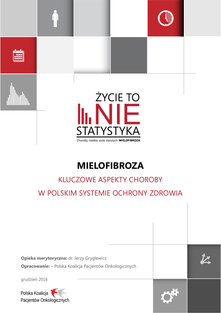 STATYSTYKA MIELOFIBROZA KLUCZOWE ASPEKTY CHOROBY W POLSKIM SYSTEMIE OCHRONY ZDROWIA Opieka merytoryczna: dr. Jerzy Gryglewicz Opracowanie: – Polska Koalicja Pacjentów Onkologicznych grudzień 2016 Polska Koalicja Pacjentów Onkologicznych MIELOFIBROZA Kluczowe aspekty choroby w polskim systemie ochrony zdrowia Spis treści 1. Mielofibroza definicja 2. Klasyfikacja ICD 10 – problemy 3. Koszty zdrowotne – hospitalizacje 4. Mielofibroza jako przyczyna niezdolności do pracy 5. Mielofibroza a dostępność do lekarzy hematologów 6. Mielofibroza a dostęp do świadczeń finansowanych przez NFZ w zakresie hematologii 7. Leczenie chorych na mielofibrozę 8. Gdzie szukać wsparcia 2 MIELOFIBROZA Kluczowe aspekty choroby w polskim systemie ochrony zdrowia 1. Mielofibroza defincja Od niedawna pacjenci mają szansę na trwałe wyleczenie dzięki innowacyjnym produktom Mielofibroza czyli włóknienie szpiku to jed- leczniczym zarejestrowanym również w Polsce. nostka, której cechą charakterystyczną jest obecność zwiększonej ilości włókien retikuli- 2. Klasyfikacja ICD-10 – problemy nowych w szpiku kostnym. Bardzo dużym problem dla identyfikacji problemu zdrowotnego jakim jest mielofibroza Początek choroby jest najczęściej skryty. Na w polskim systemie ochrony zdrowia jest brak wczesnym etapie zachorowania do wykrycia powszechnie obowiązującego kodu ICD-10 choroby dochodzi najczęściej przypadkowo przyporządkowanego mielofibrozie. w wyniku stwierdzenia nieprawidłowości w rutynowo wykonanej morfologii krwi lub Najczęściej profesjonaliści medyczni dla ce- w wyniku wykrycia powiększenia śledziony lów statystycznych przyporządkowują mie- w czasie badania brzucha przez lekarza lub lofibrozie kod D47 Nowotwór o niepewnym wykrytego przez w trakcie badania USG jamy lub nieznanym charakterze układu limfatycz- brzusznej. nego, krwiotwórczego i tkanek pokrewnych. Nie ma specyficznych objawów charaktery- W opinii kluczowych polskich hematolo- stycznych tylko dla tej choroby. Mogą wystąpić gów prawidłowym kodem optymalnym ko- nocne poty, łatwe męczenie się, utrata masy dem dedykowanym mielofibrozie powinien ciała, czasami gorączka. Objawy te z reguły nie być kod D 47.4 (włóknienie szpiku) niestety są obecne we wczesnej fazie choroby. w większości polskich tłumaczeń ICD-10 taki kod nie występuje. Podstawowym badaniem niezbędnym do rozpoznania choroby jest badanie szpiku kostne- Światowa Organizacja Zdrowia (WHO) rozpo- go pobranego z talerza kości biodrowej. częła w 2014 roku prace związane z opracowaniem jedenastej wersji Międzynarodowej Mielofibroza może powstać samoistnie z nie- Klasyfikacji Chorób ICD-11 dlatego istotne znanych przyczyn wtedy definiuje się tę cho- jest, żeby mielofibroza uzyskała jednoznacz- robę jako pierwotną mielofibrozę lub wtórnie ny kod w klasyfikacji ICD-11, która zacznie w przebiegu innych nowotworów. Stosowane obowiązywać od 2017 roku, gdyż pozwoli to do tej pory leczenie chorych na mielofibrozę na dokładna ocenę epidemiologiczną wystę- pierwotną miało najczęściej charakter pa- powania mielofibrozy w Polsce oraz pozwoli liatywny i polegało na łagodzeniu objawów dokładnie oszacować jej koszty zdrowotne klinicznych choroby, a średni czas przeżycia i społeczne. chorych wynosił około 5–7 lat. 3 MIELOFIBROZA Kluczowe aspekty choroby w polskim systemie ochrony zdrowia 3. Koszty zdrowotne – hospitalizacje Poniżej zostaną zaprezentowane niektóre Instytut Zarządzania w Ochronie Zdrowia wyniki badań opracowane na podstawie danych sprawozdawczych Narodowego Fundu- Uczelni Łazarskiego w 2015 roku opublikował szu Zdrowia raport ,,Hematologia onkologiczna – aspekty kliniczne, ekonomiczne i systemowe” zawienych z leczeniem nowotworów hematolo- 3.1 L iczba pacjentów leczonych z rozpoznaniem D 47 gicznych w Polsce. W latach 2010–2013 liczba pacjentów z rozpo- rający szczegółową analizę kosztów związa- znaniem dotyczącym mielofibrozy D 47 (NoRaport zawiera także szereg danych dotyczą- wotwór o niepewnym lub nieznanym charak- cych organizacji systemu opieki zdrowotnej terze układu limfatycznego, krwiotwórczego tym finansowania 125 poradni hematologicz- i tkanek pokrewnych), którzy zostali wykaza- nych i 49 oddziałów hematologii oraz charak- ni w sprawozdaniach świadczeniodawców do terystyki dotyczącej 392 lekarzy hematologów NFZ systematycznie wzrastała. z uwzględnieniem ich aktywności zawodowej Najmniejszą liczbę pacjentów 2283 z wykazanym i rozmieszczenia na terenie kraju. rozpoznaniem D 47 odnotowano w 2010 roku. W sposób szczególny w raporcie dokonano Liczba pacjentów na przestrzeni badanego okre- analiz związanych kosztami zdrowotnymi su systematycznie tendencję wzrostową osiąga- i społecznymi spowodowanymi przez mielofi- jąc w 2013 roku największą wartość 3841. Dane brozę. te zaprezentowano poniżej: Źródło: opracowanie własne na podstawie raportu IZWOZ ,,Hematologia onkologiczna – aspekty kliniczne, ekonomiczne i systemowe”2015 r. 4 MIELOFIBROZA Kluczowe aspekty choroby w polskim systemie ochrony zdrowia Powyższa tendencja może wynikać ze wzro- go, krwiotwórczego i tkanek pokrewnych), stu świadomości i możliwości terapeutycz- którzy zostali wykazani w sprawozdaniach nych rozpoznawania tej jednostki chorobo- świadczeniodawców do NFZ także systema- wej a także ze zwiększonej zapadalności tycznie wzrastała. 3.2 L iczba hospitalizacji pacjentów z rozpoznaniem D 47 Należy zaznaczyć, że liczba hospitalizacji do- W latach 2010–2013 liczba hospitalizacji pa- obejmuje przypadki, w których pacjent mógł cjentów z rozpoznaniem dotyczącym mie- być zarówno hospitalizowany jeden raz jak lofibrozy D 47 (Nowotwór o niepewnym lub i wielokrotnie oraz nie dotyczy pacjentów le- nieznanym charakterze układu limfatyczne- czonych ambulatoryjnie. tyczy lecznictwa szpitalnego i oznacza, że Źródło: opracowanie własne 