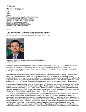 DRUKUJ Najczęściej czytane 24h 7dni 30dni Widmo wyrzucenia z giełdy staje się realne » Euforia na kursie Czerwonej Torebki » Wyceny są niskie, warto łapać dołek » Kupuj, trzymaj czy sprzedaj? » Prezes Mabionu przenosi akcje » Lubawa chce uzbroić Ukrainę » Firmy LSI Software: Dwunastogodzinna bitwa DWOL 29122014, ostatnia aktualizacja 29122014 05:09 Grzegorz Siewiera, główny udziałowiec LSI Software. źródło: Archiwum Przedświąteczne nadzwyczajne walne zgromadzenie akcjonariuszy LSI Software stało się areną walki pomiędzy mniejszościowymi akcjonariuszami a Grzegorzem Siewierą (reprezentował go pełnomocnik), głównym udziałowcem spółki dysponującym ponad 53 proc. głosów na WZA. Łódzka firma zaprosiła udziałowców do swojej siedziby, żeby zdecydowali o emisji 1,81 mln akcji serii H po cenie emisyjnej 8,36 zł (na GPW kosztują po 5,19 zł). Obecnie kapitał firmy, która produkuje i wdraża oprogramowania dla branży hotelarskiej i gastronomicznej, dzieli się na 3,26 mln papierów. Nowe akcje posłużą do rozliczenia transakcji nabycia 25,71 mln walorów spółki Mc Comp dających 83,76 proc. głosów na walnym zgromadzeniu tej firmy. Uchwała została przegłosowana. Przy tej okazji zarząd (do 22 grudnia na jego czele stał Siewiera, ale zastąpił go Janusz Bąk) chciał przeforsować zmiany w statucie uprzywilejowujące dwóch udziałowców – Grzegorza Siewierę oraz Marka Michnę związanego z MC Comp. Statut miał im pozwalać na wskazanie po jednym członku zarządu dopóki każdy z nich będzie kontrolował co najmniej 10 proc. kapitału LSI Software. Zarząd giełdowej spółki musi liczyć, zgodnie ze statutem, dwie do trzech osób. Ten pomysł, który de facto oznaczał oddanie pełnej kontroli nad LSI Software tandemowi Siewiera – Michna nie spodobał się akcjonariuszom mniejszościowym. – To próba wrogiego przejęcia – komentuje Radosław Kwaśnicki, prezes zarządu kancelarii RKKW – Kwaśnicki, Wróbel & Partnerzy. Na walnym reprezentował go jako pełnomocnik Karol Szymański, który kilka tygodni temu ujawnił się w akcjonariacie Ganta. Zdaniem Kwaśnickiego zwołanie spotkania udziałowców bezpośrednio przed świętami było sprzeczne z dobrymi obyczajami. Ponadto przewodniczący walnego nie chciał dopuścić do udziału w nim jednego z udziałowców. – Sposób prowadzenia obrad był całkowicie niedopuszczalny – oznajmia Kwaśnicki. Tarcia pomiędzy akcjonariuszami sprawiły, że walne trwało prawie 12 godzin. Ostatecznie uchwała o zmianie statutu została przegłosowana. Kwaśnicki zapowiada, że zostanie zaskarżona do sądu. – Zwracają się do nas kolejni udziałowcy, którym nie podoba się to, co dzieje się w LSI Software – mówi. Sygnalizuje, że oponenci będą chcieli powołać rewidenta ds. szczególnych, który sprawdzi, jak funkcjonuje firma. PARKIET © Wszystkie prawa zastrzeżone Żadna część jak i całość utworów zawartych w dzienniku nie może być powielana i rozpowszechniana lub dalej rozpowszechniana w jakiejkolwiek formie i w jakikolwiek sposób (w tym także elektroniczny lub mechaniczny lub inny albo na wszelkich polach eksploatacji) włącznie z kopiowaniem, szeroko pojętą digitalizacją, fotokopiowaniem lub kopiowaniem, w tym także zamieszczaniem w Internecie bez pisemnej zgody PRESSPUBLICA Sp. z o.o. Jakiekolwiek użycie lub wykorzystanie utworów w całości lub w części bez zgody PRESSPUBLICA Sp. z o.o. lub autorów z naruszeniem prawa jest zabronione pod groźbą kary i może być ścigane prawnie.