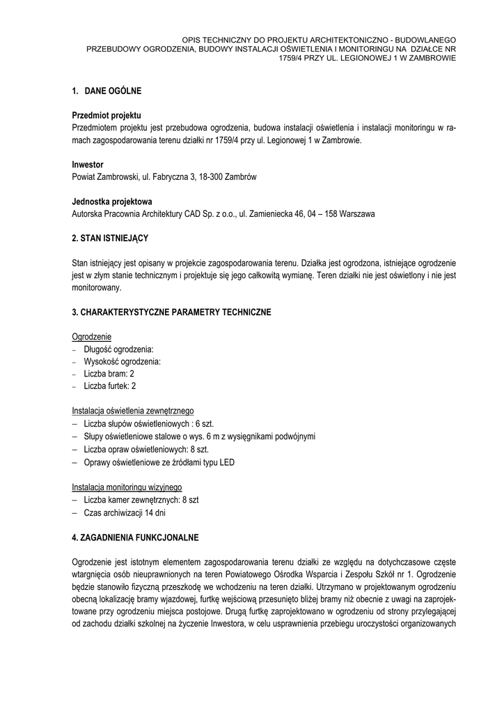 OPIS TECHNICZNY DO PROJEKTU ARCHITEKTONICZNO - BUDOWLANEGO PRZEBUDOWY OGRODZENIA, BUDOWY INSTALACJI OŚWIETLENIA I MONITORINGU NA DZIAŁCE NR 1759/4 PRZY UL. LEGIONOWEJ 1 W ZAMBROWIE 1. DANE OGÓLNE Przedmiot projektu Przedmiotem projektu jest przebudowa ogrodzenia, budowa instalacji oświetlenia i instalacji monitoringu w ramach zagospodarowania terenu działki nr 1759/4 przy ul. Legionowej 1 w Zambrowie. Inwestor Powiat Zambrowski, ul. Fabryczna 3, 18-300 Zambrów Jednostka projektowa Autorska Pracownia Architektury CAD Sp. z o.o., ul. Zamieniecka 46, 04 – 158 Warszawa 2. STAN ISTNIEJĄCY Stan istniejący jest opisany w projekcie zagospodarowania terenu. Działka jest ogrodzona, istniejące ogrodzenie jest w złym stanie technicznym i projektuje się jego całkowitą wymianę. Teren działki nie jest oświetlony i nie jest monitorowany. 3. CHARAKTERYSTYCZNE PARAMETRY TECHNICZNE Ogrodzenie − Długość ogrodzenia: − Wysokość ogrodzenia: − Liczba bram: 2 − Liczba furtek: 2 Instalacja oświetlenia zewnętrznego − Liczba słupów oświetleniowych : 6 szt. − Słupy oświetleniowe stalowe o wys. 6 m z wysięgnikami podwójnymi − Liczba opraw oświetleniowych: 8 szt. − Oprawy oświetleniowe ze źródłami typu LED Instalacja monitoringu wizyjnego − Liczba kamer zewnętrznych: 8 szt − Czas archiwizacji 14 dni 4. ZAGADNIENIA FUNKCJONALNE Ogrodzenie jest istotnym elementem zagospodarowania terenu działki ze względu na dotychczasowe częste wtargnięcia osób nieuprawnionych na teren Powiatowego Ośrodka Wsparcia i Zespołu Szkół nr 1. Ogrodzenie będzie stanowiło fizyczną przeszkodę we wchodzeniu na teren działki. Utrzymano w projektowanym ogrodzeniu obecną lokalizację bramy wjazdowej, furtkę wejściową przesunięto bliŜej bramy niŜ obecnie z uwagi na zaprojektowane przy ogrodzeniu miejsca postojowe. Drugą furtkę zaprojektowano w ogrodzeniu od strony przylegającej od zachodu działki szkolnej na Ŝyczenie Inwestora, w celu usprawnienia przebiegu uroczystości organizowanych OPIS TECHNICZNY DO PROJEKTU ARCHITEKTONICZNO - BUDOWLANEGO PRZEBUDOWY OGRODZENIA, BUDOWY INSTALACJI OŚWIETLENIA I MONITORINGU NA DZIAŁCE NR 1759/4 PRZY UL. LEGIONOWEJ 1 W ZAMBROWIE przy dębach pamięci. Instalacje oświetlenia i monitoringu równieŜ przyczynią się do wzrostu bezpieczeństwa na terenie działki i zapobieŜenia dewastacjom i nieuprawnionym wtargnięciom. 5. WARUNKI GRUNTOWO – WODNE I POSADOWIENIE OBIEKTÓW 5.1. Ogólna charakterystyka warunków gruntowo-wodnych Na podstawie przeprowadzonych badań terenowych oraz w oparciu o normę PN-81/B-03020 dokonano oceny podłoŜa przez wydzielenie warstw: Warstwa Ia – są to piaski średnie i drobne o uśrednionym stopniu zagęszczenia Id=0,6 Warstwa IIa – są to gliny piaszczyste twardoplastyczne oraz piaski gliniaste o średnim stopniu plastyczności IL=0,25 Warstwa IIb – są to gliny piaszczyste plastyczne oraz piaski gliniaste o średnim stopniu plastyczności IL=0,35 Warstwa IIc – są to gliny piaszczyste pół-zwarte oraz piaski gliniaste o średnim stopniu plastyczności IL=0,15 W czasie badań terenowych stwierdzono występowania wody gruntowej na głębokości od 3,8 do 3,9 m od powierzchni gruntu. Warunki wodne naleŜy określić jako korzystne. 5.2. Kategoria geotechniczna projektowanych obiektów Projektowane obiekty, ze względu na konstrukcję oraz proste warunki gruntowo-wodne naleŜy zaliczyć do I kategorii geotechnicznej. 6. OPIS ROZWIĄZAŃ KONSTRUKCYJNYCH Zaprojektowano posadowienie słupów ogrodzenia na głębokości 1,2 m pod poziomem terenu, cokołu na głębokości 0,25m pod poziomem terenu. MoŜna stosować fundamenty prefabrykowane, jeśli będą dostarczane przez producenta i objęte kartą katalogowa i atestem. Wszystkie fundamenty moŜna równieŜ wykonywać z betonu C15/20 ze zbrojeniem . Wszystkie fundamenty, zarówno prefabrykowane jak monolityczne, naleŜy wykonywać na podbudowie z 10 cm warstwy betonu C8/10 na gruncie piaszczystym, nośnym. Jeśli w podłoŜu zostanie na odpowiedniej głębokości zostanie stwierdzony grunt nienośny, naleŜy go usunąć i zastąpić pospółka zagęszczoną do Is = 0,97 lub betonem C8/10. Przęsła ogrodzenia zaprojektowano jako spawane do wsporników na stalowych słupach zakotwionych w fundamentach. Przęsła ogrodzenia zaprojektowano w formie przyspawanych do poziomych pasów nośnych ustawionych pionowo kątowników zimnogiętych. 7. ROZWIĄZANIA MATERIAŁOWE Elementy stalowe ogrodzenia ze stali kształtowej zimnogiętej, zabezpieczone przez ocynkowanie ogniowe i malowane dla kategorii korozyjności środowiska C2 8. SPOSÓB ZAPEWNIENIA WARUNKÓW DLA KORZYSTANIA Z OBIEKTU PRZEZ OSOBY NIEPEŁNOSPRAWNE Przejścia przez ogrodzenia furtkami zaprojektowano bez progów i róŜnic poziomów. 9. ROZWIĄZANIA W ZAKRESIE WYPOSAśENIA INSTALACYJNEGO 9.1. Instalacja oświetlenia zewnętrznego Projektuje się wykonanie instalacji oświetlenia zewnętrznego terenu obejmującej sześć stanowisk słupowych składających się z słupów stalowych o wysokości 6m instalowanych na prefabrykowanych fundamentach, wypo- OPIS TECHNICZNY DO PROJEKTU ARCHITEKTONICZNO - BUDOWLANEGO PRZEBUDOWY OGRODZENIA, BUDOWY INSTALACJI OŚWIETLENIA I MONITORINGU NA DZIAŁCE NR 1759/4 PRZY UL. LEGIONOWEJ 1 W ZAMBROWIE saŜonych w podwójne wysięgniki długości 1m i kącie nachylenia 15° wyposaŜonych w tabliczki słupowe z zabezpieczeniami. Projektuje się zastosowanie dla kaŜdego ze stanowisk 2 szt. opraw oświetleniowych wyposaŜonych w wydajne diody typu LED o mocy 80W. Projektuje się zasilenie instalacji oświetlenia zewnętrznego z istniejącej rozdzielnicy głównej RG budynku zlokalizowanej we wschodniej części na parterze budynku. Dla potrzeb instalacji przewiduje się doposaŜenie rozdzielnicy głównej w aparaturę zabezpieczającą, łączeniową i sterującą (zegar astronomiczny). Wyprowadzenie obwodu zasilania z RG na zewnątrz obiektu wykonać istniejącym p