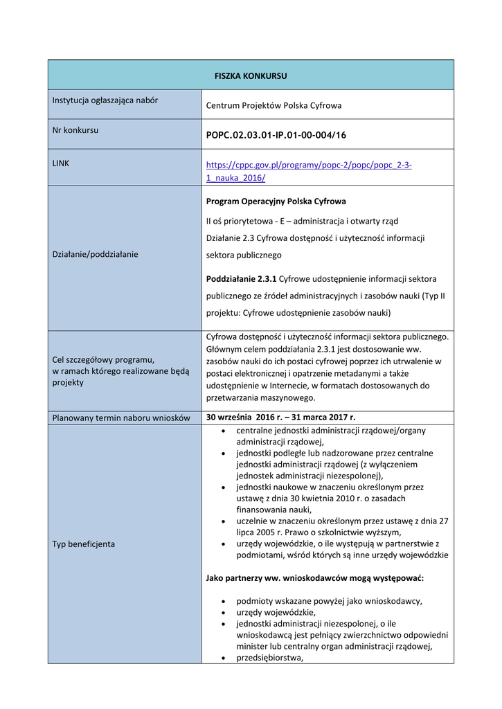 FISZKA KONKURSU Instytucja ogłaszająca nabór Centrum Projektów Polska Cyfrowa Nr konkursu POPC.02.03.01-IP.01-00-004/16 LINK https://cppc.gov.pl/programy/popc-2/popc/popc_2-31_nauka_2016/ Program Operacyjny Polska Cyfrowa II oś priorytetowa - E – administracja i otwarty rząd Działanie 2.3 Cyfrowa dostępność i użyteczność informacji Działanie/poddziałanie sektora publicznego Poddziałanie 2.3.1 Cyfrowe udostępnienie informacji sektora publicznego ze źródeł administracyjnych i zasobów nauki (Typ II projektu: Cyfrowe udostępnienie zasobów nauki) Cel szczegółowy programu, w ramach którego realizowane będą projekty Planowany termin naboru wniosków Typ beneficjenta Cyfrowa dostępność i użyteczność informacji sektora publicznego. Głównym celem poddziałania 2.3.1 jest dostosowanie ww. zasobów nauki do ich postaci cyfrowej poprzez ich utrwalenie w postaci elektronicznej i opatrzenie metadanymi a także udostępnienie w Internecie, w formatach dostosowanych do przetwarzania maszynowego. 30 września 2016 r. – 31 marca 2017 r. centralne jednostki administracji rządowej/organy administracji rządowej, jednostki podległe lub nadzorowane przez centralne jednostki administracji rządowej (z wyłączeniem jednostek administracji niezespolonej), jednostki naukowe w znaczeniu określonym przez ustawę z dnia 30 kwietnia 2010 r. o zasadach finansowania nauki, uczelnie w znaczeniu określonym przez ustawę z dnia 27 lipca 2005 r. Prawo o szkolnictwie wyższym, urzędy wojewódzkie, o ile występują w partnerstwie z podmiotami, wśród których są inne urzędy wojewódzkie Jako partnerzy ww. wnioskodawców mogą występować: podmioty wskazane powyżej jako wnioskodawcy, urzędy wojewódzkie, jednostki administracji niezespolonej, o ile wnioskodawcą jest pełniący zwierzchnictwo odpowiedni minister lub centralny organ administracji rządowej, przedsiębiorstwa, organizacje pozarządowe 65 000 000 PLN W konkursie minimalna wartość wydatków kwalifikowalnych Planowana alokacja (PLN)/ Maksymalna wartość projektu projektu nie może być niższa niż 4 mln PLN. Maksymalna wartość wydatków kwalifikowalnych projektu złożonego do dofinansowania w ramach poddziałania 2.3.1 nie może przekroczyć 50 mln EUR. Maksymalne dofinansowanie wynosi 100 % wydatków kwalifikowanych projektu. Wymagany wkład własny Typ II: cyfrowe udostępnienie zasobów nauki Typy projektów przewidziane do realizacji w ramach konkursu Zasoby nauki na potrzeby konkursu należy interpretować jako obiekty związane tematycznie z nauką lub popularyzacją nauki. Zasoby nauki mogą obejmować m.in.: publikacje naukowe, prace dyplomowe, bazy danych, repozytoria cyfrowe, portale i strony internetowe, oprogramowanie, dane badawcze i wyniki badań naukowych, statystyki, mapy i obiekty o wartości naukowej, a także wytworzone w wyniku działalności Wnioskodawcy lub Partnerów projektu książki, czasopisma oraz materiały dydaktyczne i promujące naukę. ZAKŁADANE EFEKTY KONKURSU WYRAŻONE WSKAŹNIKAMI Liczba podmiotów, które udostępniły on-line informacje sektora publicznego, Obligatoryjne wskaźniki kluczowe Liczba pobrań/odtworzeń dokumentów zawierających informacje sektora publicznego. SZCZEGÓŁOWE KRYTERIA WYBORU PROJEKTÓW Ocenie podlega czy: - Projekt jest realizowany na terytorium Rzeczypospolitej Polskiej. KRYTERIA DOSTĘPU - Odbyła się publiczna prezentacja założeń projektu, z której protokół został załączony do wniosku o dofinansowanie. Informacja o terminie i miejscu publicznej prezentacji założeń projektu podlega udostępnieniu co najmniej na 14 dni przed dniem publicznej prezentacji. - Wnioskodawca przeprowadził inwentaryzację zasobów nauki objętych projektem: opis przeprowadzonej inwentaryzacji zasobów nauki, które mają zostać objęte projektem, wskazując co najmniej: rodzaj i ilość poszczególnych zasobów, ich stopień unikalności, aktualny i planowany w ramach projektu zakres ich cyfrowego udostępnienia, planowany w ramach projektu model prawny cyfrowego udostępnienia zasobów oraz prawne możliwości i ograniczenia dla ich ponownego wykorzystania. - Założenia projektu są zgodne ze zdiagnozowanymi potrzebami grup docelowych, dla których udostępnia się cyfrowo zasoby nauk. - Cyfrowe udostępnianie zasobów nauki będzie realizowane w oparciu o metody projektowania zorientowanego na użytkownika: korzystanie z cyfrowo udostępnianych zasobów nauki objętych projektem będzie możliwe niezależnie od miejsca przebywania i wykorzystywanej technologii; Poziom cyfrowej dostępności zasobów nauki1 proponowany w ramach projektu jest zgodny z wynikami badań potrzeb grup docelowych; zaplanowano działania polegające na monitorowaniu cyfrowego udostępniania zasobów nauki pod kątem dostępności i użyteczności graficznych interfejsów dla wszystkich grup docelowych, ciągłości działania i powszechności wykorzystania oraz satysfakcji użytkowników. 0-20 punktów (0 punktów w kryterium nie oznacza odrzucenia wniosku). - Wnioskodawca powinien przedstawić wiarygodny, skuteczny i efektywny plan działań promocyjnych i informacyjnych, dotyczących poinformowania grup docelowych o cyfrowym udostępnianiu zasobów nauki objętych projektem. Plan powinien uwzględniać informacje uzyskane w trakcie przeprowadzania badań potrzeb grup docelowych, zwłaszcza aktualnych i prognozowanych potrzeb grup docelowych. Plan powinien uwzględniać również kwestie związane z podniesieniem świadomości i umiejętności, niezbędnych do korzystania z efektów projektu przez grupy docelowe. 0 lub 8 punktów (0 punktów w kryterium nie oznacza odrzucenia wniosku. - Wnioskodawca powinien wiarygodnie wykazać, że projekt zakłada cyfrowe udostępnienie zasobów mających duże znaczenie dla obszaru nauki, uwzględniając obecny i docelowy sposób cyfrowego udostępniana zasobów nauki. Wnioskodawca powinien także określić potencjał ponownego wy