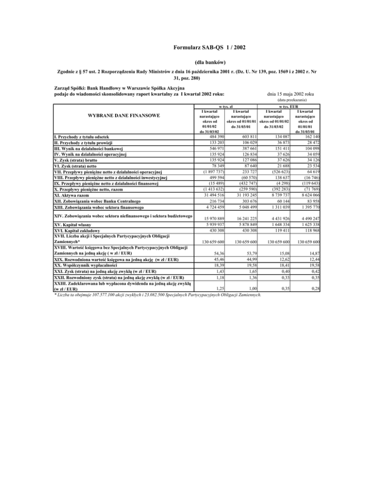 podaje do wiadomości skonsolidowany raport kwartalny za I kwartał 2002 roku: