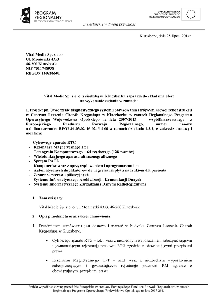 Inwestujemy w Twoją przyszłość Kluczbork, dnia 28 lipca 2014r. Vital Medic Sp. z o. o. Ul. Moniuszki 4A/3 46-200 Kluczbork NIP 7511748938 REGON 160286601 Vital Medic Sp. z o. o. z siedzibą w Kluczborku zaprasza do składania ofert na wykonanie zadania w ramach: 1. Projekt pn. Utworzenie diagnostycznego systemu obrazowania i trójwymiarowej rekonstrukcji w Centrum Leczenia Chorób Kręgosłupa w Kluczborku w ramach Regionalnego Programu Operacyjnego Województwa Opolskiego na lata 2007-2013, współfinansowanego z Europejskiego Funduszu Rozwoju Regionalnego, numer umowy o dofinansowanie: RPOP.01.03.02-16-024/14-00 w ramach działania 1.3.2, w zakresie dostawy i montażu: - Cyfrowego aparatu RTG Rezonansu Magnetycznego 1,5T Tomografu Komputerowego – 64-rzędowego (128-warstw) Wielofunkcyjnego aparatu ultrasonograficznego Sprzętu PACS Komputerów wraz z oprzyrządowaniem i oprogramowaniem Automatycznych duplikatorów do nagrywania płyt z nadrukiem dla pacjenta Zestaw serwerów aplikacyjnych Systemu Informatycznego Archiwizacji i Komunikacji Danych Systemu Informatycznego Zarządzania Danymi Radiologicznymi 1. Zamawiający Vital Medic Sp. z o. o. ul. Moniuszki 4A/3, 46-200 Kluczbork 2. Opis przedmiotu oraz zakres zamówienia: 1. Przedmiotem zamówienia jest dostawa i montaż w budynku Centrum Leczenia Chorób Kręgosłupa w Kluczborku: Cyfrowego aparatu RTG – szt.1 wraz z niezbędnym wyposażeniem zabezpieczającym i gwarantującym rejestrację pracowni RTG zgodnie z obowiązującymi przepisami prawa Rezonansu Magnetycznego 1,5T – szt.1 wraz z niezbędnym wyposażeniem zabezpieczającym i gwarantującym rejestrację pracowni RM zgodnie z obowiązującymi przepisami prawa Projekt współfinansowany przez Unię Europejską ze środków Europejskiego Funduszu Rozwoju Regionalnego w ramach Regionalnego Programu Operacyjnego Województwa Opolskiego na lata 2007-2013 Inwestujemy w Twoją przyszłość Tomografu Komputerowego 64- rzędowego (128-warstw) – szt.1 wraz z niezbędnym wyposażeniem zabezpieczającym i gwarantującym rejestrację pracowni TK, zgodnie z obowiązującymi przepisami prawa Wielofunkcyjnego aparatu ultrasonograficznego – szt.1 Sprzętu PACS – szt.1 Komputerów wraz z oprzyrządowaniem i oprogramowaniem – szt.8 Automatycznych duplikatorów do nagrywania płyt z nadrukiem dla pacjenta – szt.2 Zestaw serwerów aplikacyjnych - zestaw 1 Systemu Informatycznego Archiwizacji i Komunikacji Danych – szt.1 Systemu Informatycznego Zarządzania Danymi Radiologicznymi – szt.1 2. Na żądanie oferenta zamawiający udostępni szczegółowe specyfikacje techniczne przedmiotu zamówienia dla w/w sprzętu. 3. Rodzaje i opis kryteriów, którymi zamawiający będzie się kierował przy wyborze oferty, wraz z podaniem znaczenia tych kryteriów i sposobu oceny ofert oraz opis sposobu obliczenia ceny. Przy wyborze ofert zamawiający będzie się kierował następującymi formalnymi kryteriami dostępu: 1. Oferent musi posiadać wystarczający potencjał techniczny i finansowy oraz posiadać wszelkie wymagane uprawnienia do realizacji przedmiotowego zamówienia udokumentowany stosownymi referencjami w postaci potwierdzenia realizacji warunków dostawy. 2. Oferent oświadczy, że udzieli w ramach należytego wykonania zakresu prac na dostawę i montaż sprzętu i oprogramowania objętych niniejszym zamówieniem gwarancji na okres 1 rok od daty odbioru końcowego. 3. Oferent oświadczy, że akceptuje sposób rozliczenia z zamawiającym należnych mu kwot z tytułu realizacji zamówienia polegający na rozliczeniu końcowy obejmujących całościowo dostawę i montaż sprzętu i oprogramowania, które po ich zakończeniu i dokonaniu odbioru przez przedstawiciela Vital Medic Sp. z o.o. zostaną zafakturowane zamawiającemu i opatrzone terminem zapłaty nie krótszym niż 60 dni. 4. Oferent oświadczy, że jego oferta opiera się na jego własnej ocenie zakresu zamówienia, a swoją ofertę oparł o stan faktyczny zawarty w udostępnionych na żądanie oferenta projektach wykonawczych dotyczących zamówienia. Projekt współfinansowany przez Unię Europejską ze środków Europejskiego Funduszu Rozwoju Regionalnego w ramach Regionalnego Programu Operacyjnego Województwa Opolskiego na lata 2007-2013 Inwestujemy w Twoją przyszłość Spełnienie powyższych formalnych kryteriów dostępu dopuszcza ofertę do oceny merytorycznej w której jedynym kryterium będzie cena netto za dostawę i montaż sprzętu i oprogramowania objętego przedmiotowym zamówieniem. 1. Kryterium merytoryczne : cena netto - waga 100% Sposób oceny ofert: Zamawiający wybierze najtańszą ofertę spośród ofert zawierających całkowitą cenę netto. 4. Termin realizacji zamówienia 1. Dostawa sprzętu do 15.10.2014r. 5. Miejsce, sposób i termin składania ofert Oferty powinny zostać doręczone do biura zamawiającego: Vital Medic Sp. z o.o. 46-200 Kluczbork, ul. Moniuszki 4A/3. Oferty należy złożyć w terminie do dnia 04.08.2014r. do godz. 10:00. 6. Opis warunków udziału w postępowaniu: Oferta musi zawierać minimum takie informacje jak: - dane oferenta, - dane zamawiającego, do którego skierowana jest oferta, - całkowitą cenę netto i brutto, - oświadczenia i referencje wymagane kryteriami formalnymi, - datę realizacji zamówienia, - datę ważności oferty nie krótszą niż 30 dni od daty sporządzenia oferty, - datę sporządzenia oferty, - podpis i pieczęć oferenta, - KRS lub wypis z rejestru ewidencji gospodarczej oferenta. 7. Rozstrzygniecie postępowania i zlecenie realizacji zamówienia Postępowanie ofertowe zostanie rozstrzygnięte w dniu 05.08.2014 do godz. 12.00. Po tym dniu zostanie przekazana oferentom, którzy spełnią wymogi formalne niniejszego postępowania informacja o wyborze najkorzystniejszej oferty. W przypadku pytań prosimy o kontakt na telefon 77 447 14 87. Zgodnie z art. 70¹ §3 KC, zamawiający zastrzega sobie prawo zmiany treści i warunków niniejszego