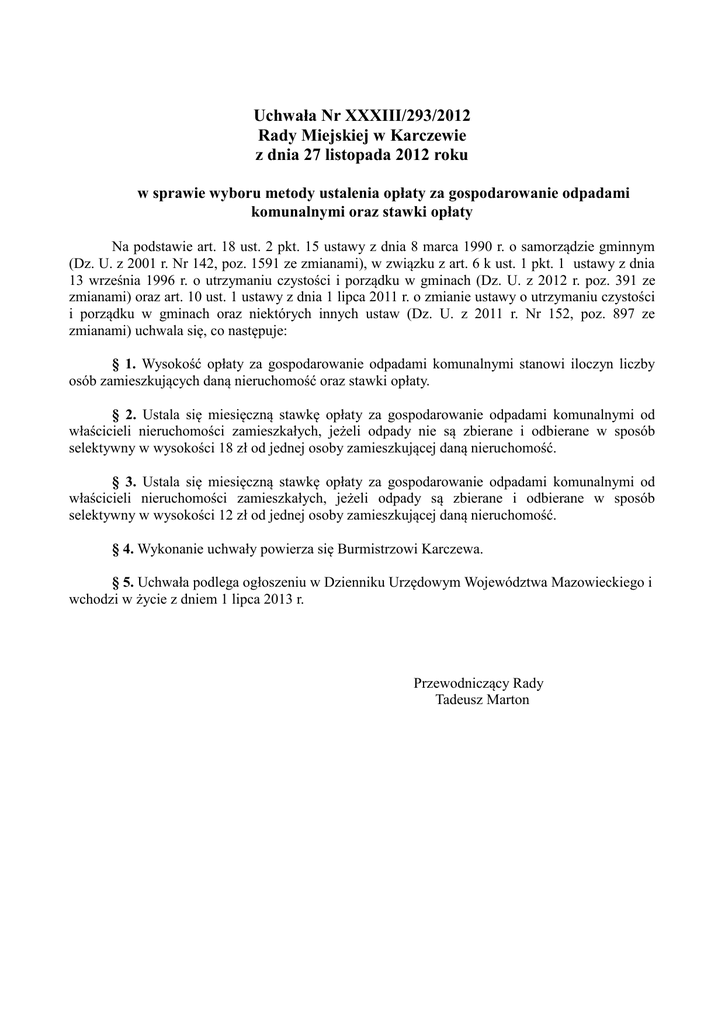 Uchwała Nr XXXIII/293/2012 Rady Miejskiej w Karczewie z dnia 27 listopada 2012 roku w sprawie wyboru metody ustalenia opłaty za gospodarowanie odpadami komunalnymi oraz stawki opłaty Na podstawie art. 18 ust. 2 pkt. 15 ustawy z dnia 8 marca 1990 r. o samorządzie gminnym (Dz. U. z 2001 r. Nr 142, poz. 1591 ze zmianami), w związku z art. 6 k ust. 1 pkt. 1 ustawy z dnia 13 września 1996 r. o utrzymaniu czystości i porządku w gminach (Dz. U. z 2012 r. poz. 391 ze zmianami) oraz art. 10 ust. 1 ustawy z dnia 1 lipca 2011 r. o zmianie ustawy o utrzymaniu czystości i porządku w gminach oraz niektórych innych ustaw (Dz. U. z 2011 r. Nr 152, poz. 897 ze zmianami) uchwala się, co następuje: § 1. Wysokość opłaty za gospodarowanie odpadami komunalnymi stanowi iloczyn liczby osób zamieszkujących daną nieruchomość oraz stawki opłaty. § 2. Ustala się miesięczną stawkę opłaty za gospodarowanie odpadami komunalnymi od właścicieli nieruchomości zamieszkałych, jeżeli odpady nie są zbierane i odbierane w sposób selektywny w wysokości 18 zł od jednej osoby zamieszkującej daną nieruchomość. § 3. Ustala się miesięczną stawkę opłaty za gospodarowanie odpadami komunalnymi od właścicieli nieruchomości zamieszkałych, jeżeli odpady są zbierane i odbierane w sposób selektywny w wysokości 12 zł od jednej osoby zamieszkującej daną nieruchomość. § 4. Wykonanie uchwały powierza się Burmistrzowi Karczewa. § 5. Uchwała podlega ogłoszeniu w Dzienniku Urzędowym Województwa Mazowieckiego i wchodzi w życie z dniem 1 lipca 2013 r. Przewodniczący Rady Tadeusz Marton Uzasadnienie W związku z nowelizacją ustawy z dnia 13 września 1996 r. o utrzymaniu czystości i porządku w gminach, Gmina Karczew ma obowiązek zorganizować system gospodarowania odpadami komunalnymi wszystkich właścicieli nieruchomości zamieszkałych. W tym celu Rada Miejska w Karczewie powinna dokonać wyboru metody ustalania opłaty za gospodarowanie odpadami komunalnymi oraz stawki opłaty. Przez właściciela nieruchomości zgodnie z art. 2 ust. 1 pkt. 4 ww. ustawy rozumie się także również współwłaścicieli, użytkowników wieczystych oraz jednostki organizacyjne i osoby posiadające nieruchomość w zarządzie lub użytkowaniu, a także inne podmioty władające nieruchomością, np. najemca, dzierżawca, samoistny posiadacz nieruchomości. Przyjęta w uchwale metoda ustalenia opłaty za gospodarowanie odpadami komunalnymi stanowi iloczyn liczby osób zamieszkujących daną nieruchomość oraz stawki opłaty, która została określona na podstawie liczby osób zamieszkujących Gminę Karczew, ilości wytwarzanych odpadów na jej terenie oraz kosztów funkcjonowania systemu gospodarowania odpadami komunalnymi (tj. odbierania, transportu, zbierania, odzysku i unieszkodliwiania odpadów, tworzenia i utrzymania punktu selektywnej zbiórki, obsługi administracyjnej systemu) w oparciu o dostępne dane i wykonane prognozy wymienionych wielkości. Zgodnie z ustawą o utrzymaniu czystości i porządku w gminach do obowiązków Rady Miejskiej w Karczewie należy ustalenie niższej stawki za odbiór odpadów komunalnych w przypadku gdy są one zbierane i odbierane w sposób selektywny. W uchwale uwzględniono wymogi w tym zakresie, co stanowi istotną zachętę do selektywnego gromadzenia odpadów. Niniejsza uchwała jest podstawą do prowadzenia dalszych działań mających na celu wprowadzenie nowego systemu gospodarowania odpadami komunalnymi w Gminie Karczew od lipca 2013 r. Zgodnie z art. 10 ust. 1 ustawy z dnia 1 lipca 2011 r. o zmianie ustawy o utrzymaniu czystości i porządku w gminach oraz niektórych innych ustaw (Dz. U. z 2011 r. Nr 152, poz. 897 ze zmianami) Rada Miejska w Karczewie zobowiązana jest podjąć uchwałę w wyboru metody ustalenia opłaty za gospodarowanie odpadami komunalnymi oraz stawki opłaty za gospodarowanie odpadami komunalnymi w terminie 12 miesięcy od wejścia ustawy w życie tj. do końca 2012 r.
