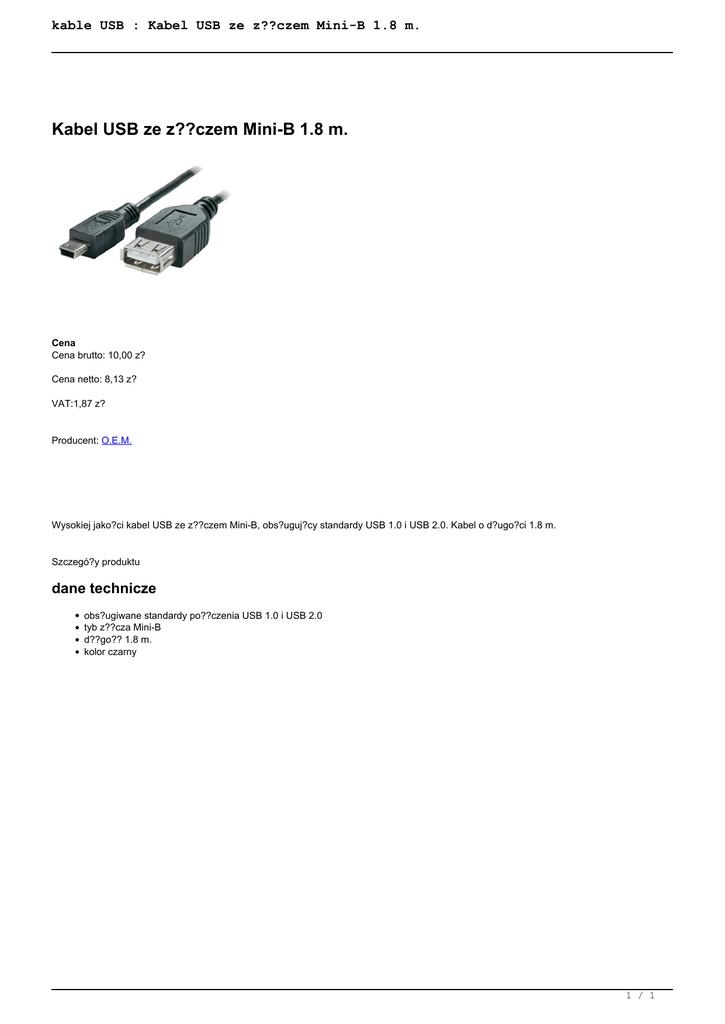 kable USB : Kabel USB ze z??czem Mini-B 1.8 m. Kabel USB ze z??czem Mini-B 1.8 m. Cena Cena brutto: 10,00 z? Cena netto: 8,13 z? VAT:1,87 z? Producent: O.E.M. Wysokiej jako?ci kabel USB ze z??czem Mini-B, obs?uguj?cy standardy USB 1.0 i USB 2.0. Kabel o d?ugo?ci 1.8 m. Szczegó?y produktu dane technicze obs?ugiwane standardy po??czenia USB 1.0 i USB 2.0 tyb z??cza Mini-B d??go?? 1.8 m. kolor czarny 1 / 1 Powered by TCPDF (www.tcpdf.org)