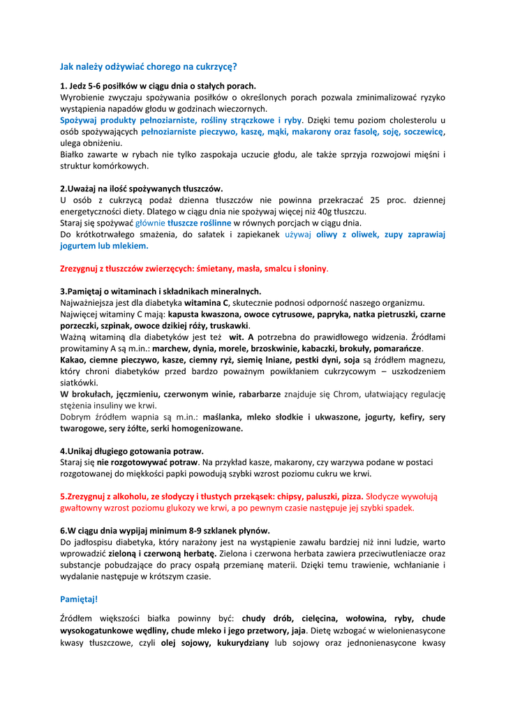 Jak należy odżywiać chorego na cukrzycę? 1. Jedz 5-6 posiłków w ciągu dnia o stałych porach. Wyrobienie zwyczaju spożywania posiłków o określonych porach pozwala zminimalizować ryzyko wystąpienia napadów głodu w godzinach wieczornych. Spożywaj produkty pełnoziarniste, rośliny strączkowe i ryby. Dzięki temu poziom cholesterolu u osób spożywających pełnoziarniste pieczywo, kaszę, mąki, makarony oraz fasolę, soję, soczewicę, ulega obniżeniu. Białko zawarte w rybach nie tylko zaspokaja uczucie głodu, ale także sprzyja rozwojowi mięśni i struktur komórkowych. 2.Uważaj na ilość spożywanych tłuszczów. U osób z cukrzycą podaż dzienna tłuszczów nie powinna przekraczać 25 proc. dziennej energetyczności diety. Dlatego w ciągu dnia nie spożywaj więcej niż 40g tłuszczu. Staraj się spożywać głównie tłuszcze roślinne w równych porcjach w ciągu dnia. Do krótkotrwałego smażenia, do sałatek i zapiekanek używaj oliwy z oliwek, zupy zaprawiaj jogurtem lub mlekiem. Zrezygnuj z tłuszczów zwierzęcych: śmietany, masła, smalcu i słoniny. 3.Pamiętaj o witaminach i składnikach mineralnych. Najważniejsza jest dla diabetyka witamina C, skutecznie podnosi odporność naszego organizmu. Najwięcej witaminy C mają: kapusta kwaszona, owoce cytrusowe, papryka, natka pietruszki, czarne porzeczki, szpinak, owoce dzikiej róży, truskawki. Ważną witaminą dla diabetyków jest też wit. A potrzebna do prawidłowego widzenia. Źródłami prowitaminy A są m.in.: marchew, dynia, morele, brzoskwinie, kabaczki, brokuły, pomarańcze. Kakao, ciemne pieczywo, kasze, ciemny ryż, siemię lniane, pestki dyni, soja są źródłem magnezu, który chroni diabetyków przed bardzo poważnym powikłaniem cukrzycowym – uszkodzeniem siatkówki. W brokułach, jęczmieniu, czerwonym winie, rabarbarze znajduje się Chrom, ułatwiający regulację stężenia insuliny we krwi. Dobrym źródłem wapnia są m.in.: maślanka, mleko słodkie i ukwaszone, jogurty, kefiry, sery twarogowe, sery żółte, serki homogenizowane. 4.Unikaj długiego gotowania potraw. Staraj się nie rozgotowywać potraw. Na przykład kasze, makarony, czy warzywa podane w postaci rozgotowanej do miękkości papki powodują szybki wzrost poziomu cukru we krwi. 5.Zrezygnuj z alkoholu, ze słodyczy i tłustych przekąsek: chipsy, paluszki, pizza. Słodycze wywołują gwałtowny wzrost poziomu glukozy we krwi, a po pewnym czasie następuje jej szybki spadek. 6.W ciągu dnia wypijaj minimum 8-9 szklanek płynów. Do jadłospisu diabetyka, który narażony jest na wystąpienie zawału bardziej niż inni ludzie, warto wprowadzić zieloną i czerwoną herbatę. Zielona i czerwona herbata zawiera przeciwutleniacze oraz substancje pobudzające do pracy ospałą przemianę materii. Dzięki temu trawienie, wchłanianie i wydalanie następuje w krótszym czasie. Pamiętaj! Źródłem większości białka powinny być: chudy drób, cielęcina, wołowina, ryby, chude wysokogatunkowe wędliny, chude mleko i jego przetwory, jaja. Dietę wzbogać w wielonienasycone kwasy tłuszczowe, czyli olej sojowy, kukurydziany lub sojowy oraz jednonienasycone kwasy tłuszczowe, czyli oliwę z oliwek i olej rzepakowy, jednocześnie unikając nasyconych kwasów tłuszczowych, takich jak smalec, słonina, tłuste mięso, wędliny, masło, tłuste mleko i jego przetwory. Zwiększ też udział w diecie związków antyoksydacyjnych, czyli witamin C, E i β-karotenu, związków polifenolowych oraz zwróć uwagę na prawidłową podaż witamin B6, B12 i kwasu foliowego, żeby nie dopuścić do homocysteinemii. Ostrożnie z owocami Wybieraj mniej słodkie owoce czyli takie, które zawierają w 100 g do 10 g węglowodanów, np. arbuz, cytryna, grejpfrut, truskawki oraz wiśnie. Nie przesadź z ananasem, brzoskwiniami, gruszkami jabłkami, pomarańczami, morelami, śliwkami, czereśniami, jagodami, kiwi i malinami (mają 10- 15 g cukrów w 100 g). Ich porcja nie powinna przekroczyć 150 g. Unikaj natomiast winogron i bananów. Soki pij niesłodzone, świeżo wyciskane, najlepiej rozcieńczaj je wodą. Dietę pomoże ułożyć tabela wymienników węglowodanowych http://www.poradnikzdrowie.pl/diety/lecznicze/wymienniki-weglowodanowe-tabela-pomozeulozyc-diete_38429.html http://www.poradnikzdrowie.pl/diety/lecznicze/dieta-cukrzyka-proste-zasady-odzywiania-przycukrzycy_40998.html Więcej informacji o bezpłatnej pomocy dla wrocławian chorych na cukrzycę na stronie: http://www.spzoz.wroc.pl/pl/programy_zdrowotne