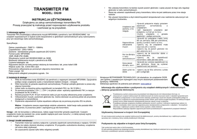 TRANSMITER FM MODEL: OG39 INSTRUKCJA UŻYTKOWANIA • • • Nie ustawiaj transmitera na bardzo wysoki poziom głośności. Lepiej używać do tego celu regulacji głośności w radiu samochodowym. Staraj się ustawiać częstotliwość pracy transmitera, która nie jest zakłócana przez inne stacje radiowe Nie używać transmitera w zbyt niskich/wysokich temperaturach oraz nadmiernie zakurzonym lub wilgotnym środowisku. Dziękujemy za zakup samochodowego transmittera FM. Proszę przeczytać tę instrukcję przed rozpoczęciem użytkowania produktu i zachować ją na przyszłość. 1. Informacje ogólne Transmiter FM umożliwiający odtwarzanie muzyki MP3/WMA z pendrive'a, kart /SD/SDHC/MMC lub urządzeń wyposażonych w wyjście audio bezpośrednio w głośnikach samochodowych (przy wykorzystaniu przy tym dowolnego radia samochodowego). Specyfikacja: Zakres częstotliwości : FM87.5 - 108MHz Częstotliwości : 20Hz-15KHz Zasilanie : standardowe gniazdo zapalniczki (DC12/24V) Format audio: MP3/WMA .SNR: 85dB (FM: 65dB) Wbudowany czytnik kart SD/SDHC/MMC do 16GB Możliwość odtwarzania muzyki z pendrive'a do 8GB Czytanie katalogów: tak Wgrywanie danych na kartę pamięci włożoną do transmitera: tak, przez kabel USB Wejście audio: tak, 3,5mm Mini Jack Wznowienie odtwarzania po ponownym włączeniu transmitera: tak Pobór energii: 1W Maksymalna odległość przesyłania sygnału : 5m 2. Instalacja & obsługa 1. Włóż do transmitera kartę SD/SDHC lub pendrive'a z nagranymi utworami MP3/WMA. Opcjonalnie podłącz swoje urządzenie audio z transmiterem kablem minijack – minijack. 2. Włóż transmiter do gniazda zapalniczki samochodowej. Przekręć pokrętło głośności w prawo aby włączyć transmiter. 3. Ustaw radio na dowolną wolną częstotliwość na kanałach FM ( np. 94,10 MHz ) 4. Za pomocą przycisków ( CH- ) , ( CH+ ) na pilocie ustaw wybraną częstotliwość FM ( w naszym przykładzie do 94,10 MHz ). 5. Naciśnij przycisk PLAY. W tym momencie radio już gra muzykę odtwarzaną przez urządzenie. 6. Odtwarzaniem muzyki, poziomem głośności itp. można sterować za pomocą pilota lub przycisków dostępnych w transmitterze. 7. Wybieranie odpowiednich trybów equalizera odbywa się za pomocą przycisku EQ na pilocie. Ważne : Urządzenie zawsze zapamiętuje ostatnie ustawienie. Jeżeli twoje radio posiada kilka programów, to przeznacz jeden i zaprogramuj go dla transmitera. Uwaga : Jak nie korzystasz z odtwarzacza, należy wyjąć transmiter gniazda zapalniczki. Czasami urządzenie może się zawiesić (np. przez spadek napięcia pod czas rozruchu ), w takiej sytuacji wyjmij nośnik muzyki i włóż z powrotem. 3. Uwagi i środki ostrożności • Transmiter może być zasilany wyłącznie z gniazda zapalniczki samochodowej o napięciu 12V/24V. • Nigdy nie należy otwierać obudowy urządzenia. W przypadku uszkodzenia obudowy, urządzenia nie wolno dalej użytkować. • Do czyszczenia używać tylko lekko wilgotnej szmatki. Niniejszym BOTHWINNER TECHNOLOGY, Ltd oświadcza, że urządzenie OG39 jest zgodne z zasadniczymi wymogami oraz innymi stosownymi postanowieniami dyrektywy 1999/5/WE. Deklaracja zgodności do pobrania pod adresem: www.aptel.pl IMPORTER: APTEL P.U.H, http://www.aptel.pl