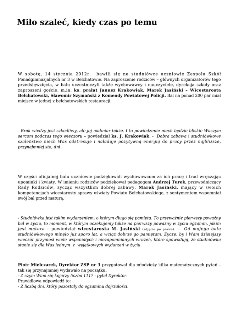 Miło szaleć, kiedy czas po temu W sobotę, 14 stycznia 2012r. bawili się na studniówce uczniowie Zespołu Szkół Ponadgimnazjalnych nr 3 w Bełchatowie. Na zaproszenie rodziców – głównych organizatorów tego przedsięwzięcia, w balu uczestniczyli także wychowawcy i nauczyciele, dyrekcja szkoły oraz zaproszeni goście, m.in. ks. prałat Janusz Krakowiak, Marek Jasiński – Wicestarosta Bełchatowski, Sławomir Szymański z Komendy Powiatowej Policji. Bal na ponad 200 par miał miejsce w jednej z bełchatowskich restauracji. - Brak wiedzy jest szkodliwy, ale jej nadmiar także. I to powiedzenie niech będzie bliskie Waszym sercom podczas tego wieczoru – powiedział ks. J. Krakowiak. - Dobra zabawa i studniówkowe szaleństwo niech Was odstresuje i naładuje pozytywną energią do pracy przez najbliższe, przynajmniej sto, dni . W części oficjalnej balu uczniowie podziękowali wychowawcom za ich pracę i trud wręczając upominki i kwiaty. W imieniu rodziców podziękował pedagogom Andrzej Turek, przewodniczący Rady Rodziców, życząc wszystkim dobrej zabawy. Marek Jasiński, mający w swoich kompetencjach wicestarosty sprawy oświaty Powiatu Bełchatowskiego, z sentymentem wspomniał swój bal przed maturą. - Studniówka jest takim wydarzeniem, o którym długo się pamięta. To przeważnie pierwszy poważny bal w życiu, to moment, w którym oczekujemy także na pierwszy poważny w życiu egzamin, jakim jest matura – powiedział wicestarosta M. Jasiński (zdjęcie po prawo) - Od mojego balu studniówkowego minęło już sporo lat, a wciąż dobrze go pamiętam. Życzę, by i Wam dzisiejszy wieczór przyniósł wiele wspaniałych i niezapomnianych wrażeń, które spowodują, że studniówka stanie się dla Was jednym z wyjątkowych wydarzeń w życiu. Piotr Mielczarek, Dyrektor ZSP nr 3 przygotował dla młodzieży kilka matematycznych pytań – tak się przynajmniej wydawało na początku. - Z czym Wam się kojarzy liczba 111? - pytał Dyrektor. Prawidłowa odpowiedź to: - Z liczbą dni, który pozostały do egzaminu dojrzałości. Uczniowie znali tę wielkość, nawet w przeliczeniu na godziny. - Kilka lat temu wybraliście tę szkołę, zwaną potocznie „Energolem”. Gratuluję Wam i dobrego wyboru i tego, że dotrwaliście do tej chwili. Wierzę, że jesteście dobrze przygotowani do matury i do studiów, co pozwoli Wam zdobyć wymarzony zawód i dobrą pracę. Tradycja studniówek wciąż ewoluuje. Na szczęście, nie wszystkie jej elementy uległy zmianie lub zapomnieniu. Tańczenie poloneza przez uczniów, co rozpoczyna ten bal, jest momentem niezwykle widowiskowym i wzruszającym, ale przede wszystkim integralnym elementem studniówki. Tak też było na sobotniej zabawie uczniów ZSP nr 3. Okazuje się, że niektóre studniówkowe przesądy także nadal żyją, Na przykład: bielizna w kolorze czerwonym zakładana w ten wyjątkowy wieczór gwarantuje ponoć pomyślność na maturze. Oglądaj galerię zdjęć. A.Zawodzińska, Wydział Promocji i Rozwoju Powiatu
