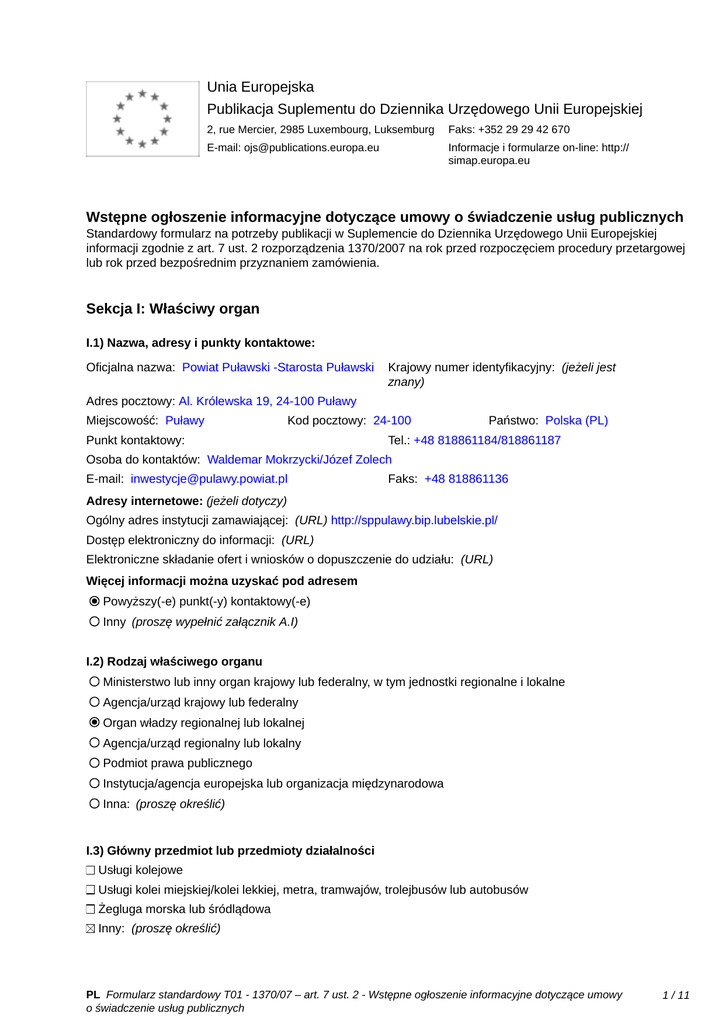 Unia Europejska Publikacja Suplementu do Dziennika Urzędowego Unii Europejskiej 2, rue Mercier, 2985 Luxembourg, Luksemburg Faks: +352 29 29 42 670 E-mail: [email protected] Informacje i formularze on-line: http:// simap.europa.eu Wstępne ogłoszenie informacyjne dotyczące umowy o świadczenie usług publicznych Standardowy formularz na potrzeby publikacji w Suplemencie do Dziennika Urzędowego Unii Europejskiej informacji zgodnie z art. 7 ust. 2 rozporządzenia 1370/2007 na rok przed rozpoczęciem procedury przetargowej lub rok przed bezpośrednim przyznaniem zamówienia. Sekcja I: Właściwy organ I.1) Nazwa, adresy i punkty kontaktowe: Oficjalna nazwa: Powiat Puławski -Starosta Puławski Krajowy numer identyfikacyjny: (jeżeli jest znany) _____ Adres pocztowy: Al. Królewska 19, 24-100 Puławy Miejscowość: Puławy Kod pocztowy: 24-100 Punkt kontaktowy: _____ Państwo: Polska (PL) Tel.: +48 818861184/818861187 Osoba do kontaktów: Waldemar Mokrzycki/Józef Zolech E-mail: [email protected] Faks: +48 818861136 Adresy internetowe: (jeżeli dotyczy) Ogólny adres instytucji zamawiającej: (URL) http://sppulawy.bip.lubelskie.pl/ Dostęp elektroniczny do informacji: (URL) _____ Elektroniczne składanie ofert i wniosków o dopuszczenie do udziału: (URL) _____ Więcej informacji można uzyskać pod adresem Powyższy(-e) punkt(-y) kontaktowy(-e) Inny (proszę wypełnić załącznik A.I) I.2) Rodzaj właściwego organu Ministerstwo lub inny organ krajowy lub federalny, w tym jednostki regionalne i lokalne Agencja/urząd krajowy lub federalny Organ władzy regionalnej lub lokalnej Agencja/urząd regionalny lub lokalny Podmiot prawa publicznego Instytucja/agencja europejska lub organizacja międzynarodowa Inna: (proszę określić) I.3) Główny przedmiot lub przedmioty działalności Usługi kolejowe Usługi kolei miejskiej/kolei lekkiej, metra, tramwajów, trolejbusów lub autobusów Żegluga morska lub śródlądowa Inny: (proszę określić) PL Formularz standardowy T01 - 1370/07 – art. 7 ust. 2 - Wstępne ogłoszenie informacyjne dotyczące umowy o świadczenie usług publicznych 1 / 11 ogólne usługi publiczne (w ramach zadań przypisanych administracji samorządzowej) I.4) Udzielenie zamówienia w imieniu innych właściwych organów Właściwy organ dokonuje zakupu w imieniu innych właściwych organów: tak nie (jeżeli tak, więcej informacji o tych właściwych organach można podać w załączniku A.II) PL Formularz standardowy T01 - 1370/07 – art. 7 ust. 2 - Wstępne ogłoszenie informacyjne dotyczące umowy o świadczenie usług publicznych 2 / 11 Sekcja II: Przedmiot zamówienia II.1) Opis: II.1.1) Nazwa nadana zamówieniu: Wybór operatora publicznego transportu zbiorowego. Organizowanie publicznego transportu zbiorowego na terenie powiatu puławskiego II.1.2) Rodzaj zamówienia, dziedzina(-y), której(-ych) dotyczą usługi transportu publicznego: Kategoria usług: nr: T-05 (Zob. kategorie usług w załączniku B) Dziedziny, których dotyczą usługi transportu publicznego: Przewozy autobusowe w transporcie zbiorowym, transport pasażerski Kod NUTS: PL315 II.1.3) Krótki opis zamówienia: Świadczenie usług w zakresie publicznego transportu zbiorowego na sieci komunikacyjnej obejmującej obszar Powiatu Puławskiego. Organizator dokona wyboru operatora w trybie art.19 ust.1 pkt.2 ustawy z 16 grudnia 2010 roku o publicznym transporcie zbiorowym (Dz.U. z 2011 roku, Nr 5, poz.13 z późn.zm.) II.1.4) Wspólny Słownik Zamówień (CPV) Główny przedmiot Słownik główny 60112000 Słownik uzupełniający (jeżeli dotyczy) II.1.5) Informacje na temat podwykonawstwa Przewidywane jest zlecenie podwykonawstwa: tak nie (jeżeli tak) Wartość lub część zamówienia, które prawdopodobnie będzie zlecone stronom trzecim: minimalny procent: _____ (%), maksymalny procent: _____ (%) wartości zamówienia albo Nieznana Krótki opis wartości/części zamówienia, które będzie zlecone podwykonawcom: _____ II.2) Ilość i/lub wartość usług Opis: Świadczenie usług w zakresie publicznego transportu zbiorowego na sieci komunikacyjnej obejmującej obszar Powiatu Puławskiego, określonej w Planie zrównoważonego rozwoju publicznego transportu zbiorowego dla Powiatu Puławskiego. km usług publicznych w zakresie transportu pasażerskiego: _____ Szacunkowy koszt bez VAT: (proszę podać wyłącznie dane liczbowe) _____ albo Zakres: między _____ i _____ Waluta: Waluta: II.3) Planowana data rozpoczęcia i czas trwania zamówienia lub termin realizacji Rozpoczęcie: 01/01/2017 (dd/mm/rrrr) Okres w miesiącach: 36 albo w dniach: _____ (od udzielenia zamówienia) PL Formularz standardowy T01 - 1370/07 – art. 7 ust. 2 - Wstępne ogłoszenie informacyjne dotyczące umowy o świadczenie usług publicznych 3 / 11 Sekcja III: Informacje o charakterze prawnym, ekonomicznym, finansowym i technicznym III.1) Warunki dotyczące zamówienia: III.1.1) Parametry kosztów w celu obliczenia rekompensaty: _____ III.1.2) Informacje o wyłącznych prawach: Przyznano wyłączne prawa tak nie (jeżeli tak) Wyszczególnienie przyznanych wyłącznych praw: _____ III.1.3) Podział przychodów ze sprzedaży biletów: Odsetek przydzielony podmiotowi świadczącemu usługi publiczne: _____ (%) (uznaje się, że pozostała część jest przyznawana właściwemu organowi) III.1.4) Standardy socjalne: (przejęcie personelu zgodnie z dyrektywą 2001/23/WE) Wykaz wymaganych standardów (w tym lista pracowników, których to dotyczy, szczegółowe informacje na temat umownych praw i zobowiązań pracowników oraz warunków, na jakich pracowników uznaje się za związanych ze świadczonymi usługami): _____ III.1.5) Zobowiązania do świadczenia usług publicznych: Wyszczególnienie: _____ III.1.6) Inne szczególne warunki: Wykonanie zamówienia podlega szczególnym warunkom (jeżeli tak) Opis szczególnych warunków: _____ tak nie III.2) Warunki udziału: III.2.1) Zdolność ekonomiczna i finansowa: Informacje i