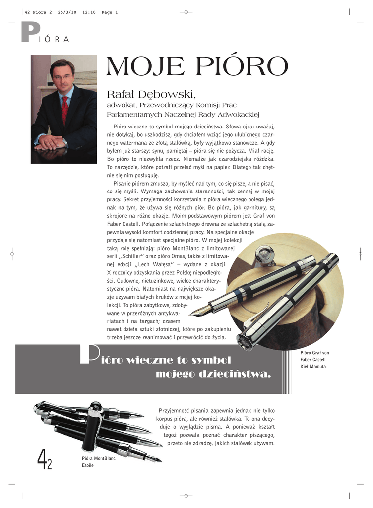 42 Piora 2 25/3/10 12:10 Page 1 P I Ó R A MOJE PIÓRO Rafa∏ D´bowski, adwokat, Przewodniczàcy Komisji Prac Parlamentarnych Naczelnej Rady Adwokackiej Pióro wieczne to symbol mojego dzieciƒstwa. S∏owa ojca: uwa˝aj, nie dotykaj, bo uszkodzisz, gdy chcia∏em wziàç jego ulubionego czarnego watermana ze z∏otà stalówkà, by∏y wyjàtkowo stanowcze. A gdy by∏em ju˝ starszy: synu, pami´taj – pióra si´ nie po˝ycza. Mia∏ racj´. Bo pióro to niezwyk∏a rzecz. Niemal˝e jak czarodziejska ró˝d˝ka. To narz´dzie, które potrafi przelaç myÊl na papier. Dlatego tak ch´tnie si´ nim pos∏uguj´. Pisanie piórem zmusza, by myÊleç nad tym, co si´ pisze, a nie pisaç, co si´ myÊli. Wymaga zachowania starannoÊci, tak cennej w mojej pracy. Sekret przyjemnoÊci korzystania z pióra wiecznego polega jednak na tym, ˝e u˝ywa si´ ró˝nych piór. Bo pióra, jak garnitury, sà skrojone na ró˝ne okazje. Moim podstawowym piórem jest Graf von Faber Castell. Po∏àczenie szlachetnego drewna ze szlachetnà stalà zapewnia wysoki komfort codziennej pracy. Na specjalne okazje przydaje si´ natomiast specjalne pióro. W mojej kolekcji takà rol´ spe∏niajà: pióro MontBlanc z limitowanej serii „Schiller” oraz pióro Omas, tak˝e z limitowanej edycji „Lech Wa∏´sa” – wydane z okazji X rocznicy odzyskania przez Polsk´ niepodleg∏oÊci. Cudowne, nietuzinkowe, wielce charakterystyczne pióra. Natomiast na najwi´ksze okazje u˝ywam bia∏ych kruków z mojej kolekcji. To pióra zabytkowe, zdobywane w przeró˝nych antykwariatach i na targach; czasem nawet dzie∏a sztuki z∏otniczej, które po zakupieniu trzeba jeszcze reanimowaç i przywróciç do ˝ycia. P ióro wieczne to symbol mojego dzieciƒstwa. PrzyjemnoÊç pisania zapewnia jednak nie tylko korpus pióra, ale równie˝ stalówka. To ona decyduje o wyglàdzie pisma. A poniewa˝ kszta∏t tego˝ pozwala poznaç charakter piszàcego, przeto nie zdradz´, jakich stalówek u˝ywam. 42 Pióra MontBlanc Etoile Pióro Graf von Faber Castell Kie∏ Mamuta