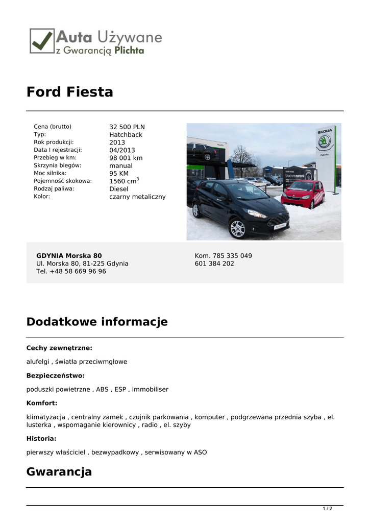 Ford Fiesta Cena (brutto) Typ: Rok produkcji: Data I rejestracji: Przebieg w km: Skrzynia biegów: Moc silnika: Pojemność skokowa: Rodzaj paliwa: Kolor: 32 500 PLN Hatchback 2013 04/2013 98 001 km manual 95 KM 1560 cm3 Diesel czarny metaliczny GDYNIA Morska 80 Ul. Morska 80, 81-225 Gdynia Tel. +48 58 669 96 96 Kom. 785 335 049 601 384 202 Dodatkowe informacje Cechy zewnętrzne: alufelgi , światła przeciwmgłowe Bezpieczeństwo: poduszki powietrzne , ABS , ESP , immobiliser Komfort: klimatyzacja , centralny zamek , czujnik parkowania , komputer , podgrzewana przednia szyba , el. lusterka , wspomaganie kierownicy , radio , el. szyby Historia: pierwszy właściciel , bezwypadkowy , serwisowany w ASO Gwarancja 1/2 Szanowni Państwo, Pragniemy Państwa poinformować, iż firma Plichta – Autoryzowany Dealer Škoda Auto prowadzi skup oraz sprzedaż samochodów używanych wszystkich marek, oferując także samochody używane z gwarancją objęte programem „Auta używane z Gwarancją Plichta”. W ramach programu „Auta Używane z Gwarancją Plichta ” każdy Klient otrzymuje atrakcyjny pakiet zniżek pozwalający zoptymalizować koszty eksploatacji samochodu: -50% na serwis klimatyzacji -50% na ustawienie zbieżności -50% na kosmetykę auta -50% na ścieżkę diagnostyczną -25% na wymiany oleju -25% na zakup opon + 5zł na sezon za hotelowanie opon -15% na części i akcesoria Oferujemy również kompleksową obsługę w zakresie finansowania i ubezpieczenia: - kredyty już od 4,99% - leasingi i kredyty bez zaświadczeń - uproszczone procedury – decyzja już od 30 min. - atrakcyjne pakiety AC/OC/NW/ASS wiodących firm ubezpieczeniowych Możliwość pozostawienia dotychczas użytkowanego auta w rozliczeniu – BEZPŁATNA WYCENA!!! Zapraszamy wszystkich Klientów na jazdę próbną wybranym autem. Numer oferty: B 188 Informacja nie stanowi oferty w rozumieniu art. 66 KC. Podane dane mają charakter wyłącznie informacyjny. 2/2 Powered by TCPDF (www.tcpdf.org)