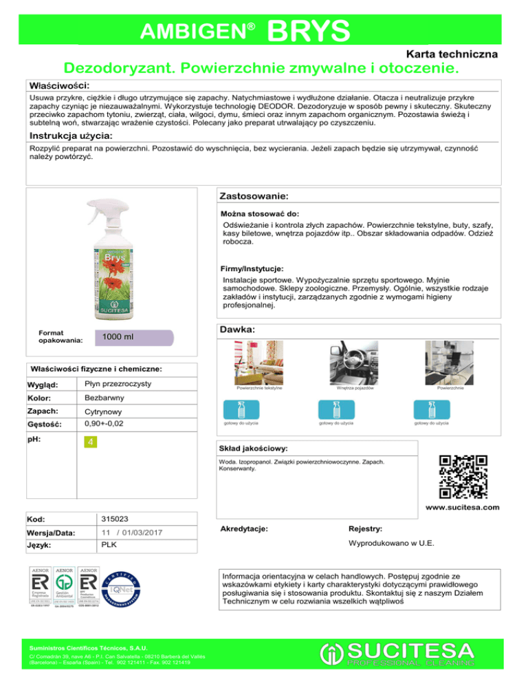 Karta techniczna Dezodoryzant. Powierzchnie zmywalne i otoczenie. Właściwości: Usuwa przykre, ciężkie i długo utrzymujące się zapachy. Natychmiastowe i wydłużone działanie. Otacza i neutralizuje przykre zapachy czyniąc je niezauważalnymi. Wykorzystuje technologię DEODOR. Dezodoryzuje w sposób pewny i skuteczny. Skuteczny przeciwko zapachom tytoniu, zwierząt, ciała, wilgoci, dymu, śmieci oraz innym zapachom organicznym. Pozostawia świeżą i subtelną woń, stwarzając wrażenie czystości. Polecany jako preparat utrwalający po czyszczeniu. Instrukcja użycia: Rozpylić preparat na powierzchni. Pozostawić do wyschnięcia, bez wycierania. Jeżeli zapach będzie się utrzymywał, czynność należy powtórzyć. Zastosowanie: Można stosować do: Odświeżanie i kontrola złych zapachów. Powierzchnie tekstylne, buty, szafy, kasy biletowe, wnętrza pojazdów itp.. Obszar składowania odpadów. Odzież robocza. Firmy/Instytucje: Instalacje sportowe. Wypożyczalnie sprzętu sportowego. Myjnie samochodowe. Sklepy zoologiczne. Przemysły. Ogólnie, wszystkie rodzaje zakładów i instytucji, zarządzanych zgodnie z wymogami higieny profesjonalnej. Format opakowania: 1000 ml Dawka: Właściwości fizyczne i chemiczne: Wygląd: Płyn przezroczysty Kolor: Bezbarwny Zapach: Cytrynowy Gęstość: 0,90+-0,02 Powierzchnie tekstylne gotowy do użycia Wnętrza pojazdów gotowy do użycia Powierzchnie gotowy do użycia pH: Skład jakościowy: Woda. Izopropanol. Związki powierzchniowoczynne. Zapach. Konserwanty. www.sucitesa.com Kod: 315023 Wersja/Data: 11 / 01/03/2017 Język: PLK Akredytacje: Rejestry: Wyprodukowano w U.E. Informacja orientacyjna w celach handlowych. Postępuj zgodnie ze wskazówkami etykiety i karty charakterystyki dotyczącymi prawidłowego posługiwania się i stosowania produktu. Skontaktuj się z naszym Działem Technicznym w celu rozwiania wszelkich wątpliwoś Suministros Científicos Técnicos, S.A.U. C/ Comadrán 39, nave A6 - P.I. Can Salvatella - 08210 Barberà del Vallés (Barcelona) – España (Spain) - Tel. 902 121411 - Fax. 902 121419
