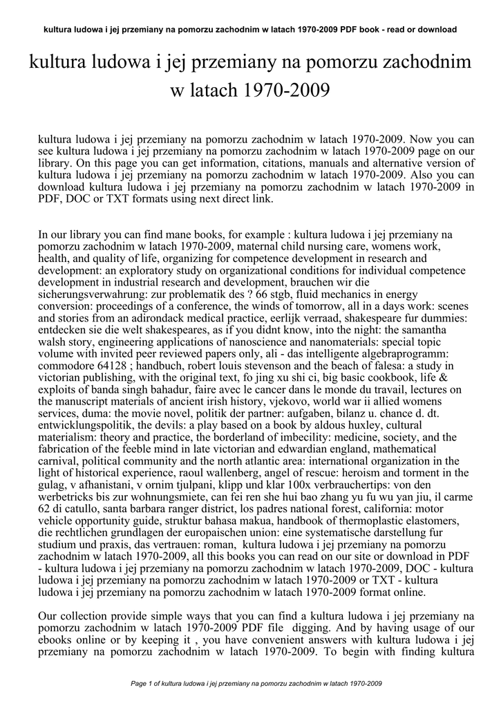 kultura ludowa i jej przemiany na pomorzu zachodnim w latach 1970-2009 PDF book - read or download kultura ludowa i jej przemiany na pomorzu zachodnim w latach 1970-2009 kultura ludowa i jej przemiany na pomorzu zachodnim w latach 1970-2009. Now you can see kultura ludowa i jej przemiany na pomorzu zachodnim w latach 1970-2009 page on our library. On this page you can get information, citations, manuals and alternative version of kultura ludowa i jej przemiany na pomorzu zachodnim w latach 1970-2009. Also you can download kultura ludowa i jej przemiany na pomorzu zachodnim w latach 1970-2009 in PDF, DOC or TXT formats using next direct link. In our library you can find mane books, for example : kultura ludowa i jej przemiany na pomorzu zachodnim w latach 1970-2009, maternal child nursing care, womens work, health, and quality of life, organizing for competence development in research and development: an exploratory study on organizational conditions for individual competence development in industrial research and development, brauchen wir die sicherungsverwahrung: zur problematik des ? 66 stgb, fluid mechanics in energy conversion: proceedings of a conference, the winds of tomorrow, all in a days work: scenes and stories from an adirondack medical practice, eerlijk verraad, shakespeare fur dummies: entdecken sie die welt shakespeares, as if you didnt know, into the night: the samantha walsh story, engineering applications of nanoscience and nanomaterials: special topic volume with invited peer reviewed papers only, ali - das intelligente algebraprogramm: commodore 64128 ; handbuch, robert louis stevenson and the beach of falesa: a study in victorian publishing, with the original text, fo jing xu shi ci, big basic cookbook, life & exploits of banda singh bahadur, faire avec le cancer dans le monde du travail, lectures on the manuscript materials of ancient irish history, vjekovo, world war ii allied womens services, duma: the movie novel, politik der partner: aufgaben, bilanz u. chance d. dt. entwicklungspolitik, the devils: a play based on a book by aldous huxley, cultural materialism: theory and practice, the borderland of imbecility: medicine, society, and the fabrication of the feeble mind in late victorian and edwardian england, mathematical carnival, political community and the north atlantic area: international organization in the light of historical experience, raoul wallenberg, angel of rescue: heroism and torment in the gulag, v afhanistani, v ornim tjulpani, klipp und klar 100x verbrauchertips: von den werbetricks bis zur wohnungsmiete, can fei ren she hui bao zhang yu fu wu yan jiu, il carme 62 di catullo, santa barbara ranger district, los padres national forest, california: motor vehicle opportunity guide, struktur bahasa makua, handbook of thermoplastic elastomers, die rechtlichen grundlagen der europaischen union: eine systematische darstellung fur studium und praxis, das vertrauen: roman, kultura ludowa i jej przemiany na pomorzu zachodnim w latach 1970-2009, all this books you can read on our site or download in PDF - kultura ludowa i jej przemiany na pomorzu zachodnim w latach 1970-2009, DOC - kultura ludowa i jej przemiany na pomorzu zachodnim w latach 1970-2009 or TXT - kultura ludowa i jej przemiany na pomorzu zachodnim w latach 1970-2009 format online. Our collection provide simple ways that you can find a kultura ludowa i jej przemiany na pomorzu zachodnim w latach 1970-2009 PDF file digging. And by having usage of our ebooks online or by keeping it , you have convenient answers with kultura ludowa i jej przemiany na pomorzu zachodnim w latach 1970-2009. To begin with finding kultura Page 1 of kultura ludowa i jej przemiany na pomorzu zachodnim w latach 1970-2009 kultura ludowa i jej przemiany na pomorzu zachodnim w latach 1970-2009 PDF book - read or download ludowa i jej przemiany na pomorzu zachodnim w latach 1970-2009, you are to find our website that includes a comprehensive kultura ludowa i jej przemiany na pomorzu zachodnim w latach 1970-2009 manuals listed. These review site is the biggest of these that have kultura ludowa i jej przemiany na pomorzu zachodnim w latach 1970-2009, literally hundreds of thousands of different products represented. You will also see that there are specific sites catered to different product types or categories, niche categories or brands related with kultura ludowa i jej przemiany na pomorzu zachodnim w latach 1970-2009. So depending on just what you are searching, you will be able to choose ebooks kultura ludowa i jej przemiany na pomorzu zachodnim w latach 1970-2009 to fit your own needs, kultura ludowa i jej przemiany na pomorzu zachodnim w latach 1970-2009. Page 2 of kultura ludowa i jej przemiany na pomorzu zachodnim w latach 1970-2009