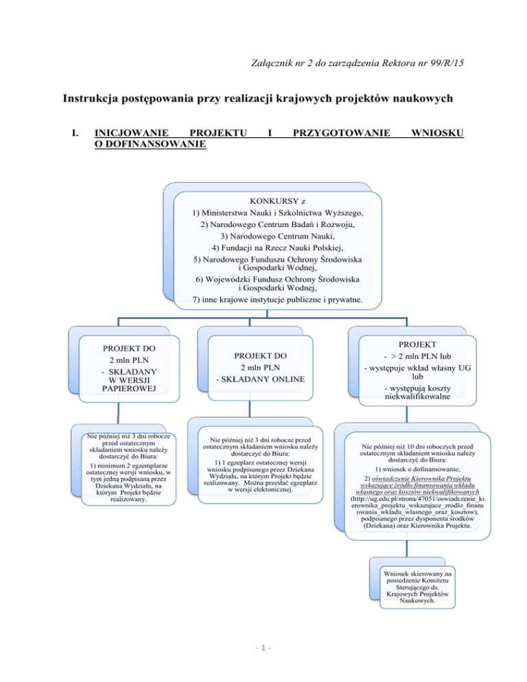 Załącznik nr 2 do zarządzenia Rektora nr 99/R/15 Instrukcja postępowania przy realizacji krajowych projektów naukowych I. INICJOWANIE PROJEKTU O DOFINANSOWANIE I PRZYGOTOWANIE WNIOSKU KONKURSY z 1) Ministerstwa Nauki i Szkolnictwa Wyższego, 2) Narodowego Centrum Badań i Rozwoju, 3) Narodowego Centrum Nauki, 4) Fundacji na Rzecz Nauki Polskiej, 5) Narodowego Funduszu Ochrony Środowiska i Gospodarki Wodnej, 6) Wojewódzki Fundusz Ochrony Środowiska i Gospodarki Wodnej, 7) inne krajowe instytucje publiczne i prywatne. PROJEKT DO 2 mln PLN - SKŁADANY W WERSJI PAPIEROWEJ PROJEKT DO 2 mln PLN - SKŁADANY ONLINE Nie później niż 3 dni robocze przed ostatecznym składaniem wniosku należy dostarczyć do Biura: 1) minimum 2 egzemplarze ostatecznej wersji wniosku, w tym jedną podpisaną przez Dziekana Wydziału, na którym Projekt będzie realizowany. Nie później niż 3 dni robocze przed ostatecznym składaniem wniosku należy dostarczyć do Biura: 1) 1 egzeplarz ostatecznej wersji wniosku podpisanego przez Dziekana Wydziału, na którym Projekt będzie realizowany. Można przesłać egzeplarz w wersji elektonicznej. PROJEKT - > 2 mln PLN lub - występuje wkład własny UG lub - występują koszty niekwalifikowalne Nie później niż 10 dni roboczych przed ostatecznym składaniem wniosku należy dostarczyć do Biura: 1) wniosek o dofinansowanie; 2) oświadczenie Kierownika Projektu wskazujące źródło finansowania wkładu własnego oraz kosztów niekwalifikowanych (http://ug.edu.pl/strona/47051/oswiadczenie_ki erownika_projektu_wskazujace_zrodlo_finans owania_wkladu_wlasnego_oraz_kosztow), podpisanego przez dysponenta środków (Dziekana) oraz Kierownika Projektu. Wniosek skierowany na posiedzenie Komitetu Sterującego ds. Krajowych Projektów Naukowych. -1- II. DECYZJA O UZYSKANIU DOFINANSOWANIA 1. Biuro powiadamia Kierownika Projektu o decyzji w sprawie finansowania (zarówno pozytywnej jak i negatywnej). Biuro organizuje spotkania z Kierownikami Projektów, które uzyskały pozytywne decyzje o dofinansowaniu w celu omówienia zasad postępowania przy realizacji projektów naukowych w UG, w szczególności porusza następujące tematy: 1) Współpracy z Działem Zamówień Publicznych Tryb udzielania zamówień wynikających z harmonogramu realizacji projektu, procedura wszczęcia postępowania o udzielanie zamówienia publicznego i inne. Harmonogram Realizacji Projektu (http://ug.edu.pl/strona/47056/harmonogram_realizacji_projektu). 2) Obsługa księgowo-finansowej Opracowanie faktur, obieg dokumentów finansowych, opiekunowie projektów i inne. Przykładowy wzór opracowywania dokumentów księgowych (faktur oraz innych dokumentów o równoważnej wartości dowodowej) (http://ug.edu.pl/strona/47057/przykladowy_wzor_opracowywania_faktur). 3) Prefinansowanie projektu Możliwość prefinansowania. Wniosek do Prorektora ds. Rozwoju i Finansów o prefinansowanie Projektu ze środków własnych UG (http://ug.edu.pl/strona/47059/wniosek_do_prorektora_ds_rozwoju_i_finansow_o_ prefinansowanie_projektu_srodkow_wlasnych_ug). 2. W przypadku konkursów, których beneficjentem jest osoba fizyczna oryginał promesy finansowania przychodzi na adres osoby fizycznej podany we wniosku. Po otrzymaniu promesy finansującej lub innego dokumentu informującego o przyznaniu dofinansowania Projektu, Kierownik Projektu zobowiązany jest do niezwłocznego przekazania jej oryginału do Biura w celu uzyskania oświadczenia Kierownika Jednostki o gotowości zatrudnienia w projekcie. III. PODPISANIE UMOWY O DOFINANSOWANIE 1. Kierownik Projektu we współpracy z Biurem rozpoczyna procedurę podpisania umowy o dofinansowanie Projektu. Biuro wraz z Kierownikiem Projektu kompletuje wszystkie niezbędne załączniki lub zleca ich przygotowanie właściwym jednostkom. 2. W przypadku konieczności otwarcia wyodrębnionego rachunku bankowego należy wypełnić Wniosek o otwarcie wyodrębnionego rachunku bankowego (http://ug.edu.pl/strona/47060/wniosek_o_otwarcie_wyodrebnionego_rachunku_bank owego) i dostarczyć go do Biura. 3. Przykładowe wzory umowy konsorcjum i porozumienia o poufności znajdują się na stronie Biura Zarządzania Krajowymi Projektami Naukowymi (http://ug.edu.pl/strona/47061/przykladowe_wzory_umowy_konsorcjum; http://ug.edu.pl/strona/47494/porozumienie_o_poufnosci). -2- 4. Kierownicy Projektów, którzy otrzymali dofinansowanie z NCBR powinni wypełnić i dostarczyć do Biura Oświadczenie o kwalifikowalności VAT (http://ug.edu.pl/strona/47063/oswiadczenie_o_kwalifikowalnosci_vat). IV. REALIZACJA PROJEKTU 1. Dokumenty związane z realizacją Projektu do momentu oddania ich do archiwizacji, przechowywane są w następujący sposób: 1) w Biurze znajdują się: a) oryginały wniosku o dofinansowanie Projektu wraz z załącznikami; b) oryginał decyzji o przyznaniu dofinansowania; c) oryginały umów o dofinansowanie, umów partnerskich wraz z aneksami; d) oryginały dokumentacji rozliczeniowej/finansowej sporządzone przez Kierownika Projektu: (wnioski o płatność, raporty i sprawozdania finansowe); e) oryginały dokumentacji związanej z kontrolami przeprowadzonymi w ramach Projektu; 2) u Kierownika Projektu znajdują się: a) oryginały korespondencji związanej z realizacją Projektu; b) oryginały dokumentacji merytorycznej oraz technicznej; c) oryginały dokumentacji związanej z udzieleniem zamówień publicznych wyłączonych ze stosowania ustawy Prawo Zamówień Publicznych w oparciu o art. 4 pkt 3 lit e oraz art. 4 pkt 8; d) oryginały innych dokumentów Projektu, niewymienionych w Regulaminie; e) dokumenty związane z ochroną praw autorskich i związane z komercjalizacją zgodnie z wytycznymi Regulaminu zarządzania prawami autorskimi i prawami pokrewnymi, prawami własności przemysłowej oraz zasad komercjalizacji wyników badań naukowych i prac rozwojowych Uniwersytetu Gdańskiego f) kopie faktur 3) w Dziale Zamówień Publicznych znajdują się oryginały dokumentacji postępowa